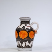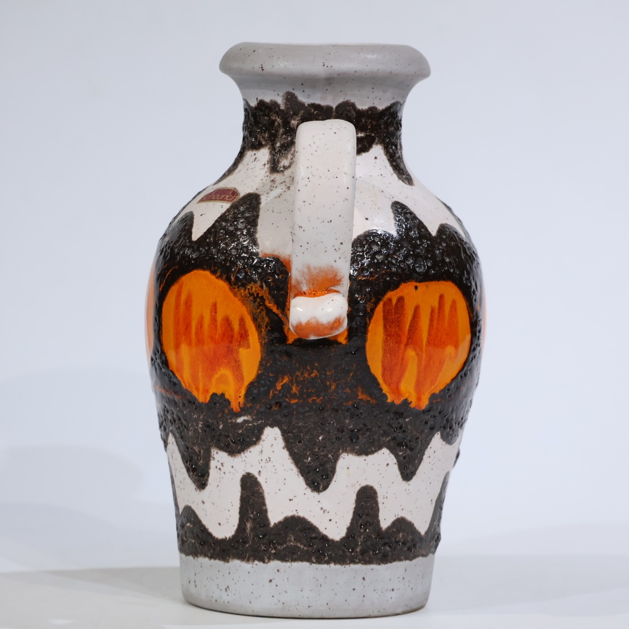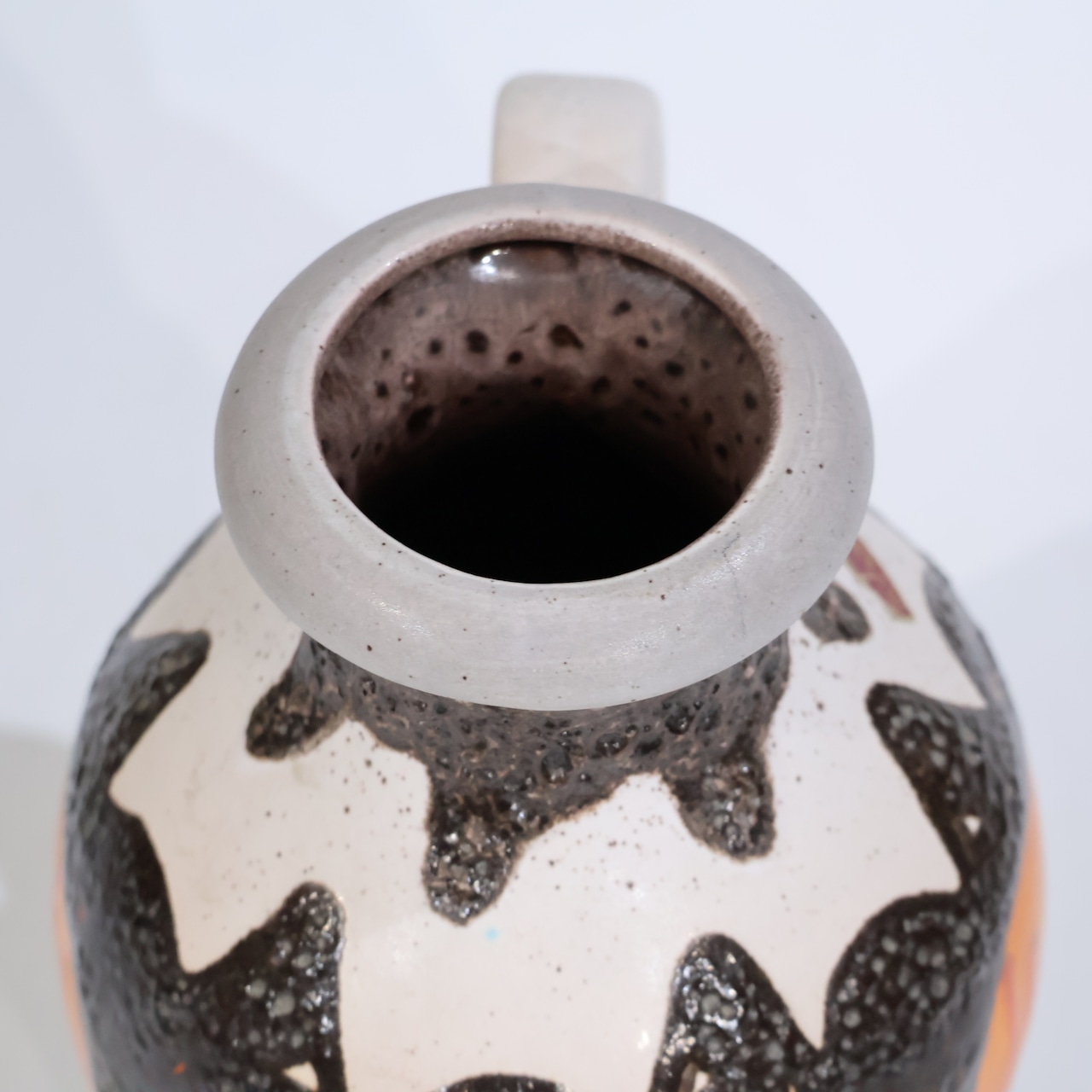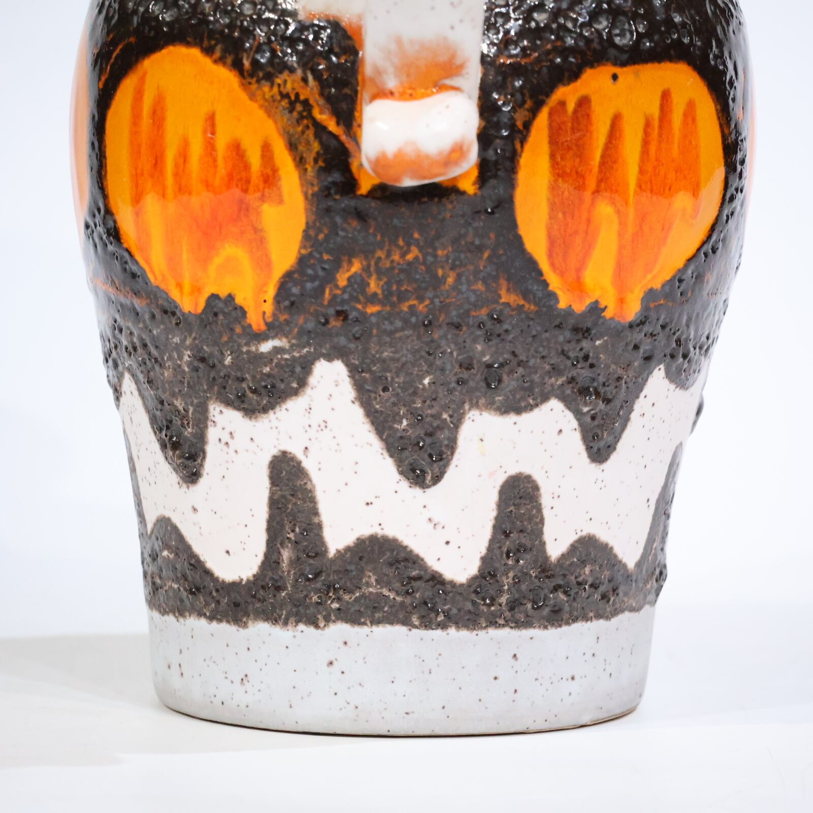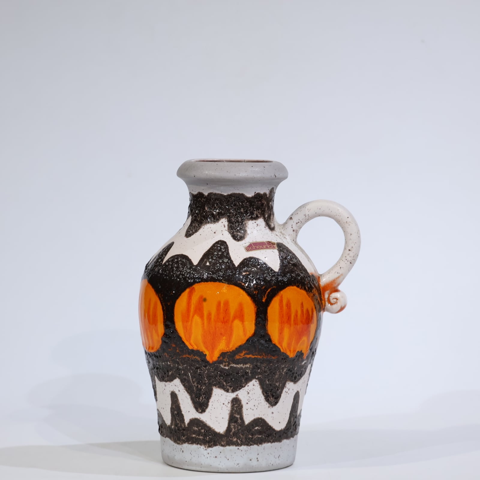 アイボリーの素地に、黒く火山のように盛り上がる溶岩釉と、オレンジのフレイムモチーフが連なる印象的な装飾が特徴です。特に胴部の丸く膨らんだシルエットと、持ち手先端のくるりと巻いた装飾が愛らしく、Scheurichらしい遊び心が感じられます。