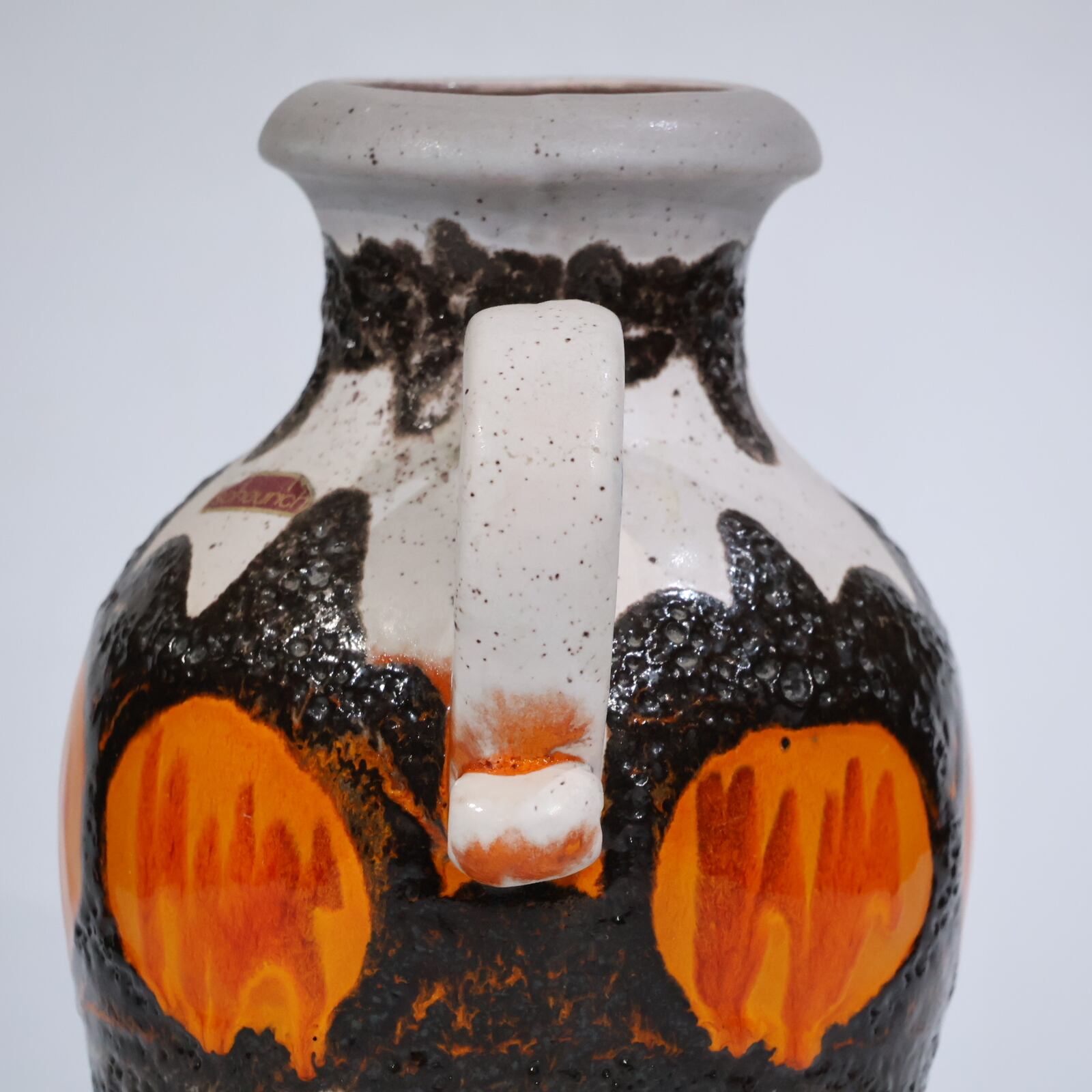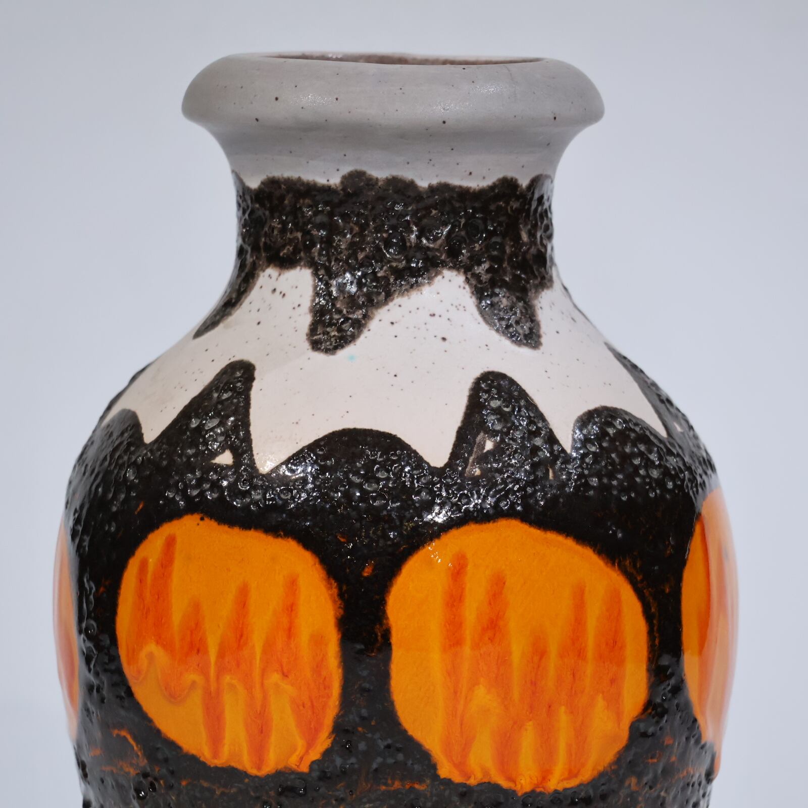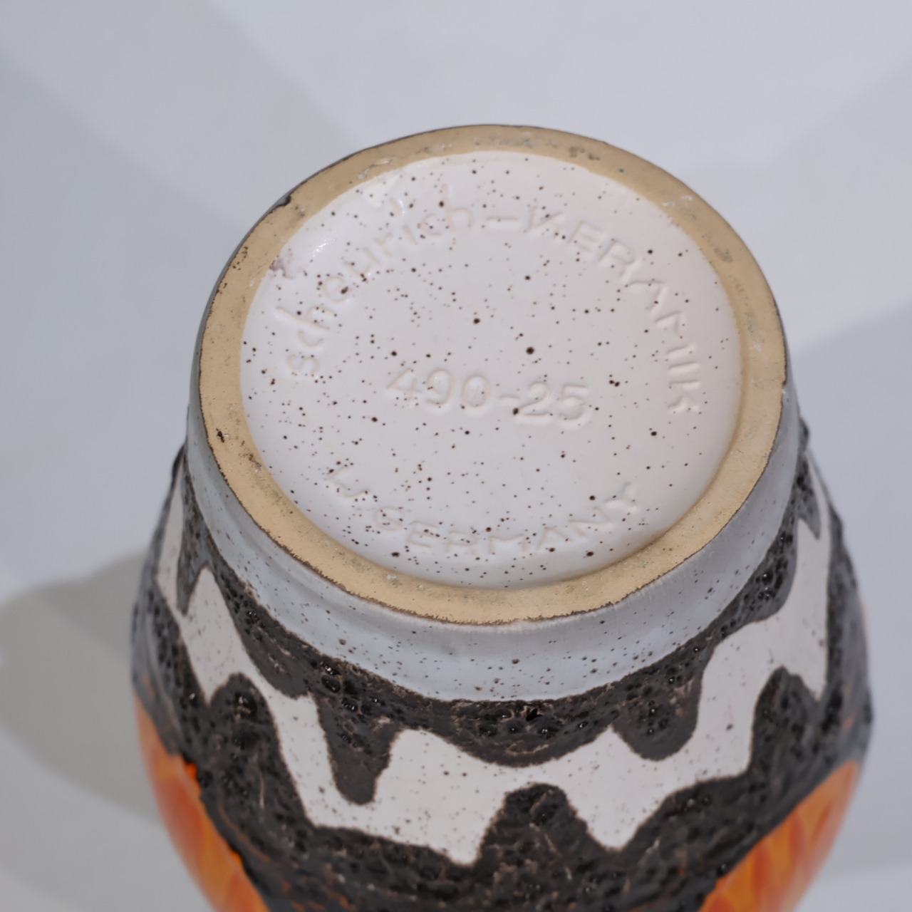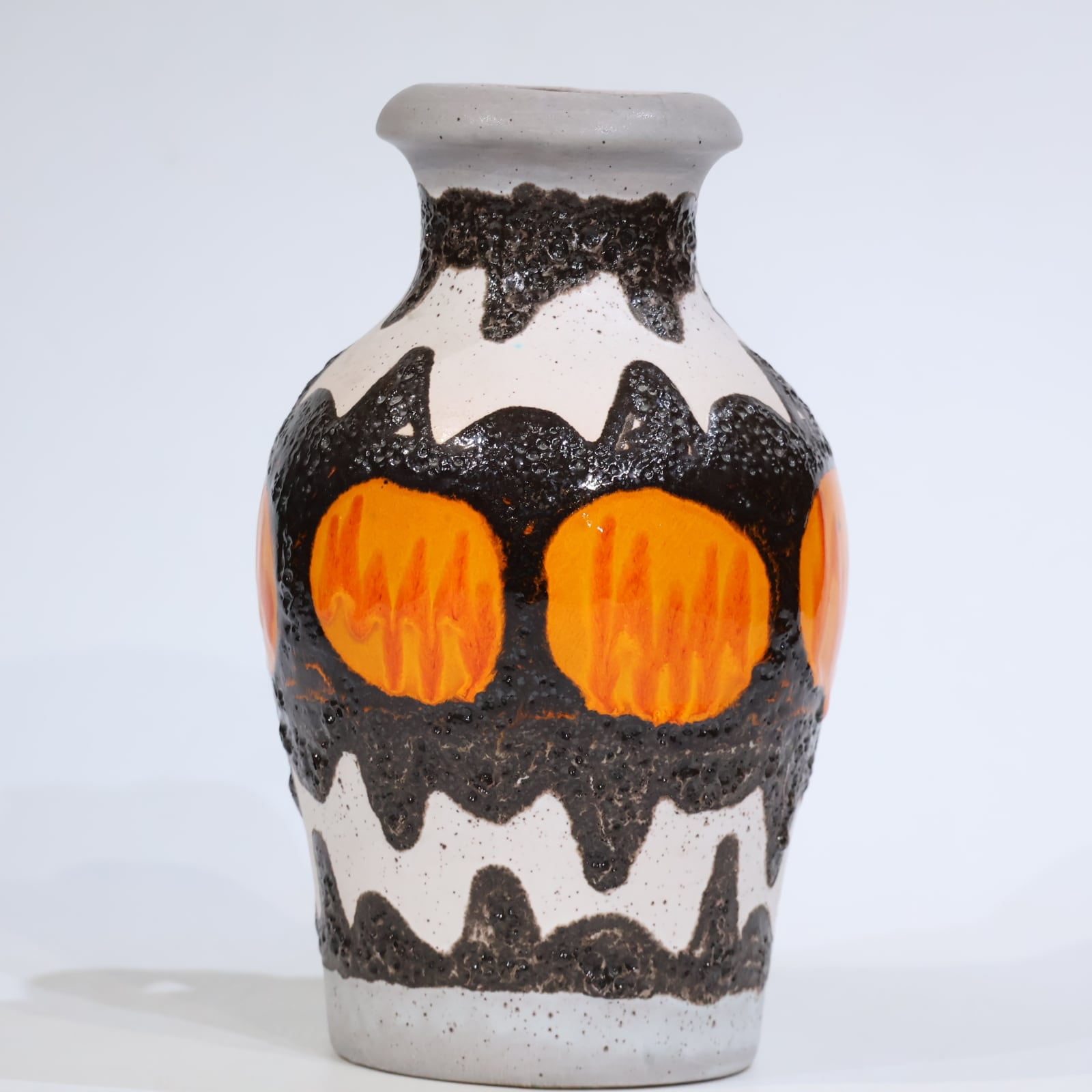 アイボリーの素地に、黒く火山のように盛り上がる溶岩釉と、オレンジのフレイムモチーフが連なる印象的な装飾が特徴です。特に胴部の丸く膨らんだシルエットと、持ち手先端のくるりと巻いた装飾が愛らしく、Scheurichらしい遊び心が感じられます。