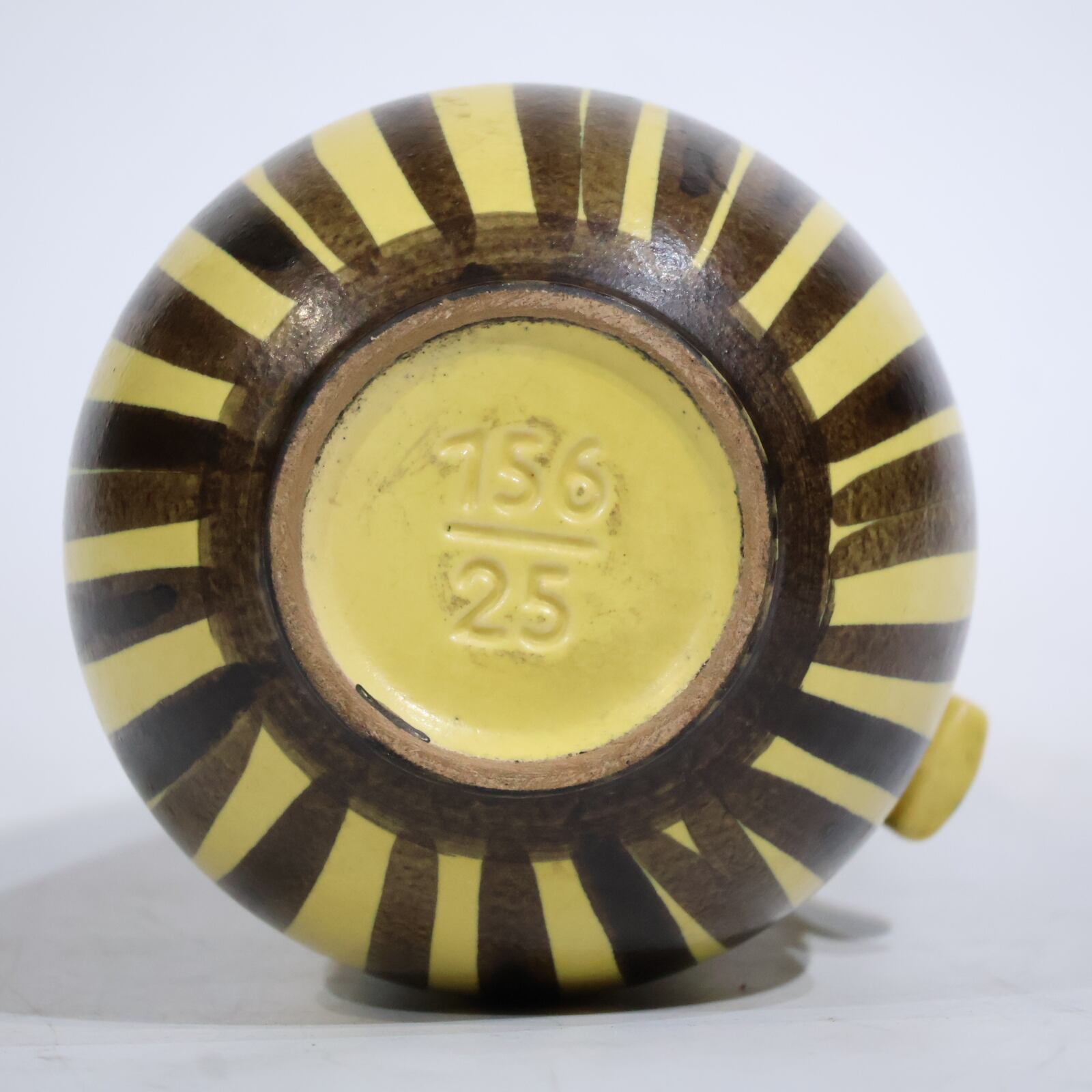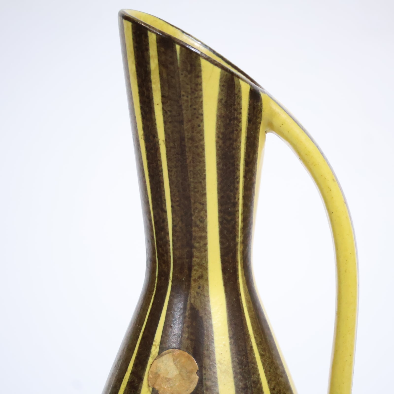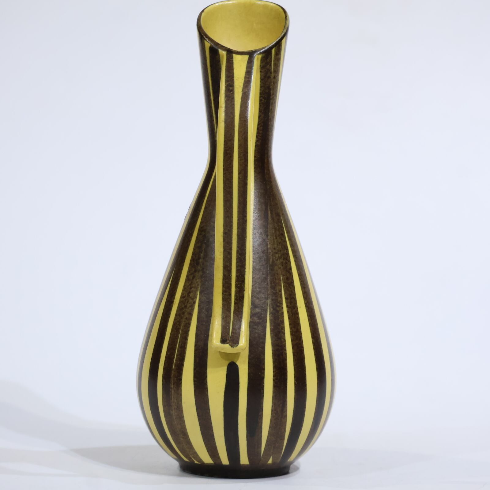 表面は、明るいイエローのストライプの地に、ややマットな質感を持つ濃茶が垂直に配置されており、手描きと思われる線の揺らぎがリズムを生んでいます。幾何学的でありながら機械的にはなりすぎず、50年代のモダンデザインの文脈を感じさせる仕上がりです。