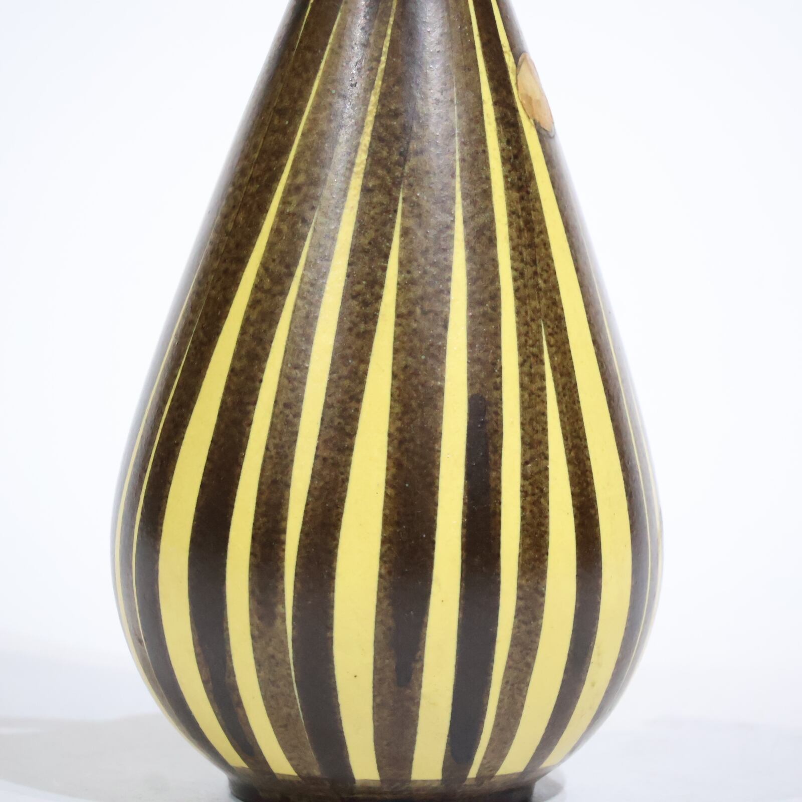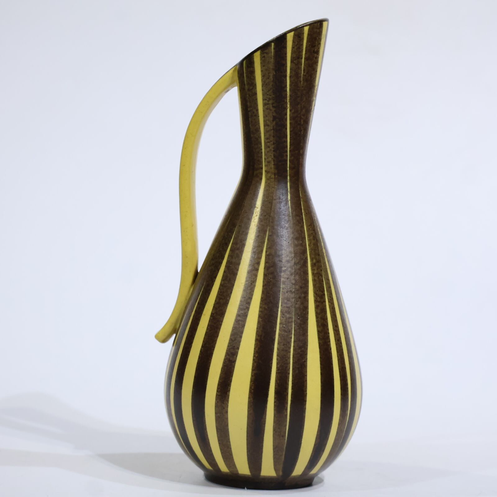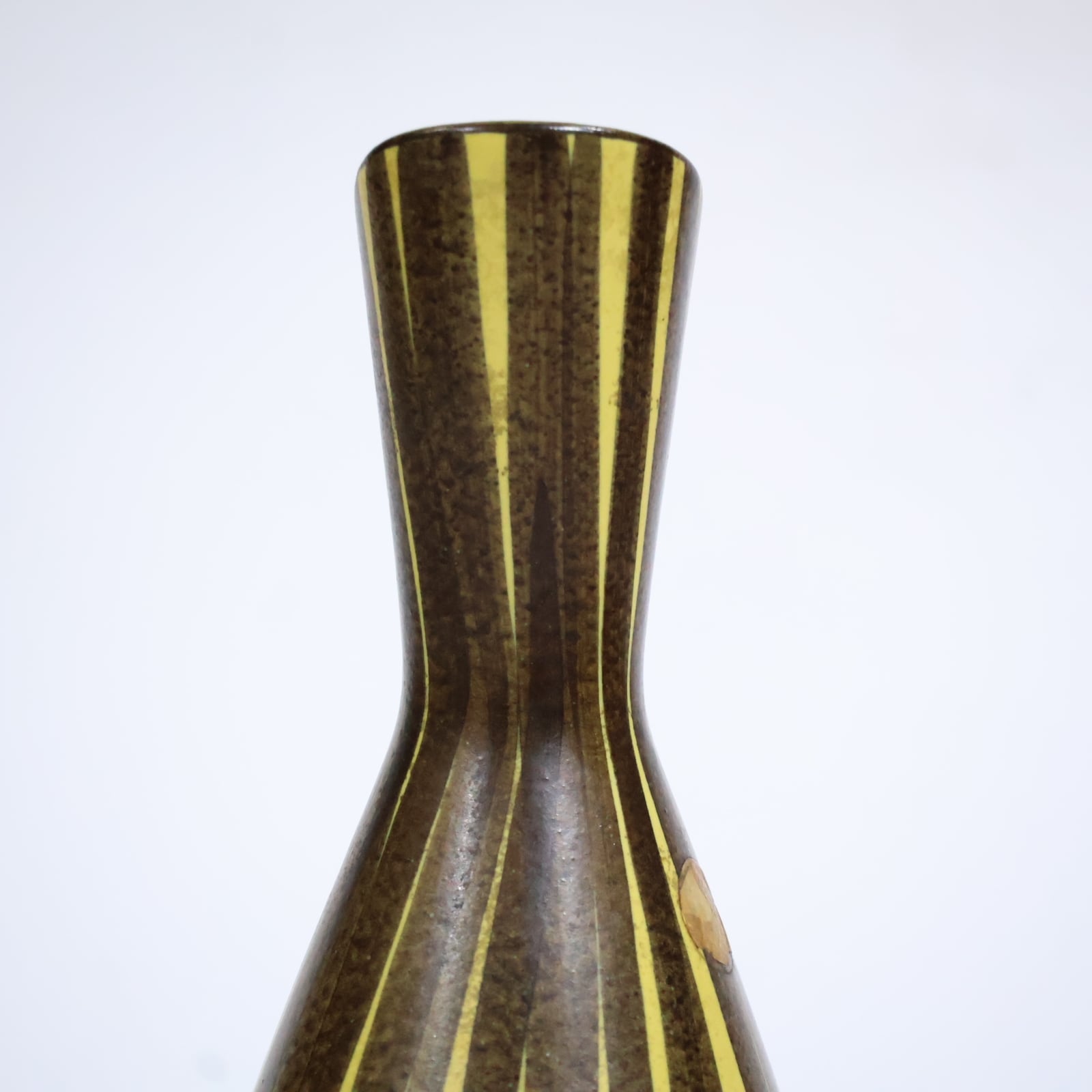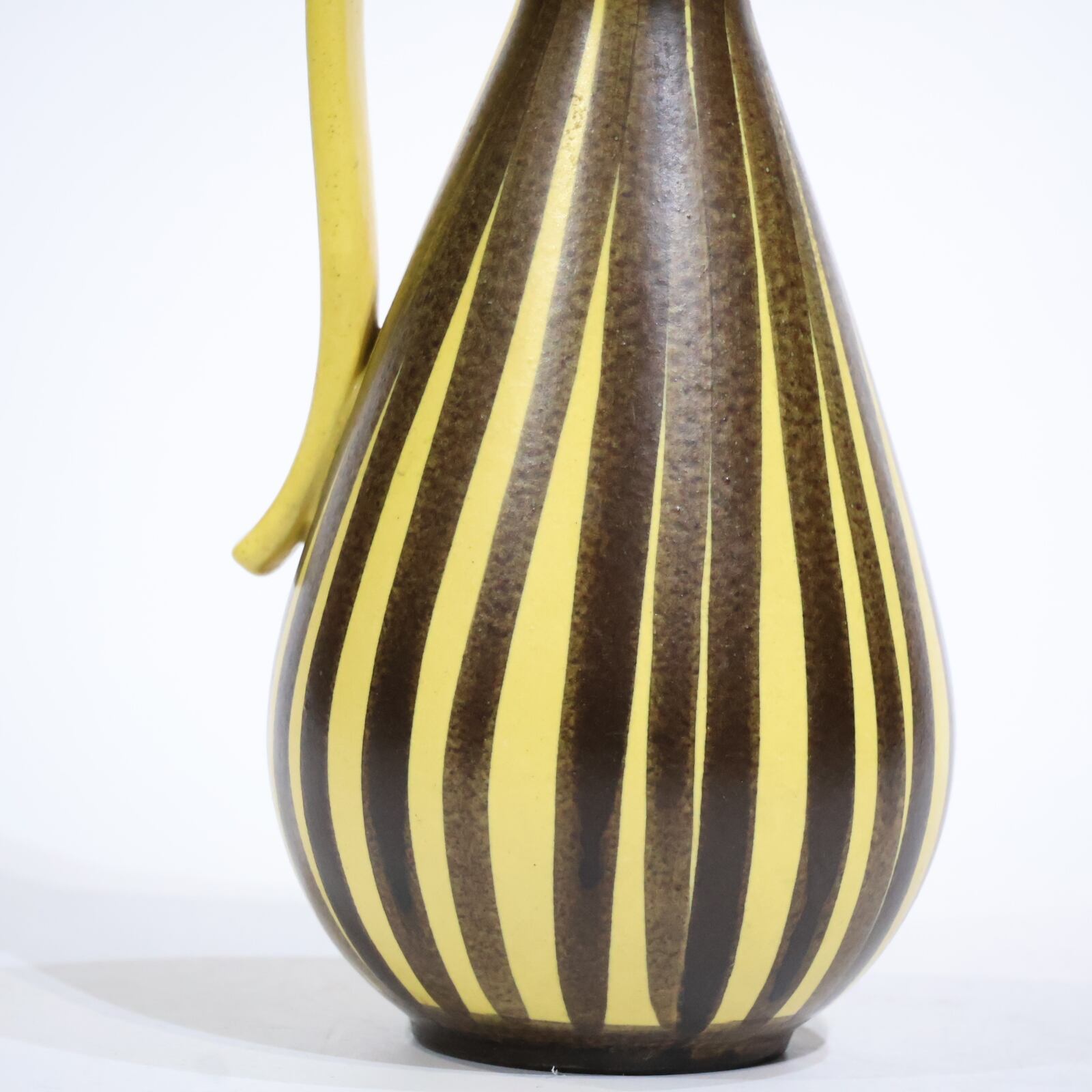 表面は、明るいイエローのストライプの地に、ややマットな質感を持つ濃茶が垂直に配置されており、手描きと思われる線の揺らぎがリズムを生んでいます。幾何学的でありながら機械的にはなりすぎず、50年代のモダンデザインの文脈を感じさせる仕上がりです。