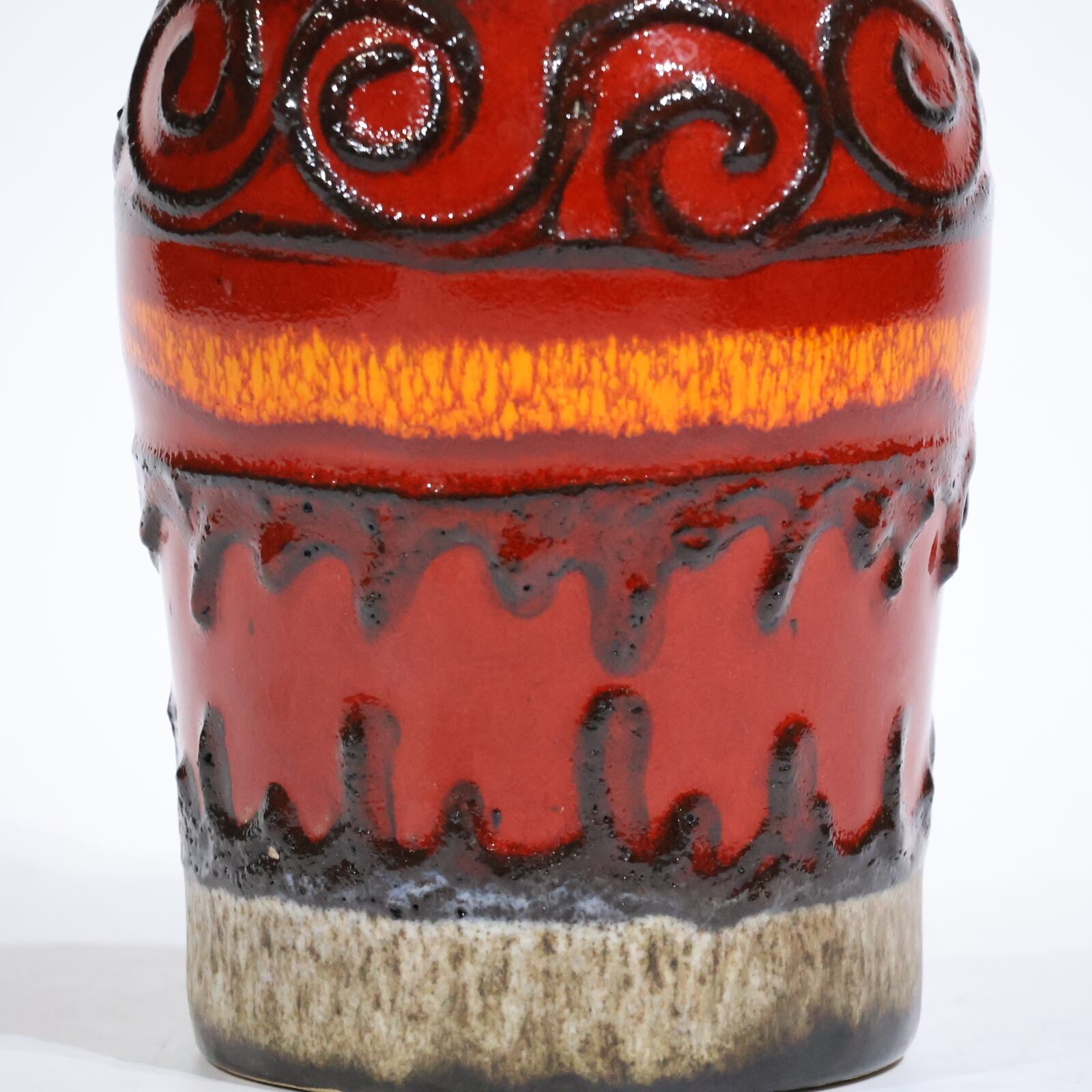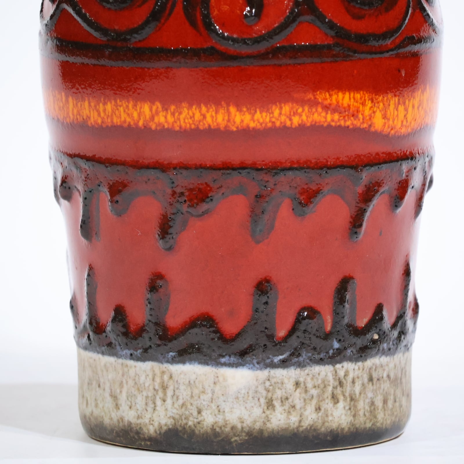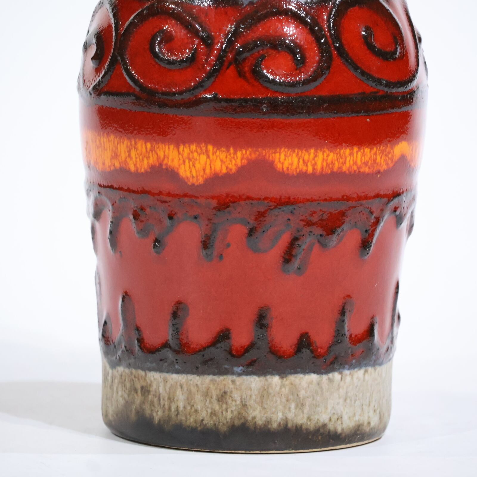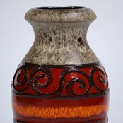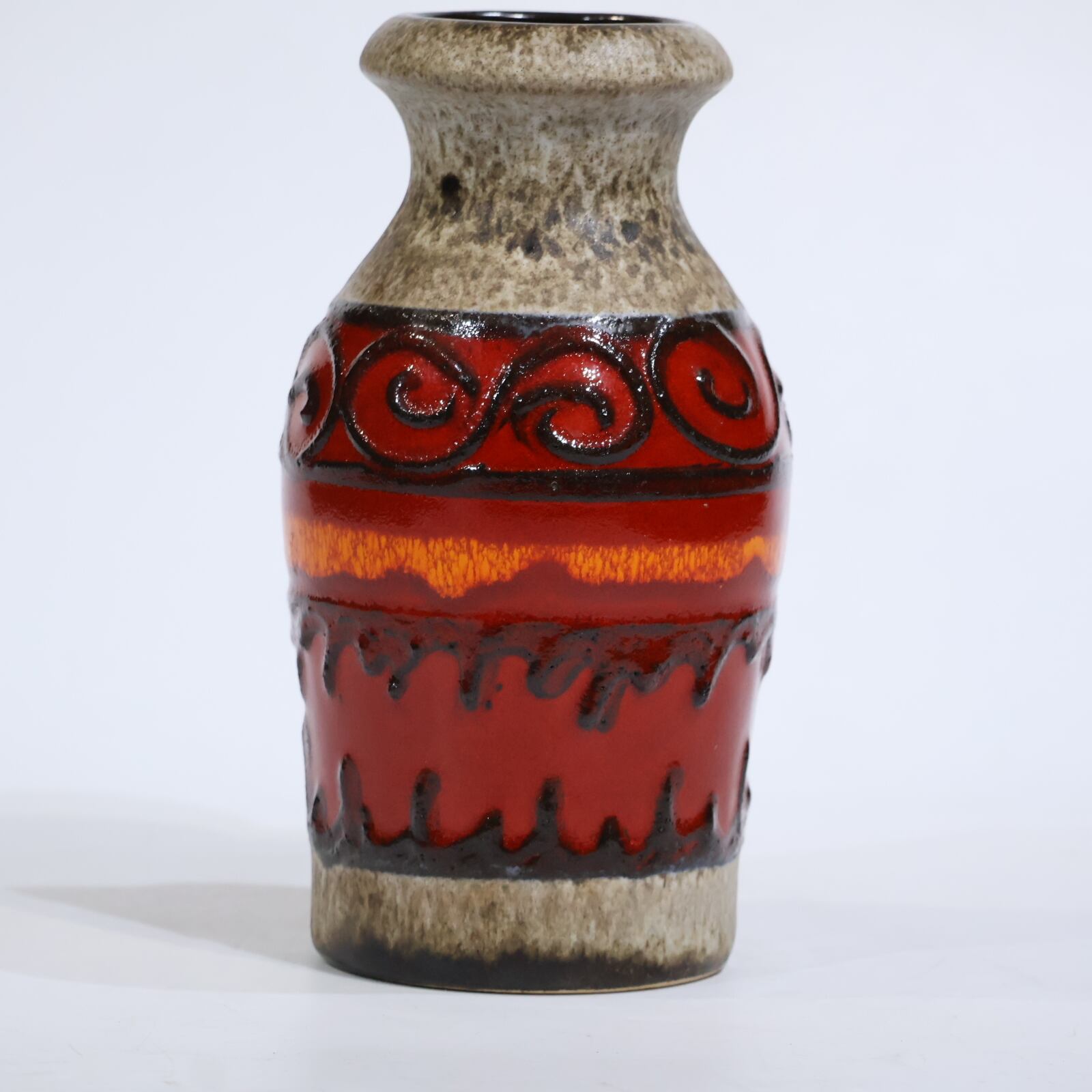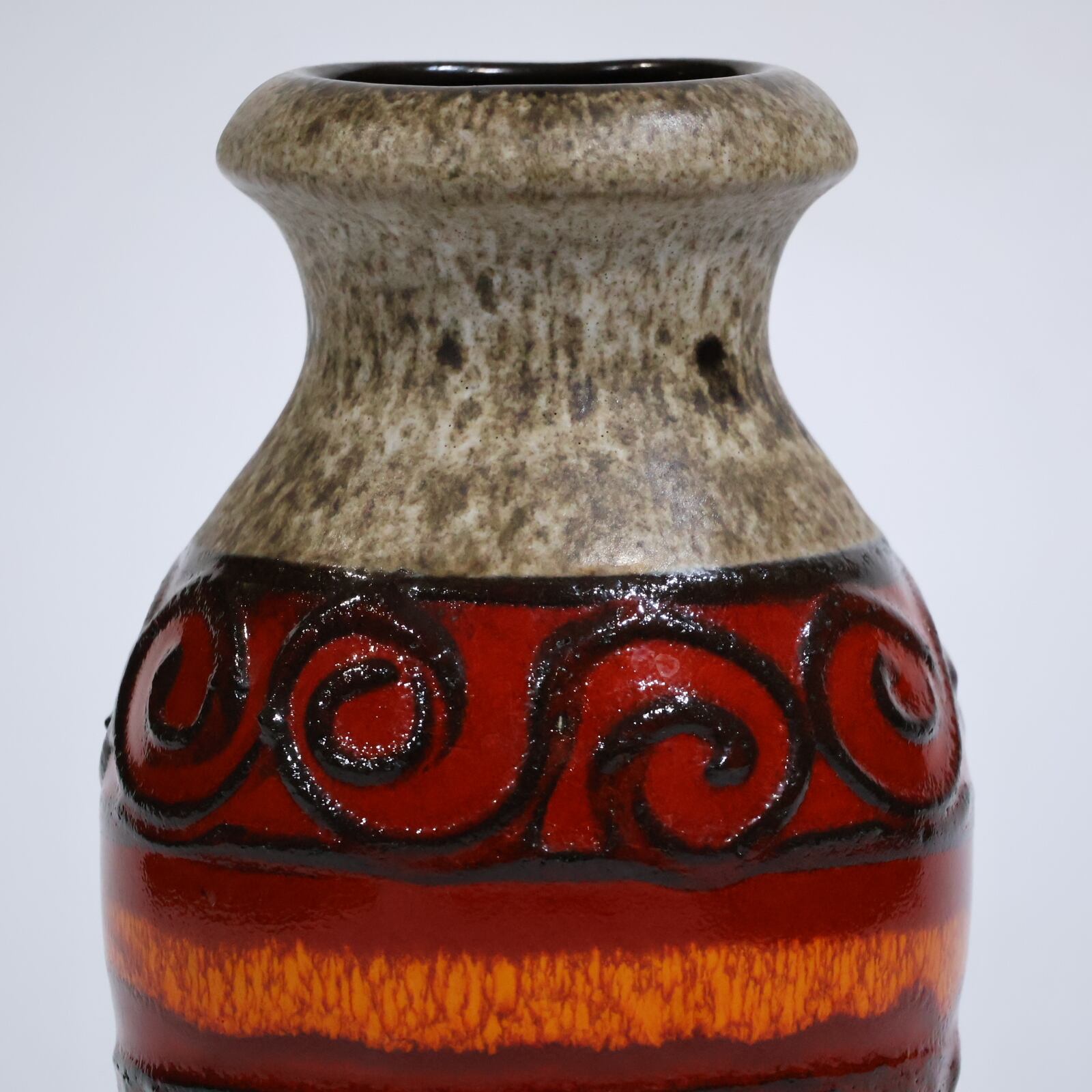 同社は急速に成長し、1950~80年代には陶 器製造の分野でドイツ最大のメーカーとなり、今日も確固たる地位を維持しています。形状に加えて釉薬でも、当時は最も幅広い品揃えを誇った他、輸出量も最大だったため、現在でも同社の製品はよく見られます。特に円筒形を基調にし たシンプルな形状で、型押し模様のある床置き 花瓶が代表的。色彩については当時主流だっ た赤やオレンジから、クリーム、ベージュ、茶色 などが多くを占めています。