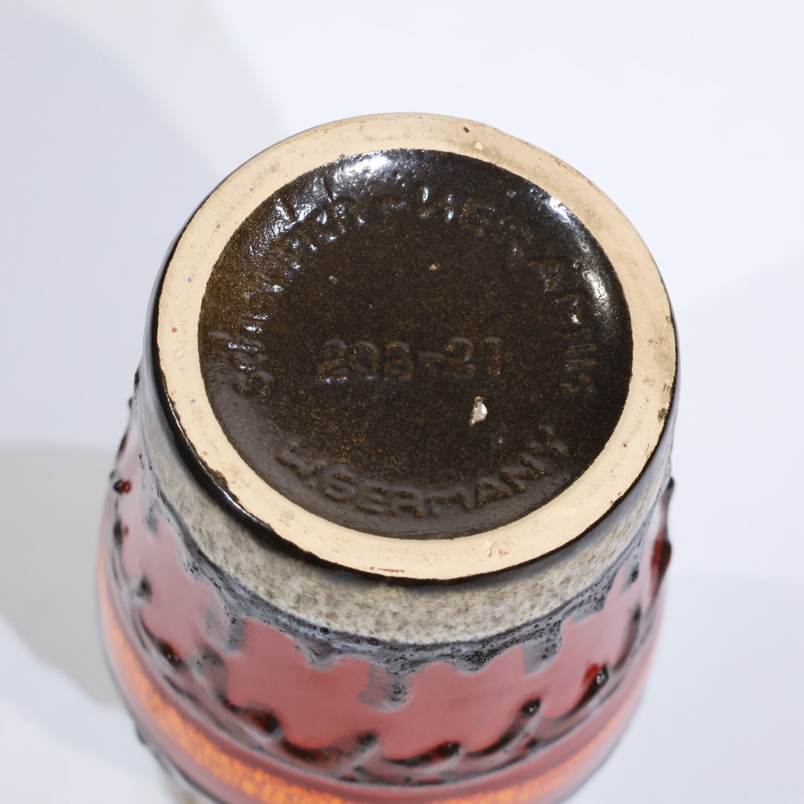 Scheurichの製品には白い粘土が使われて おり、マークは型押しされています。マークには3 ~4桁の型番、その後ハイフンに続いてセンチ メートル単位でのサイズと「W.GERMANY」の表 記があり、底の縁に沿って半円形にマークが型 押しされている場合が多い。その他のマークが 型押しされているのは後期の作品である。品質 は高水準で安定しており、多くの型が同じフォ ルムでさまざまな装飾パターンを展開しているため、同一の型で数多くの作品を揃えるコレク ターも少なくないです。