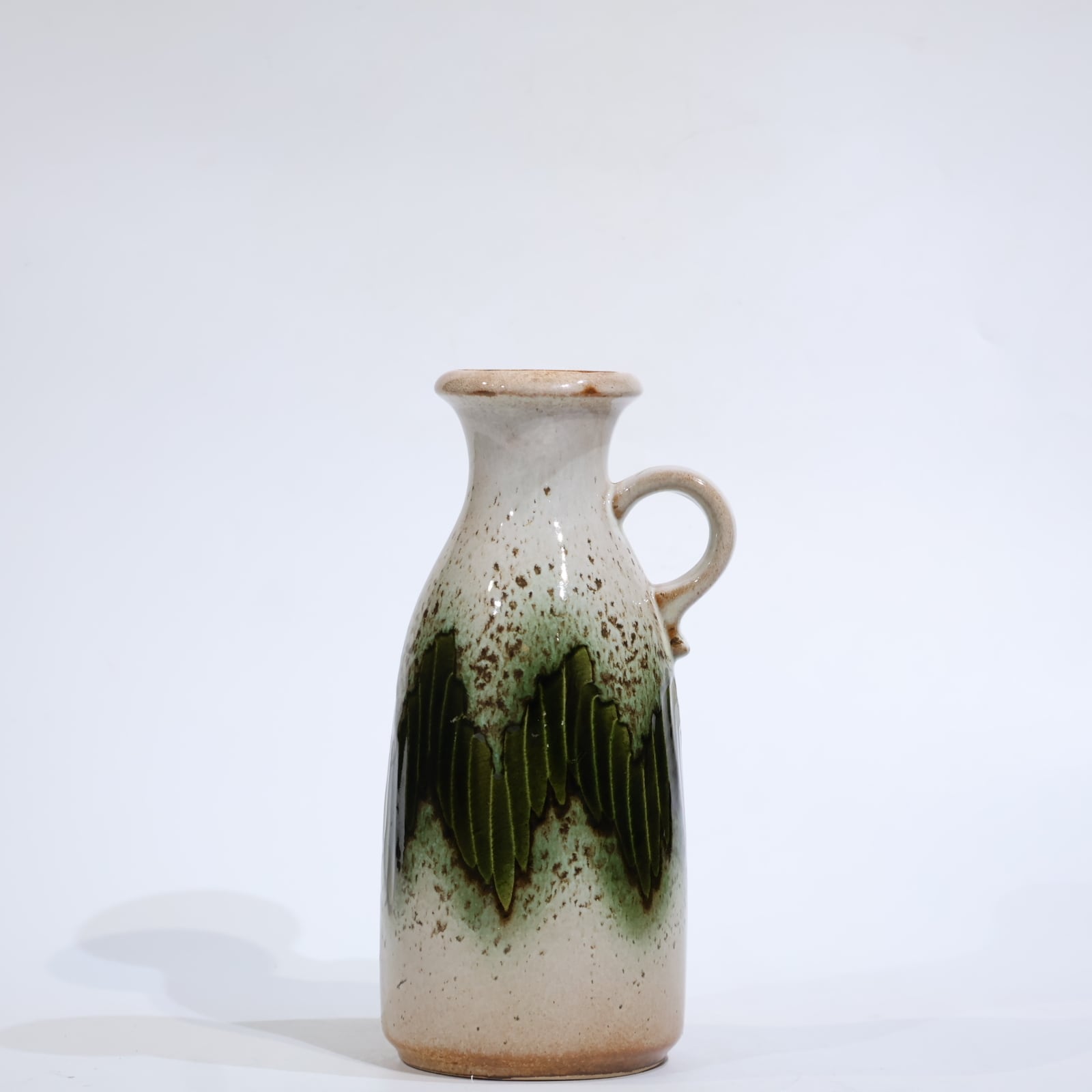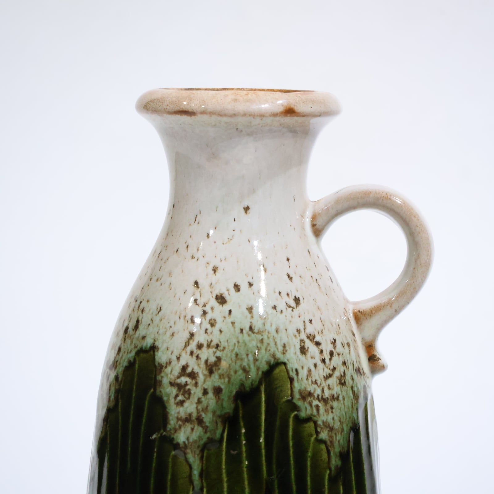 同社は急速に成長し、1950~80年代には陶 器製造の分野でドイツ最大のメーカーとなり、今日も確固たる地位を維持しています。形状に加えて釉薬でも、当時は最も幅広い品揃えを誇った他、輸出量も最大だったため、現在でも同社の製品はよく見られます。特に円筒形を基調にし たシンプルな形状で、型押し模様のある床置き 花瓶が代表的。色彩については当時主流だっ た赤やオレンジから、クリーム、ベージュ、茶色 などが多くを占めています。