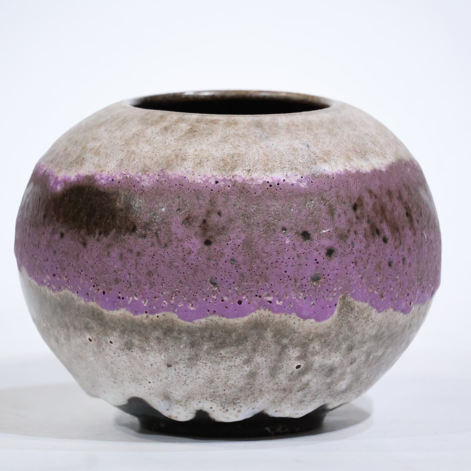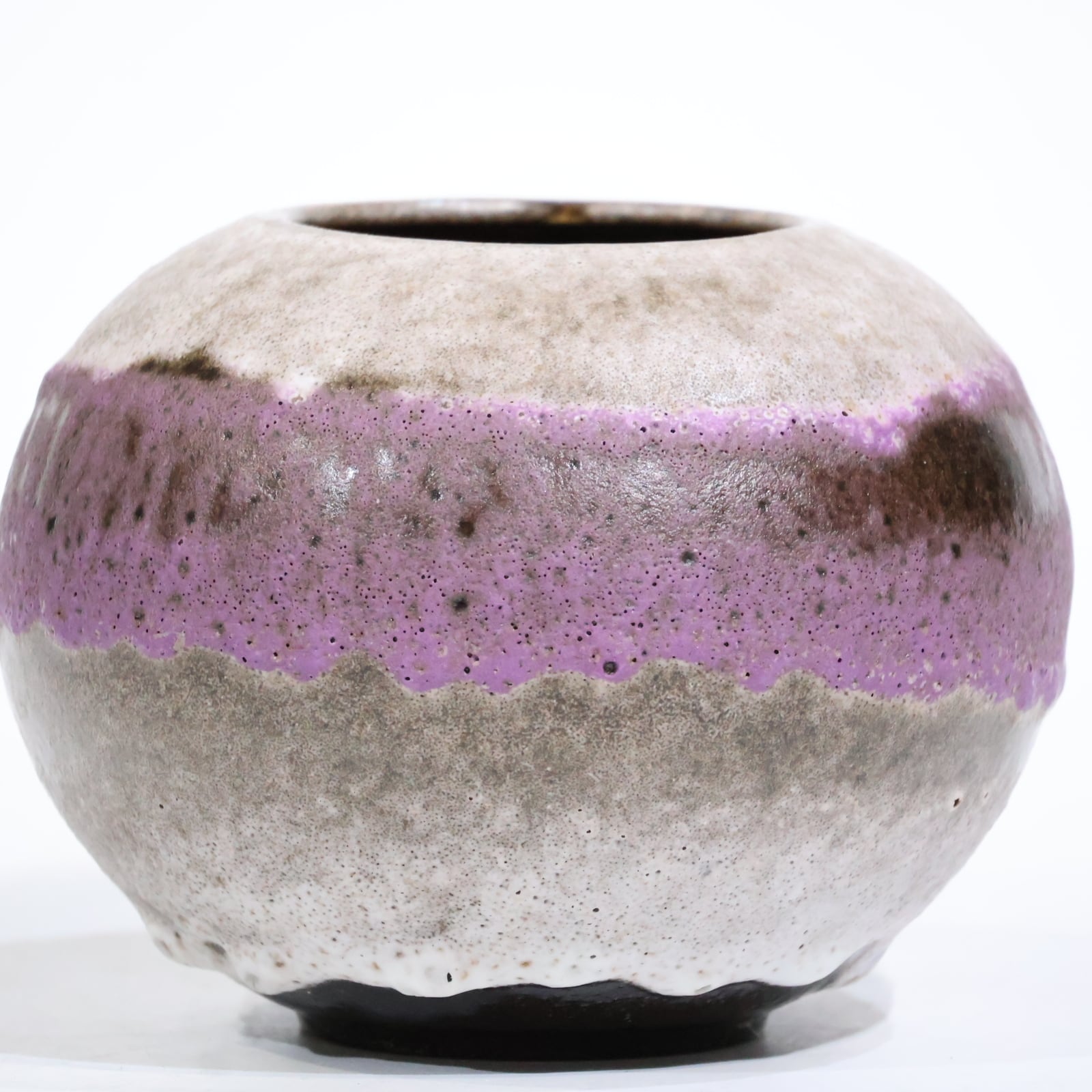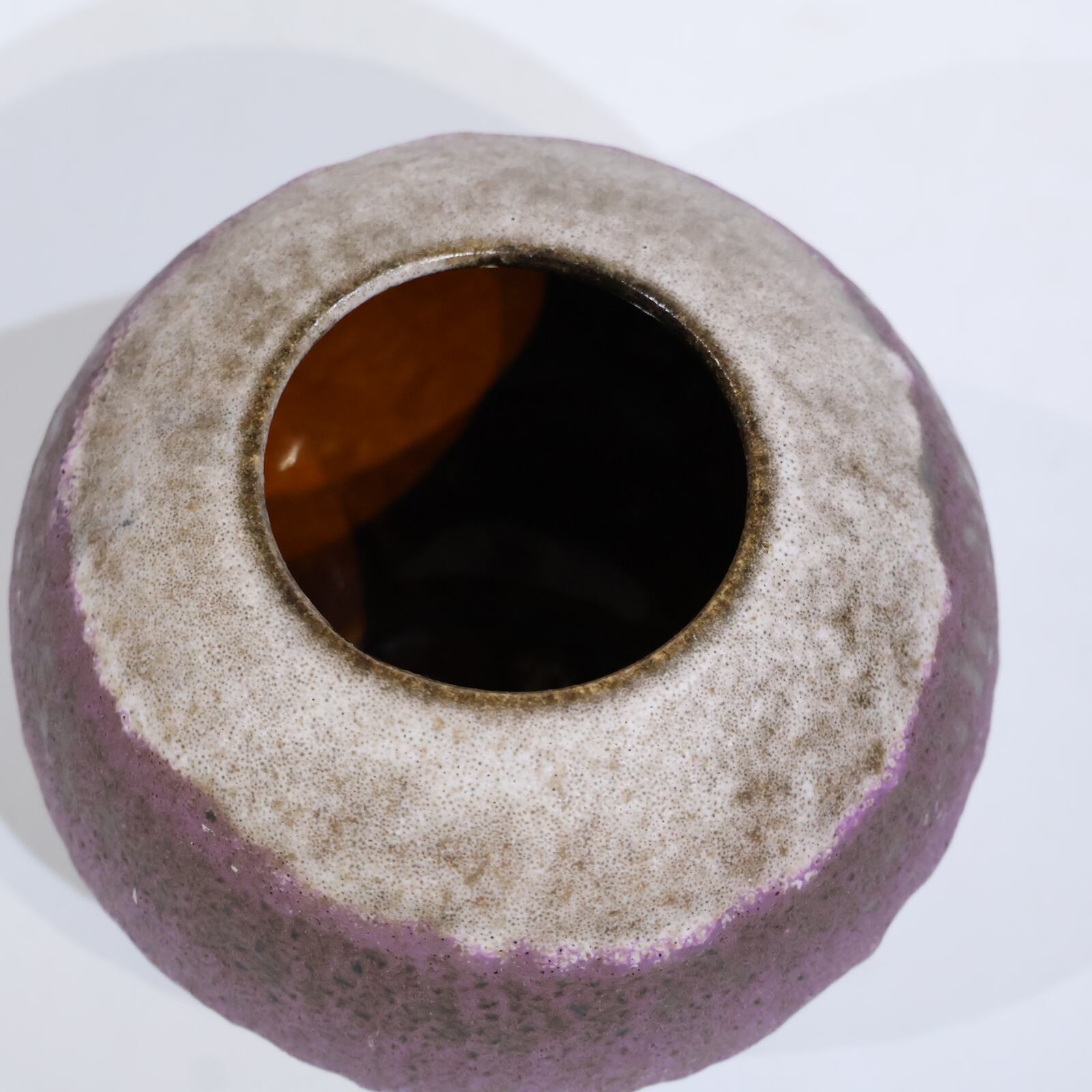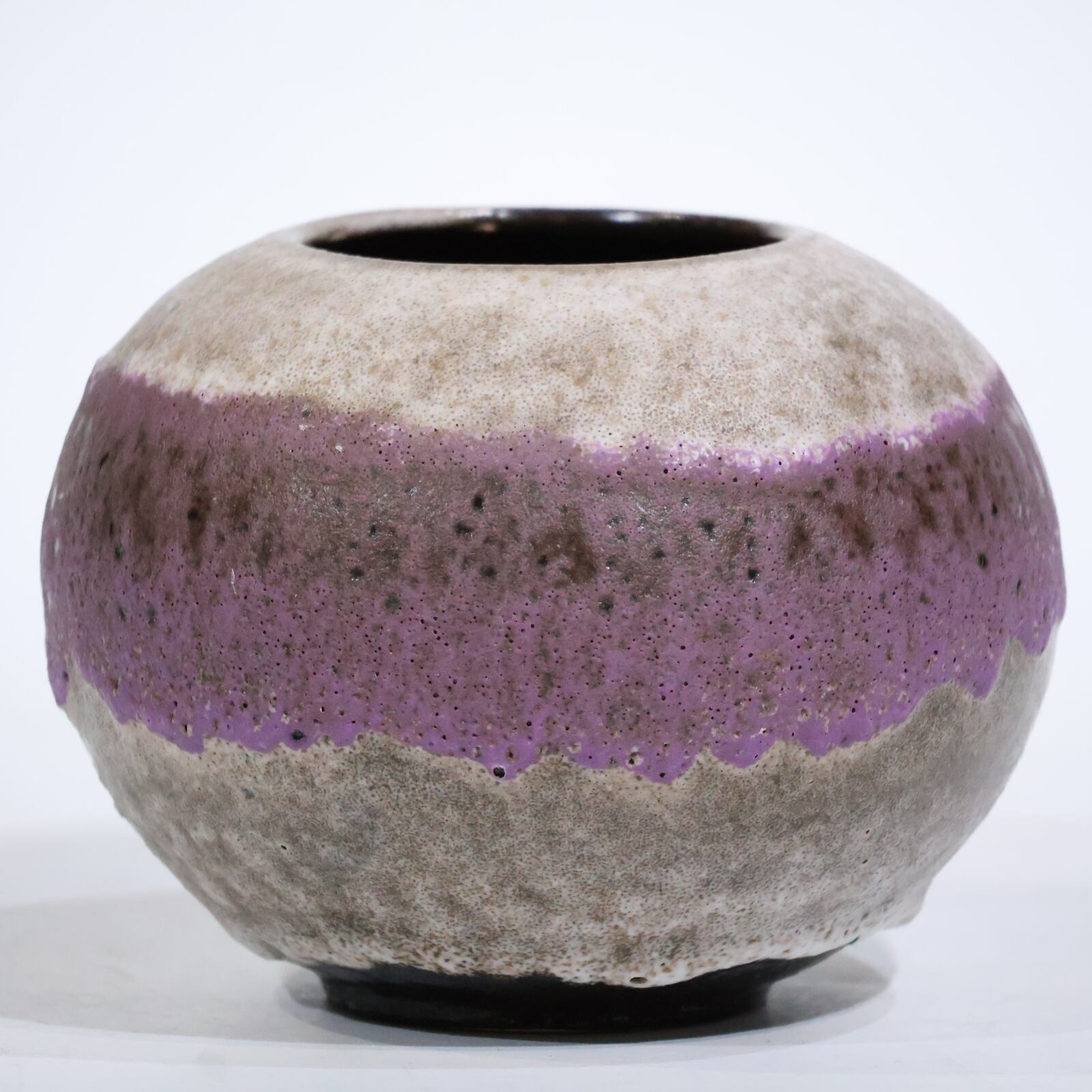 釉薬は全体に厚くかけられ、流れの中に白い斑点が浮かび上がる構成で、Ruscha特有の火と大地のニュアンスを思わせる表情が見られます。