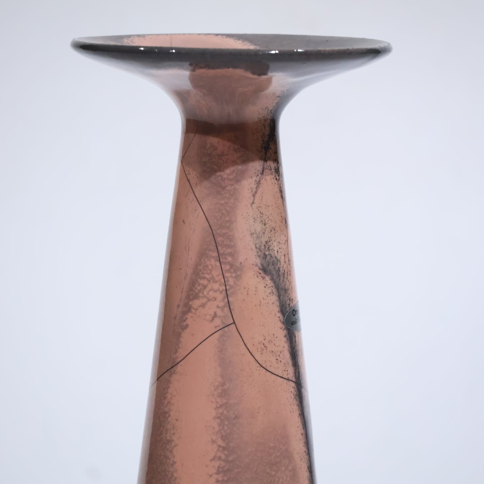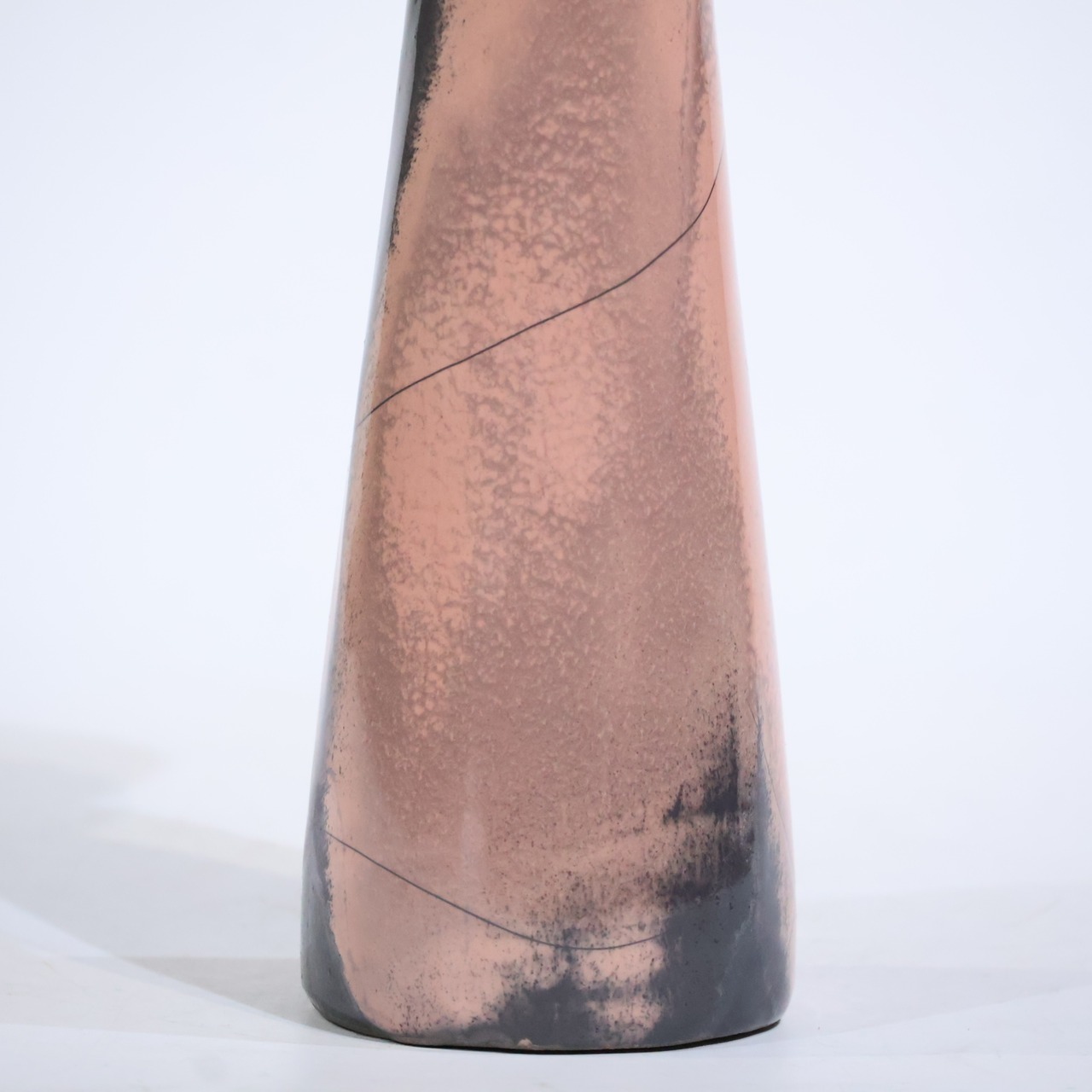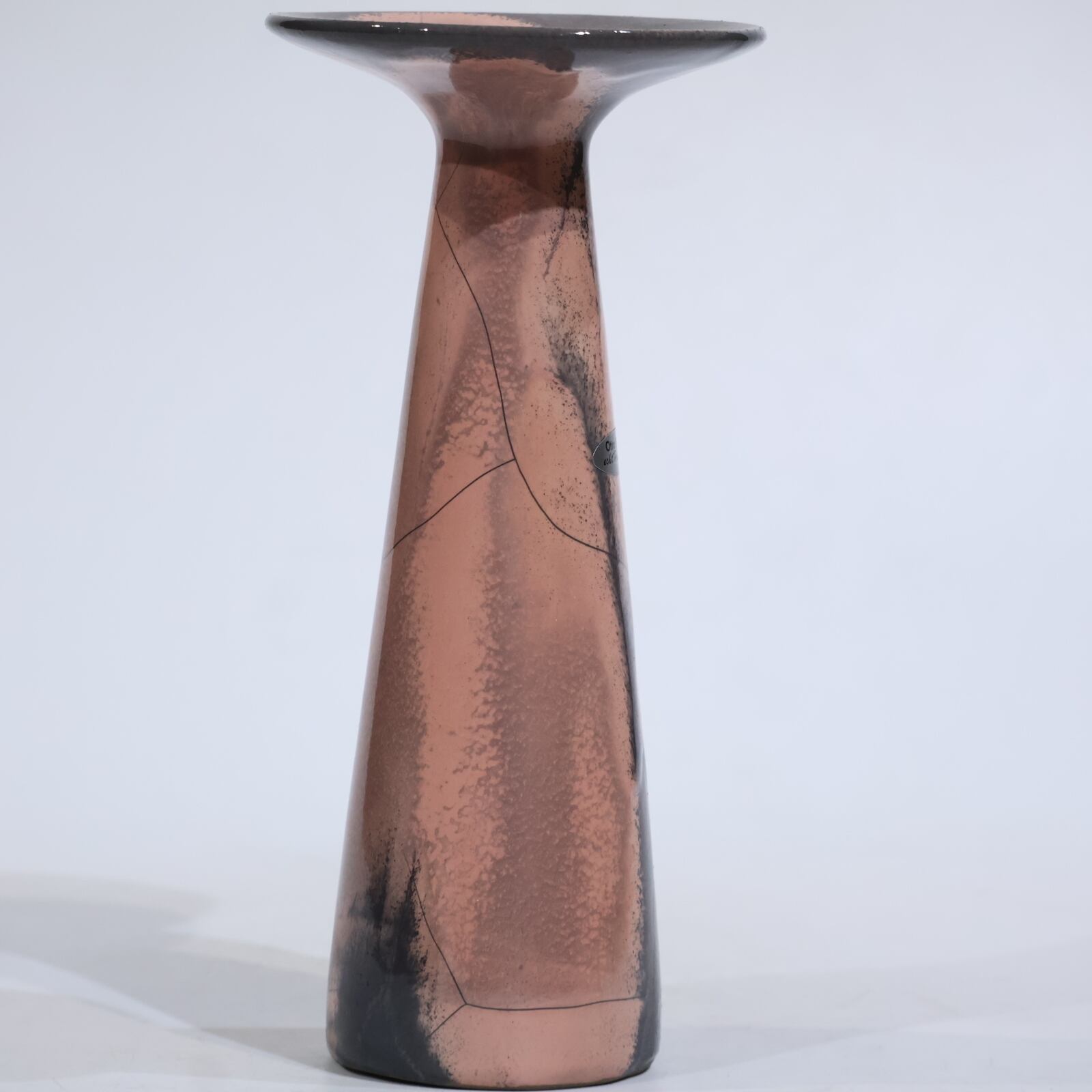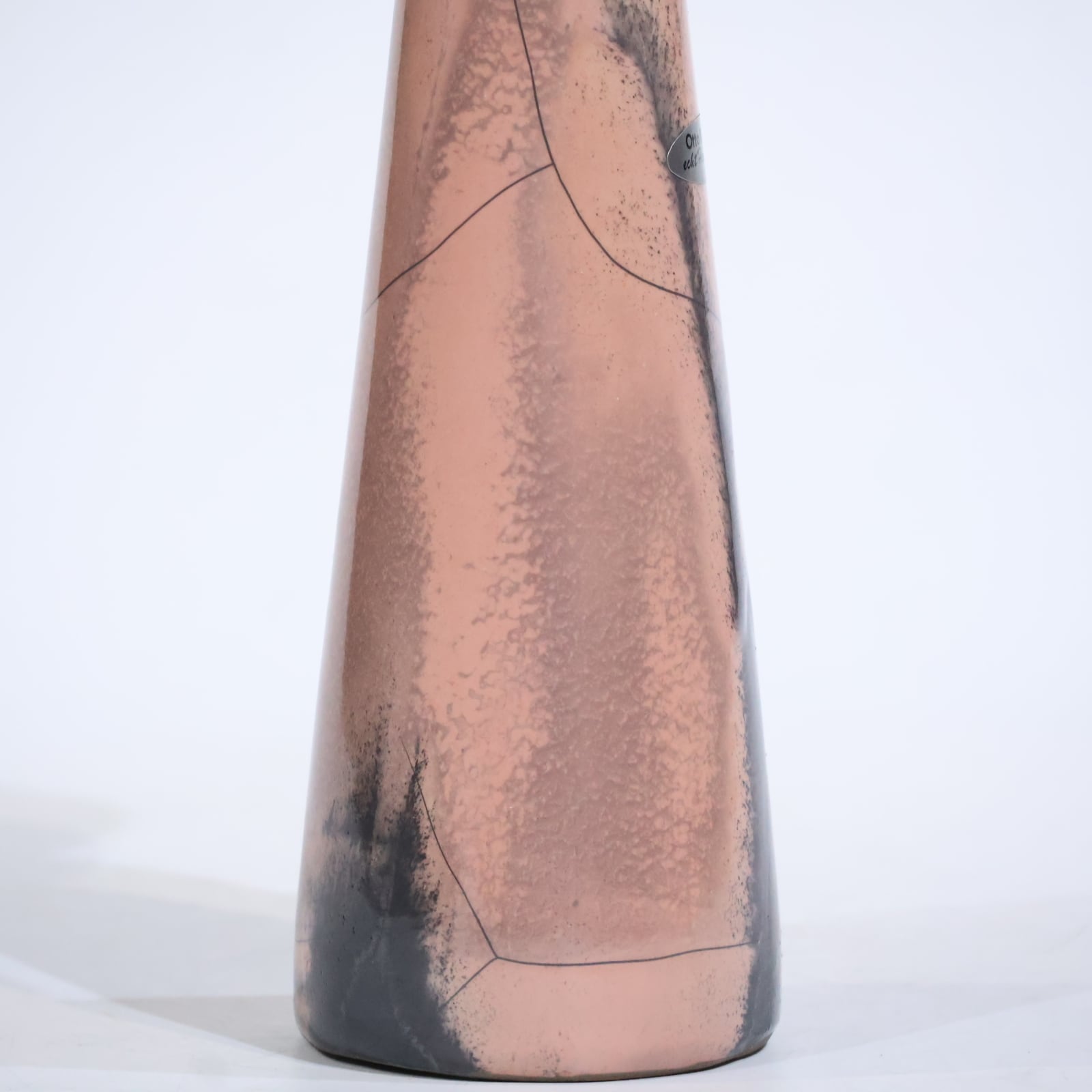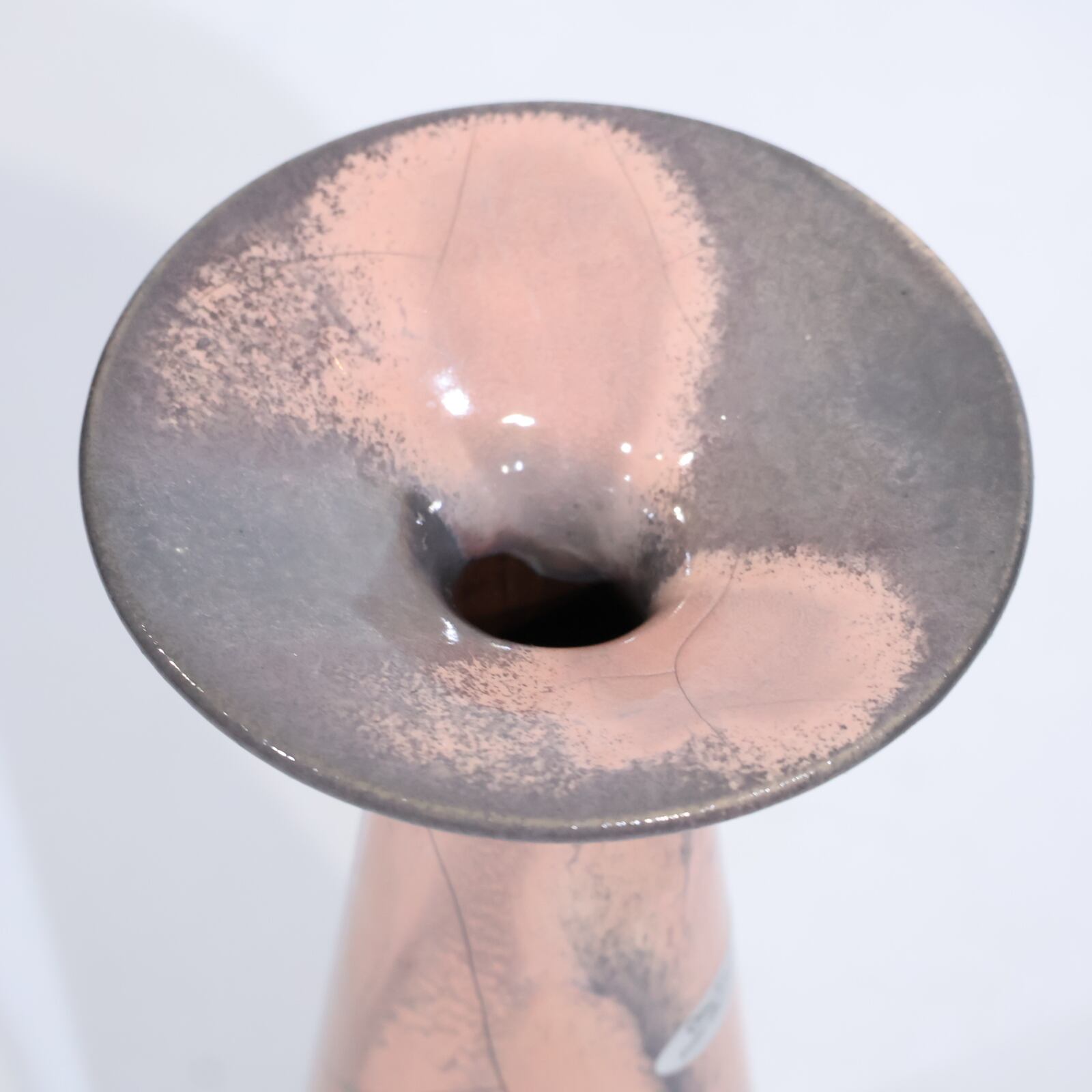 色彩は柔らかなグレーとピンクの組み合わせ。艶のある釉薬が溶け合うように流れ、静かに揺らぐ陰影を生み出しています。ピンクはややくすみを帯びており、落ち着いたグレートーンとの対比が上品な印象を与えます。