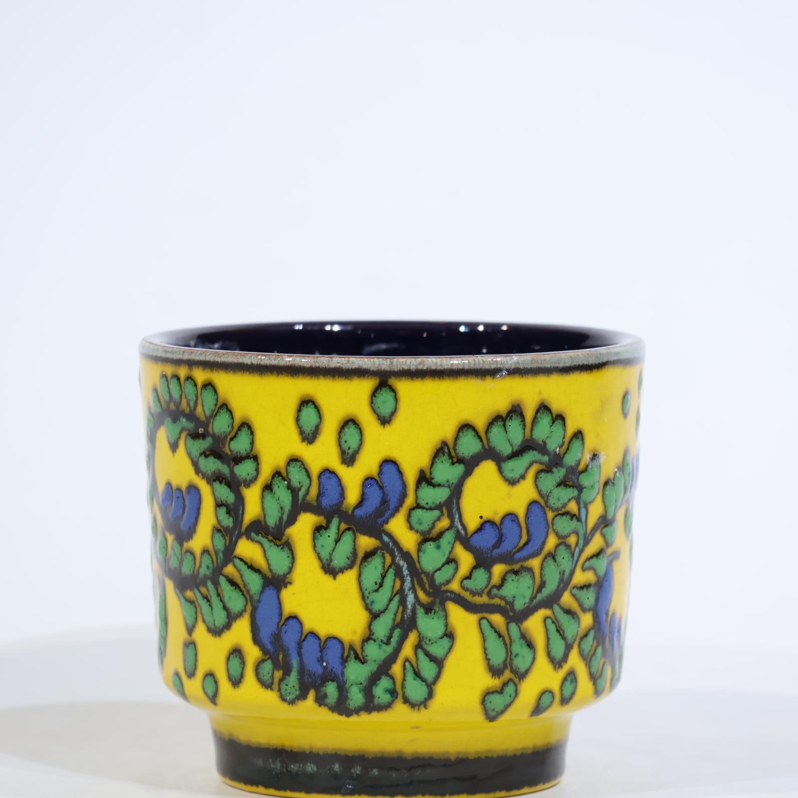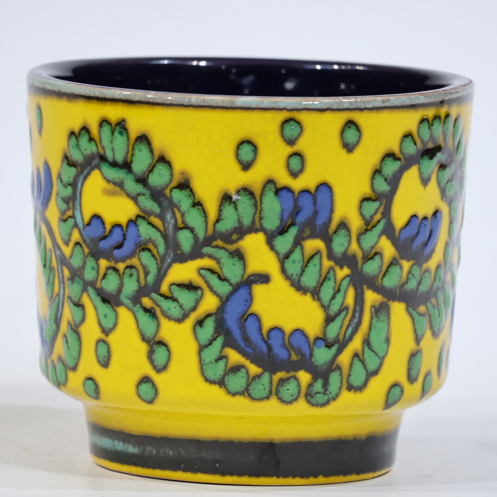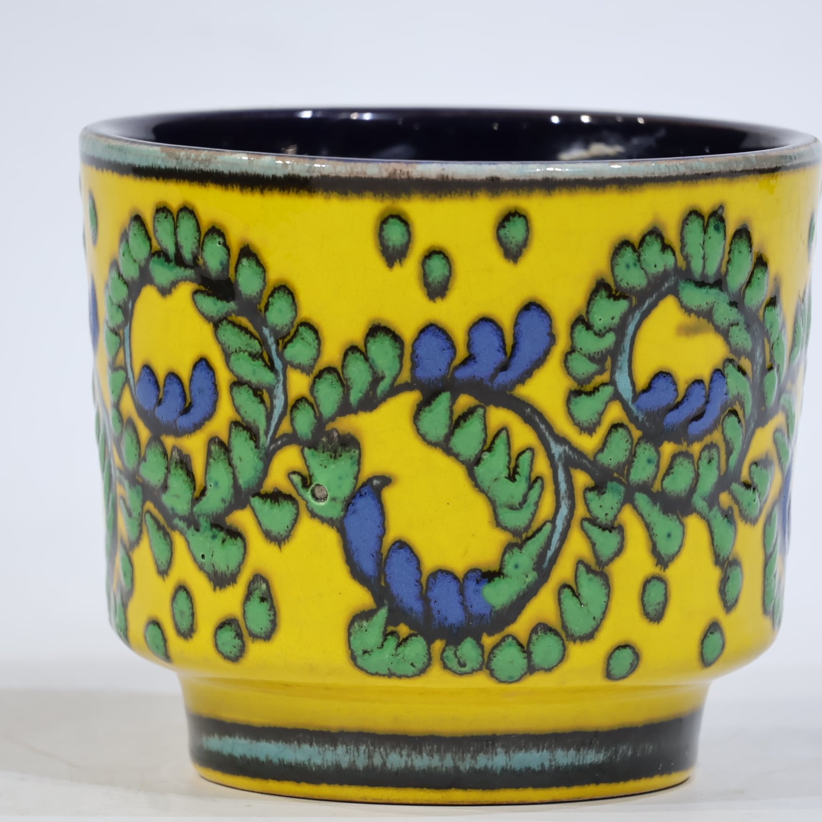リリーフ装飾は、黄色い背景に緑の葉状文様と青の実のようなポイントが連続的に施されたもので、Mareiらしい鮮やかな配色と立体感のある装飾技法が特徴的な一点です。