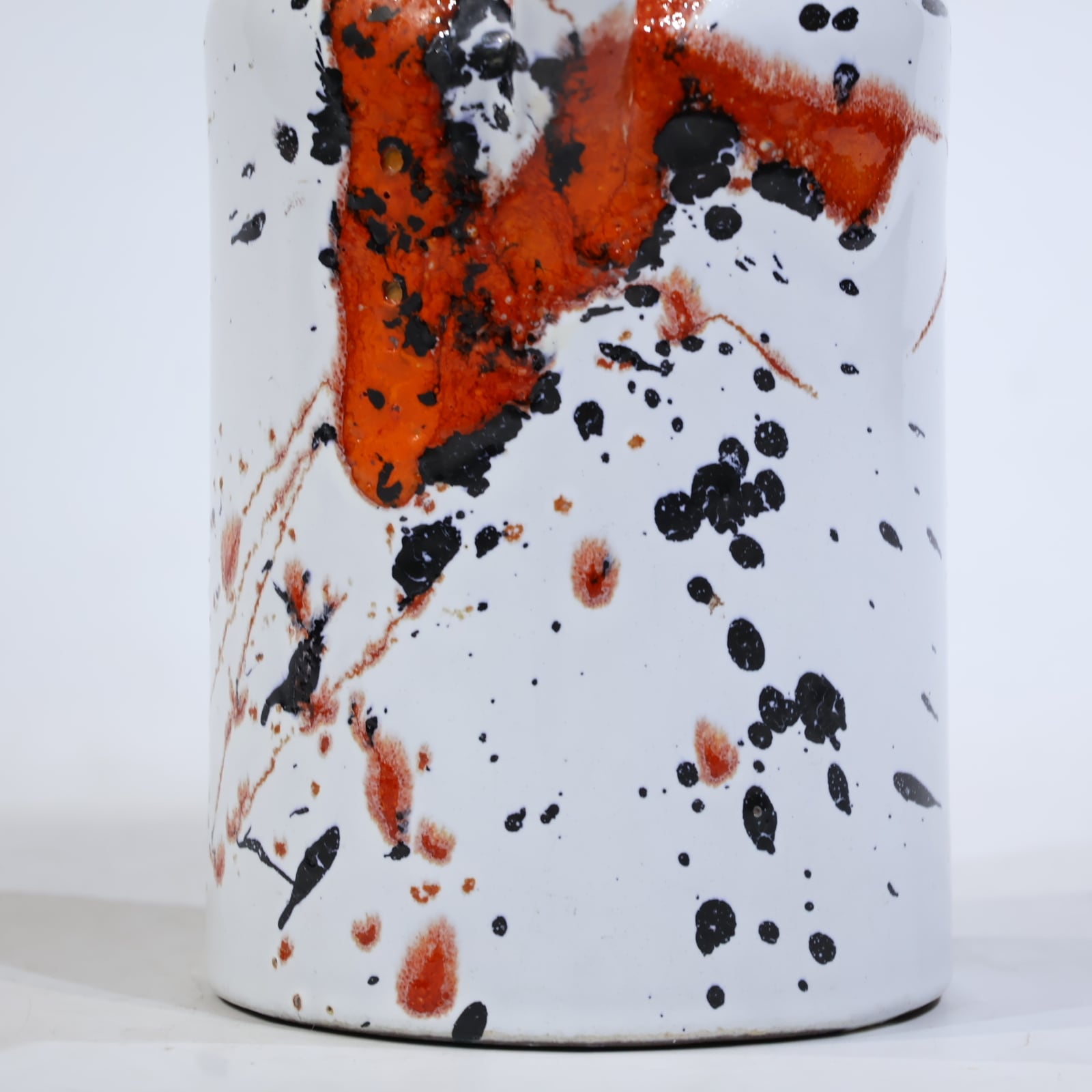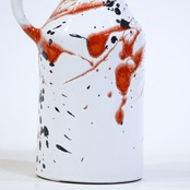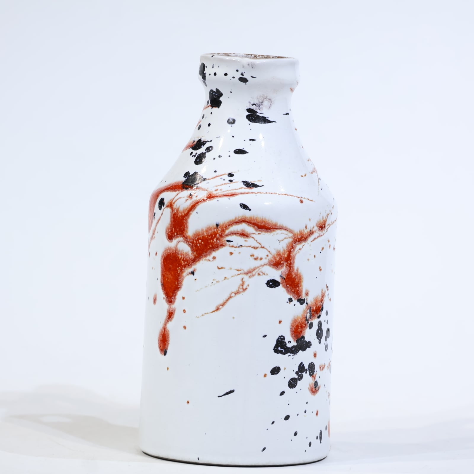 白釉を基調に、赤と黒の釉薬が勢いよく飛び散るように施された一点。