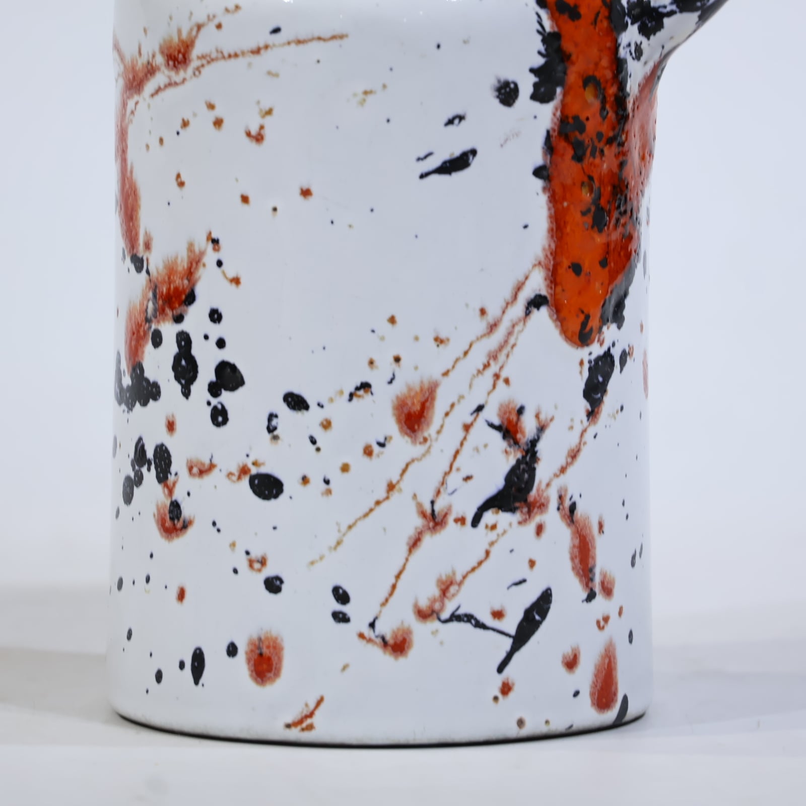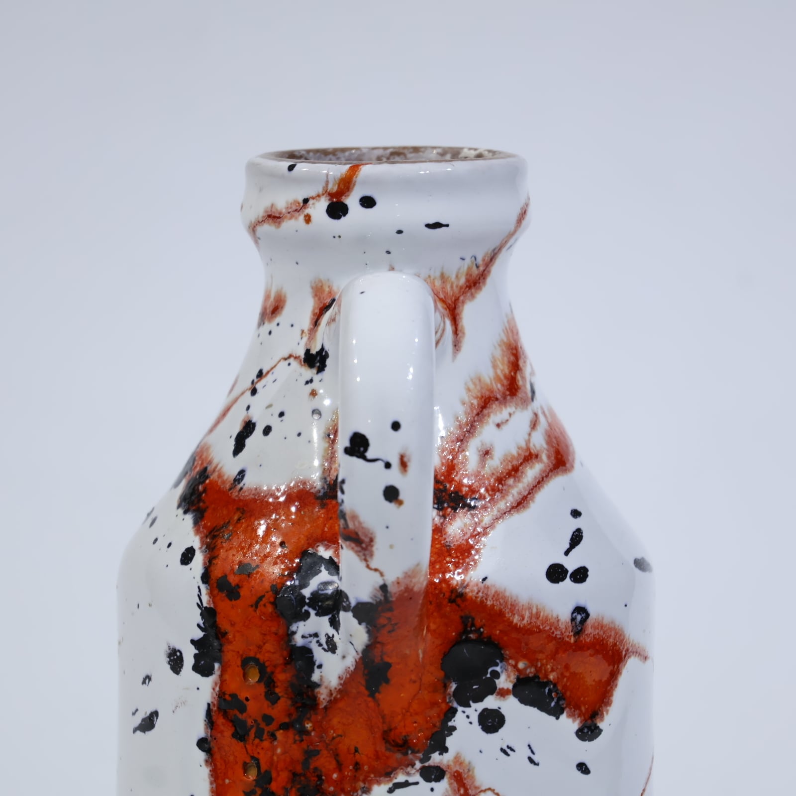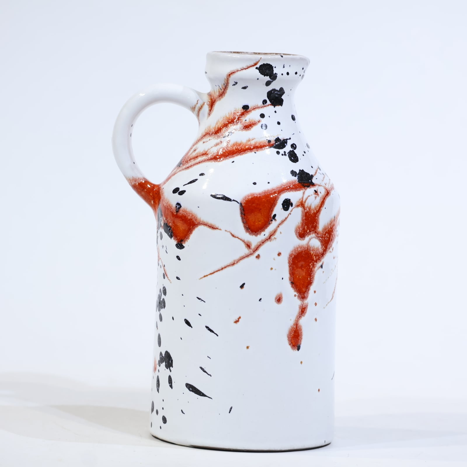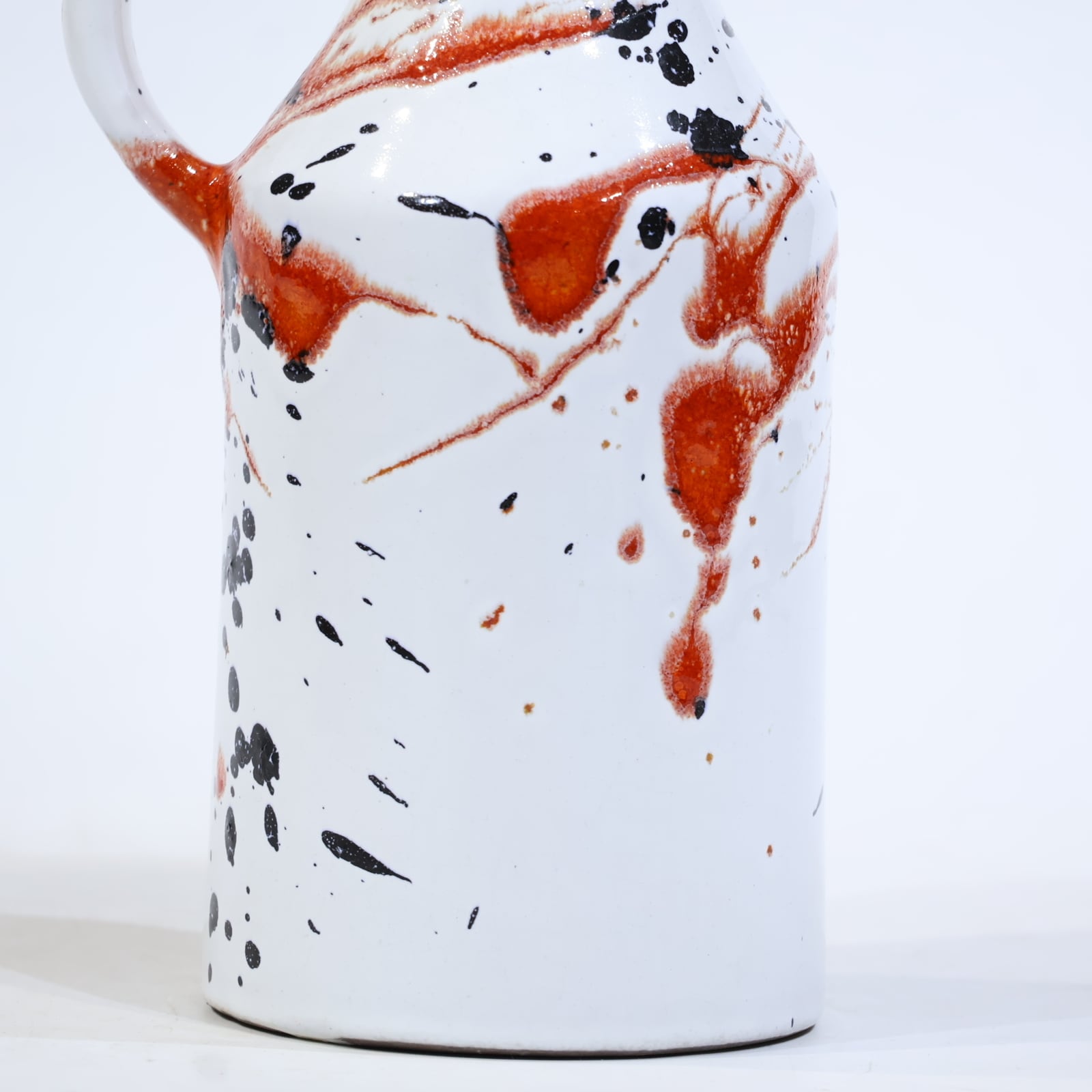 スプレーあるいはスプラッシュに近い手法で、釉薬が流動しながら器面を駆け落ち、ランダムな飛沫が静かな躍動を与えています。口元や持ち手にも同様の装飾が重ねられており、見る角度によって印象が変化します。
