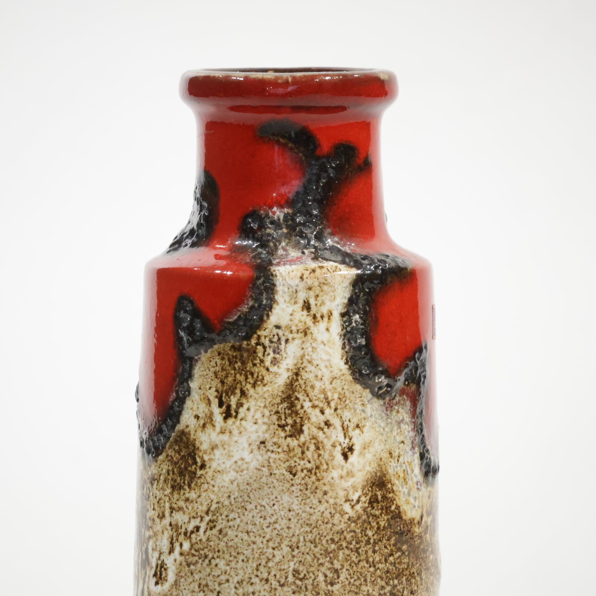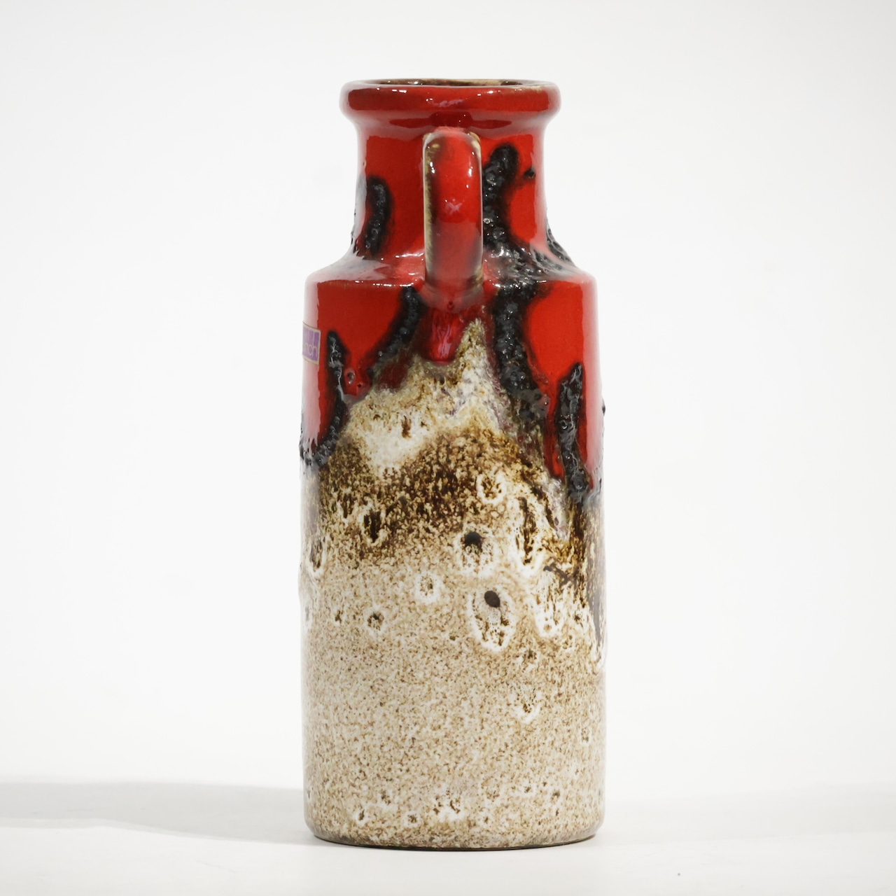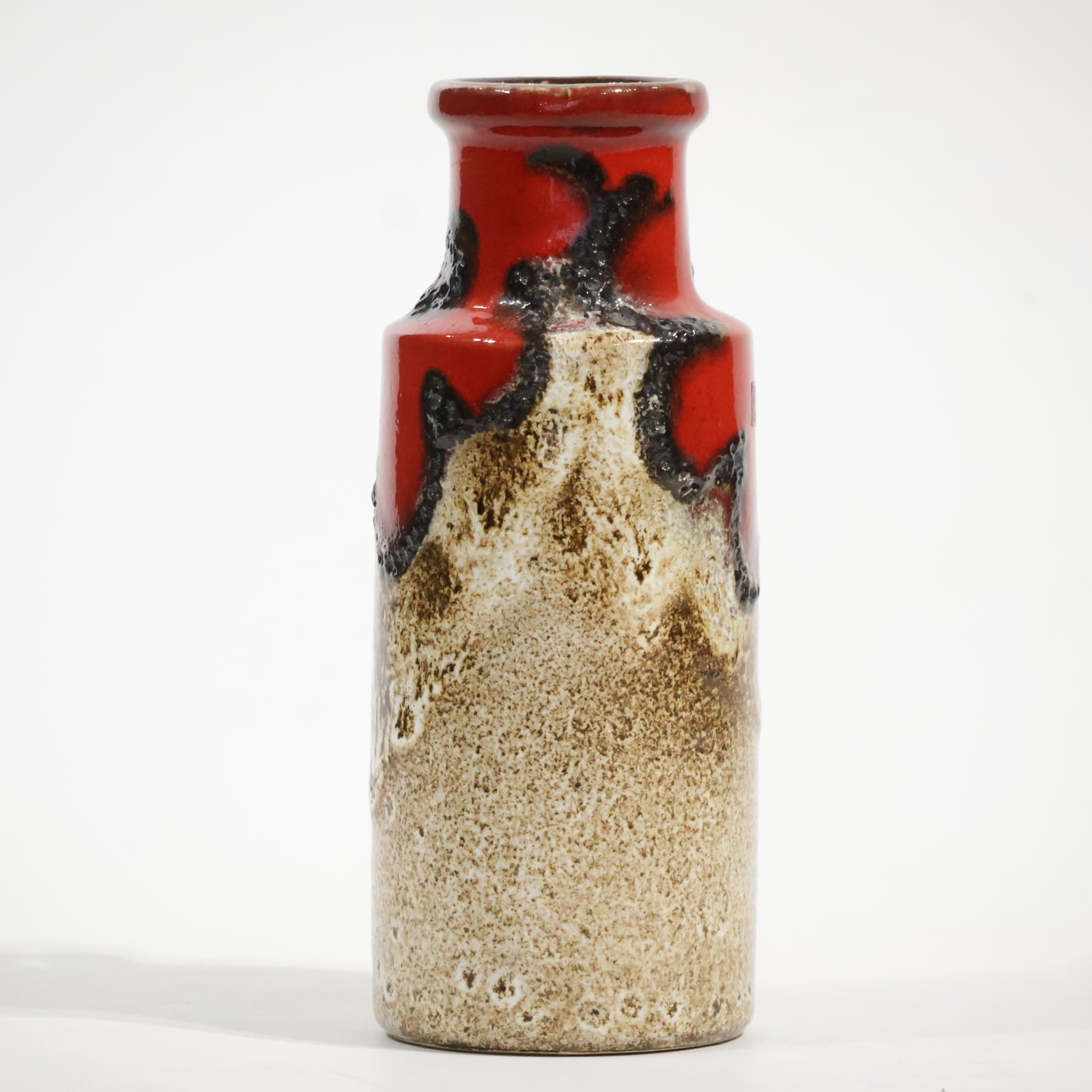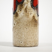 同社は急速に成長し、1950~80年代には陶 器製造の分野でドイツ最大のメーカーとなり、今日も確固たる地位を維持しています。形状に加えて釉薬でも、当時は最も幅広い品揃えを誇った他、輸出量も最大だったため、現在でも同社の製品はよく見られます。特に円筒形を基調にし たシンプルな形状で、型押し模様のある床置き 花瓶が代表的。色彩については当時主流だっ た赤やオレンジから、クリーム、ベージュ、茶色 などが多くを占めています。