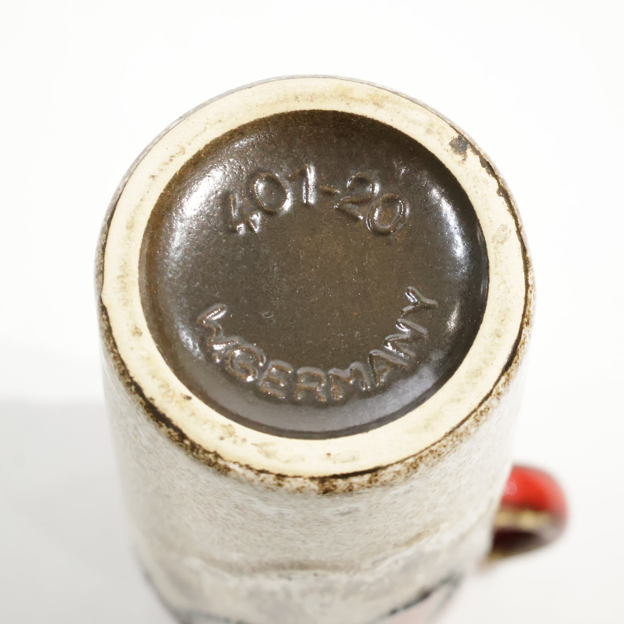 Scheurichの製品には白い粘土が使われて おり、マークは型押しされています。マークには3 ~4桁の型番、その後ハイフンに続いてセンチ メートル単位でのサイズと「W.GERMANY」の表 記があり、底の縁に沿って半円形にマークが型 押しされている場合が多い。その他のマークが 型押しされているのは後期の作品である。品質 は高水準で安定しており、多くの型が同じフォ ルムでさまざまな装飾パターンを展開しているため、同一の型で数多くの作品を揃えるコレク ターも少なくないです。