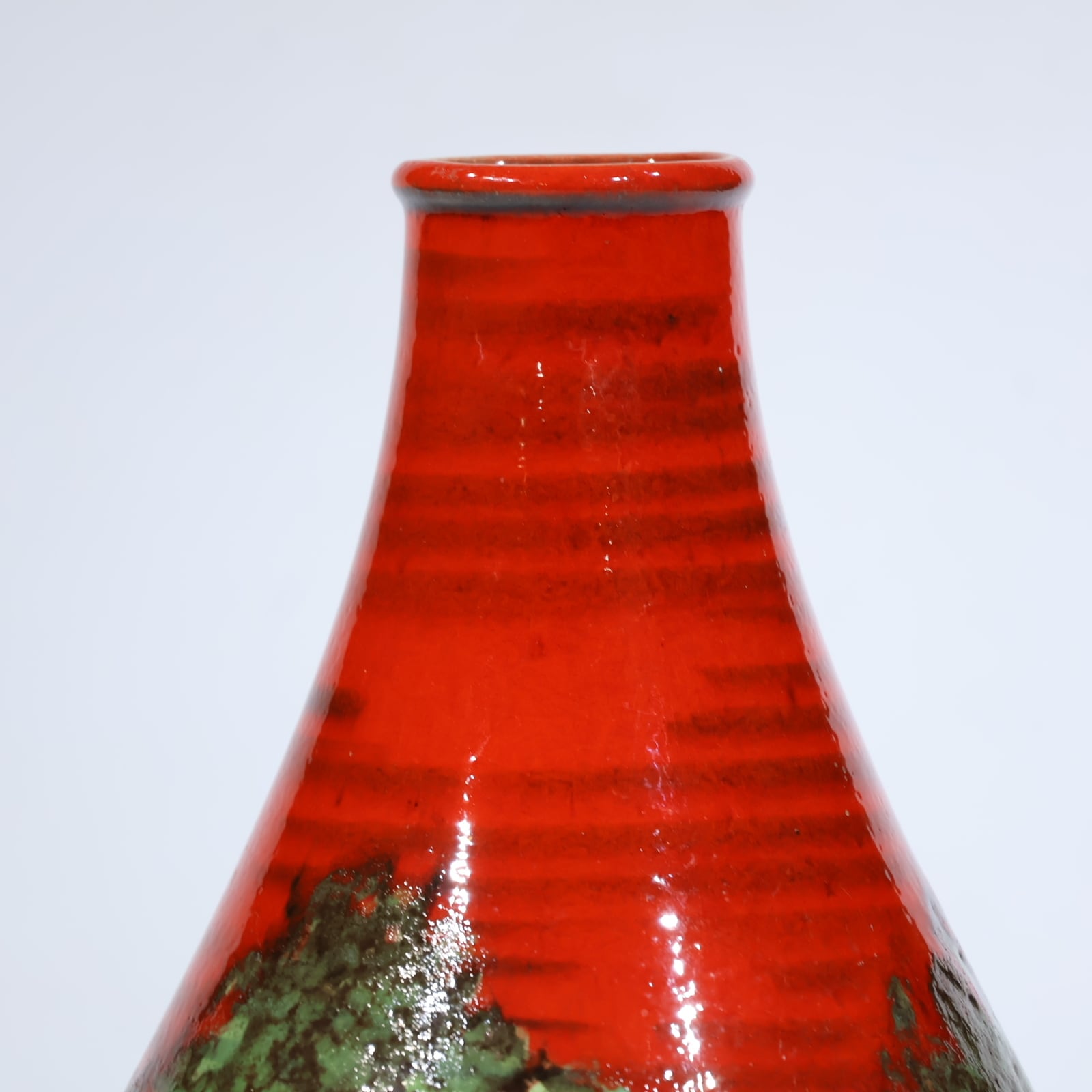胴部に広がる釉薬は、赤を基調に、グリーンが混ざり合いながら流れるように重なっており、まるで大地に広がる溶岩のようにも見えます。