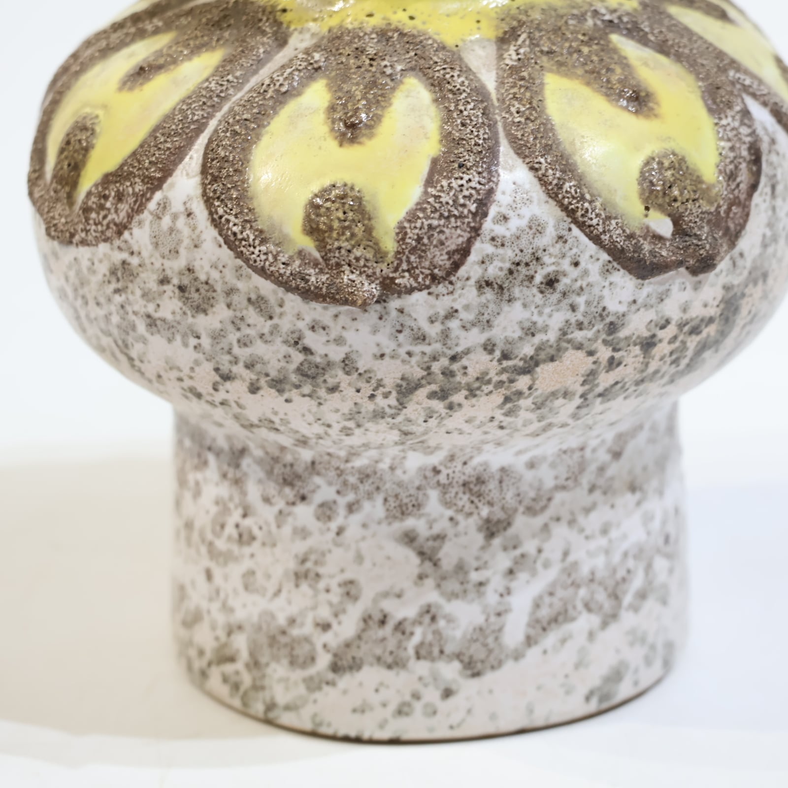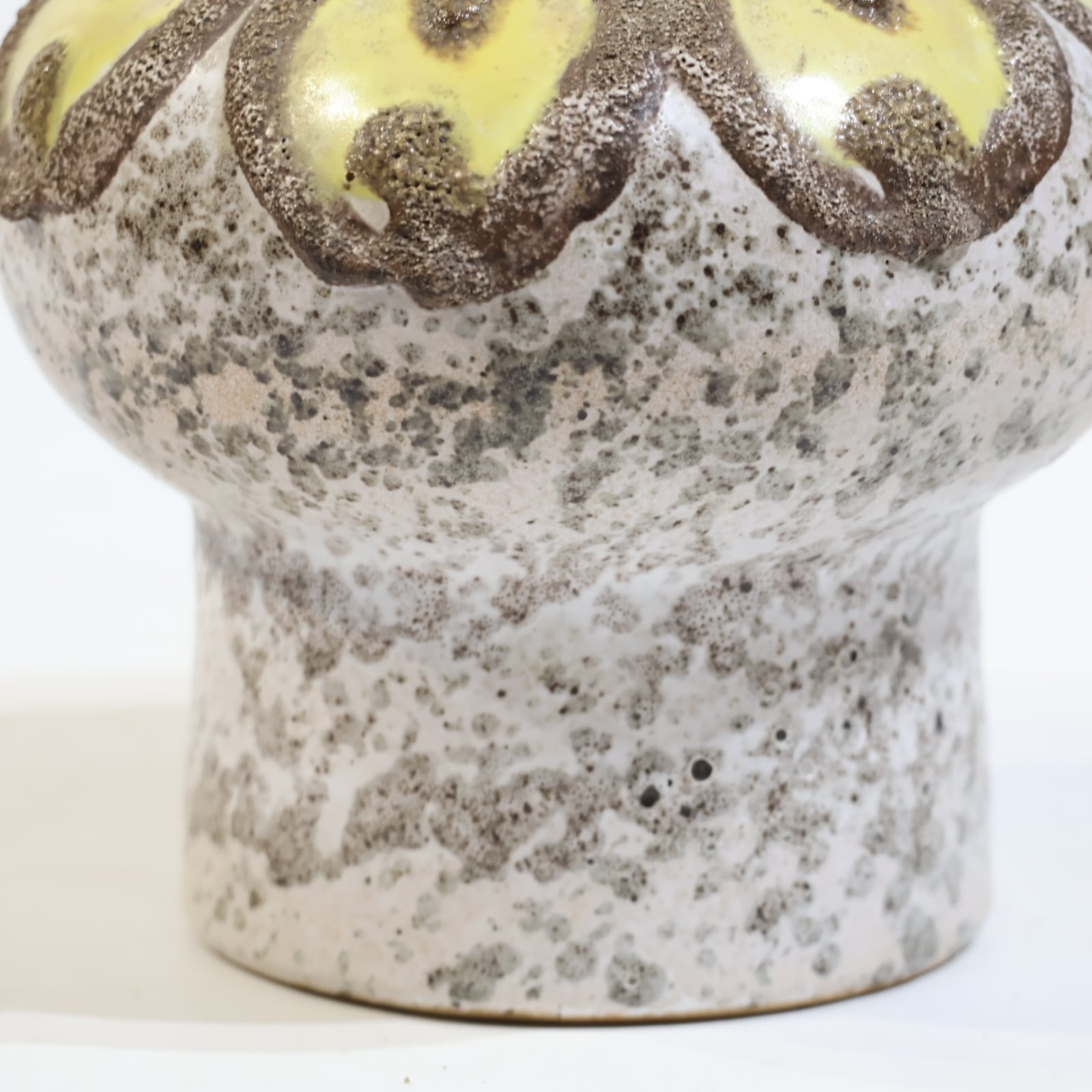 ひょうたんのようなシルエットに、柔らかなイエローと濃茶の対比が印象的な一点。艶やかな釉薬とざらついたマットな質感の装飾が交互に現れ、まるで花びらのようなリズムを感じさせます。ベース部分には白を基調とした斑点のある釉薬が施され、素朴さとモダンさが共存する不思議な魅力に満ちています。