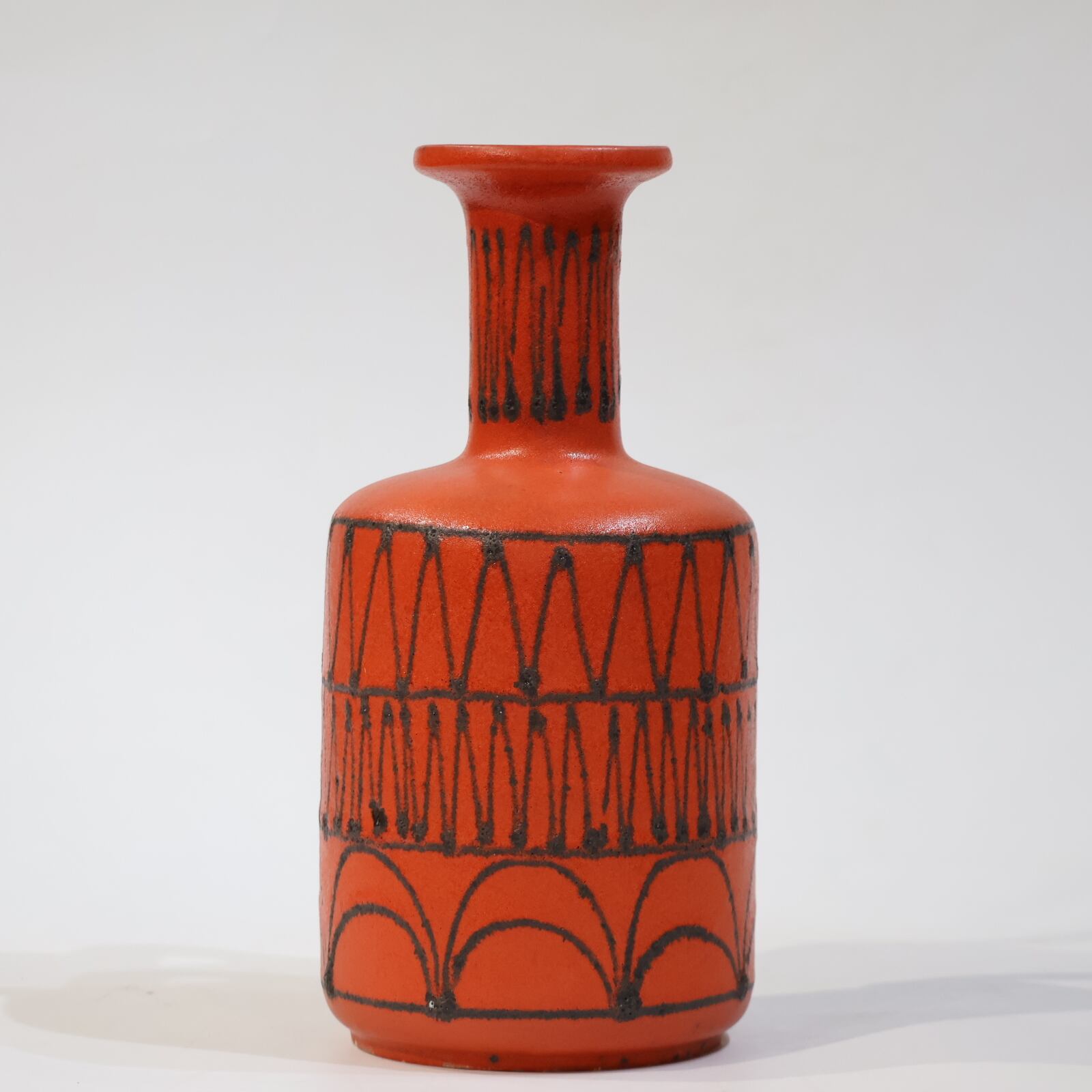 マットな質感の赤橙色のベースに、繰り返しパターン化された黒の幾何学線描がリズミカルに展開されており、モダンデザインの精神を色濃く反映しています。