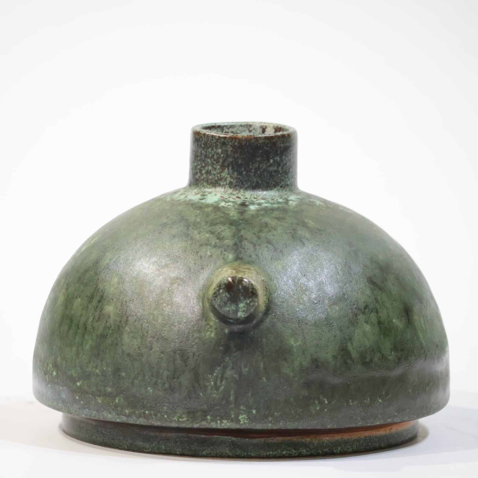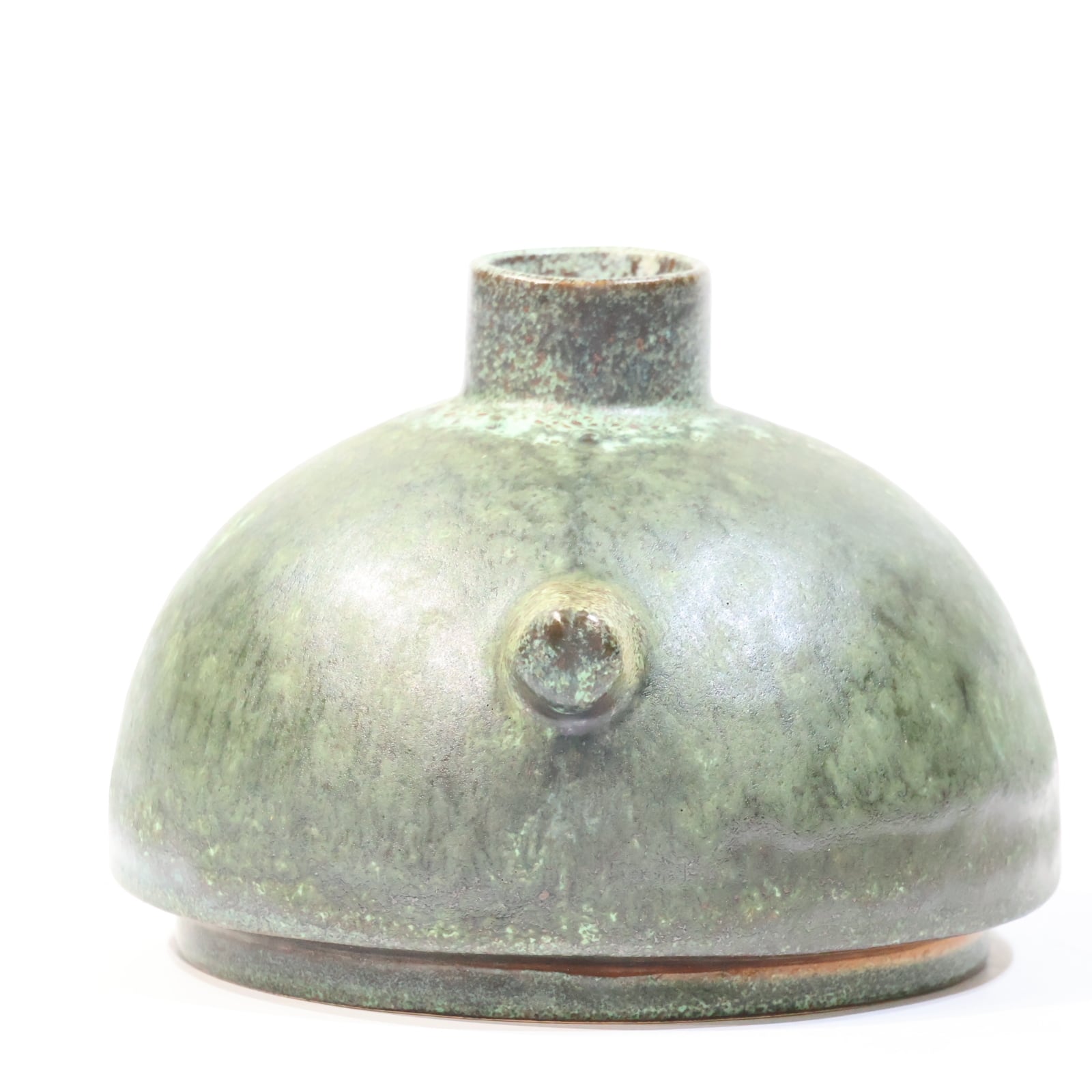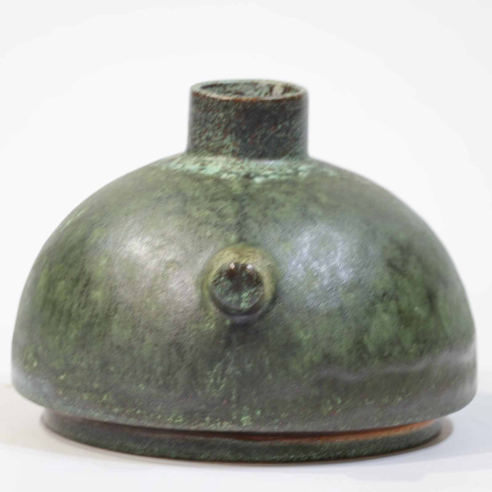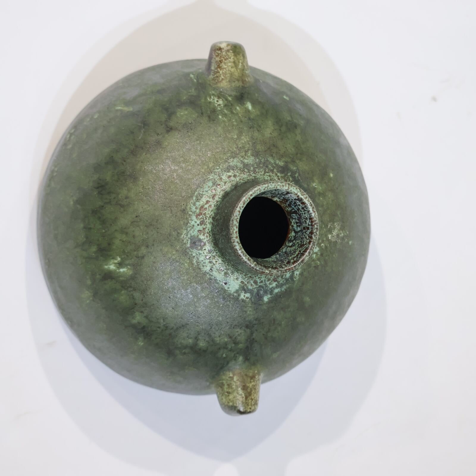 球体に近い胴と突起状のハンドル、そして小さく立ち上がった口部というユニークなシルエットが特徴です。