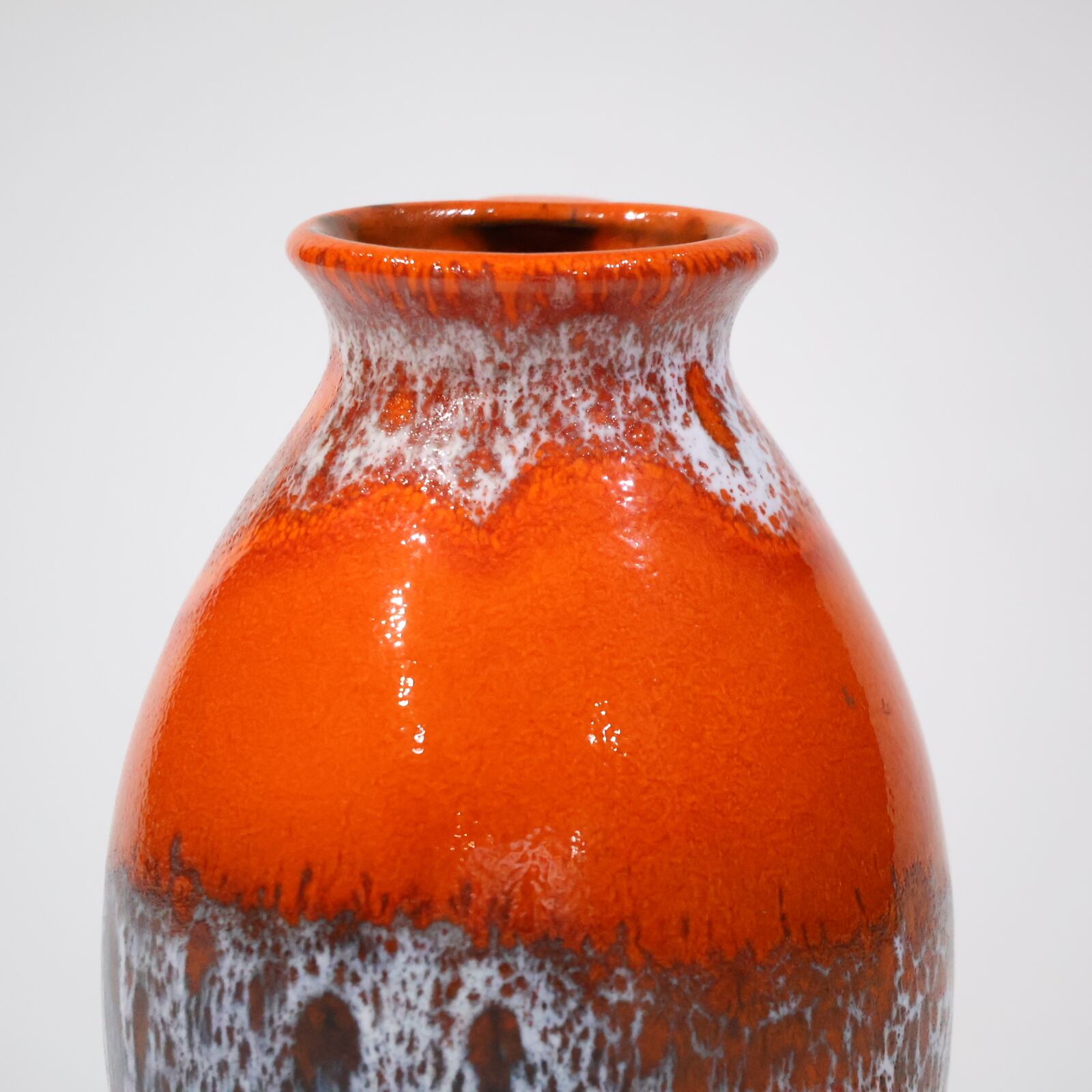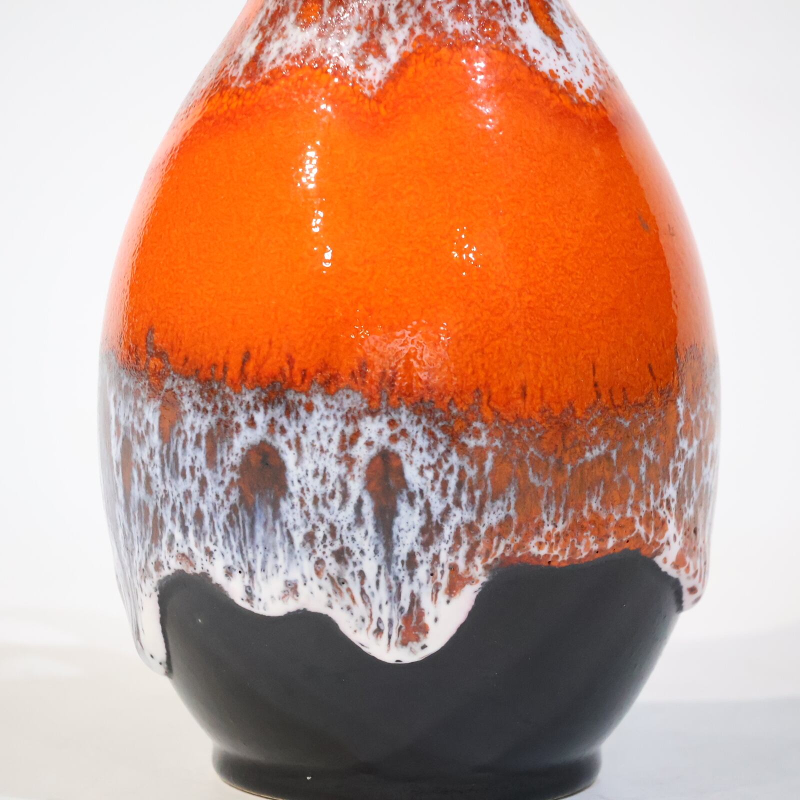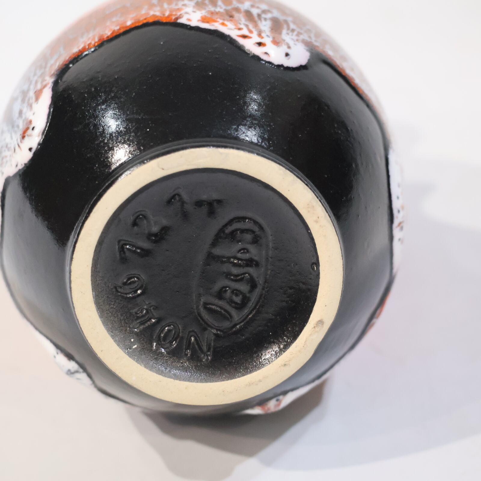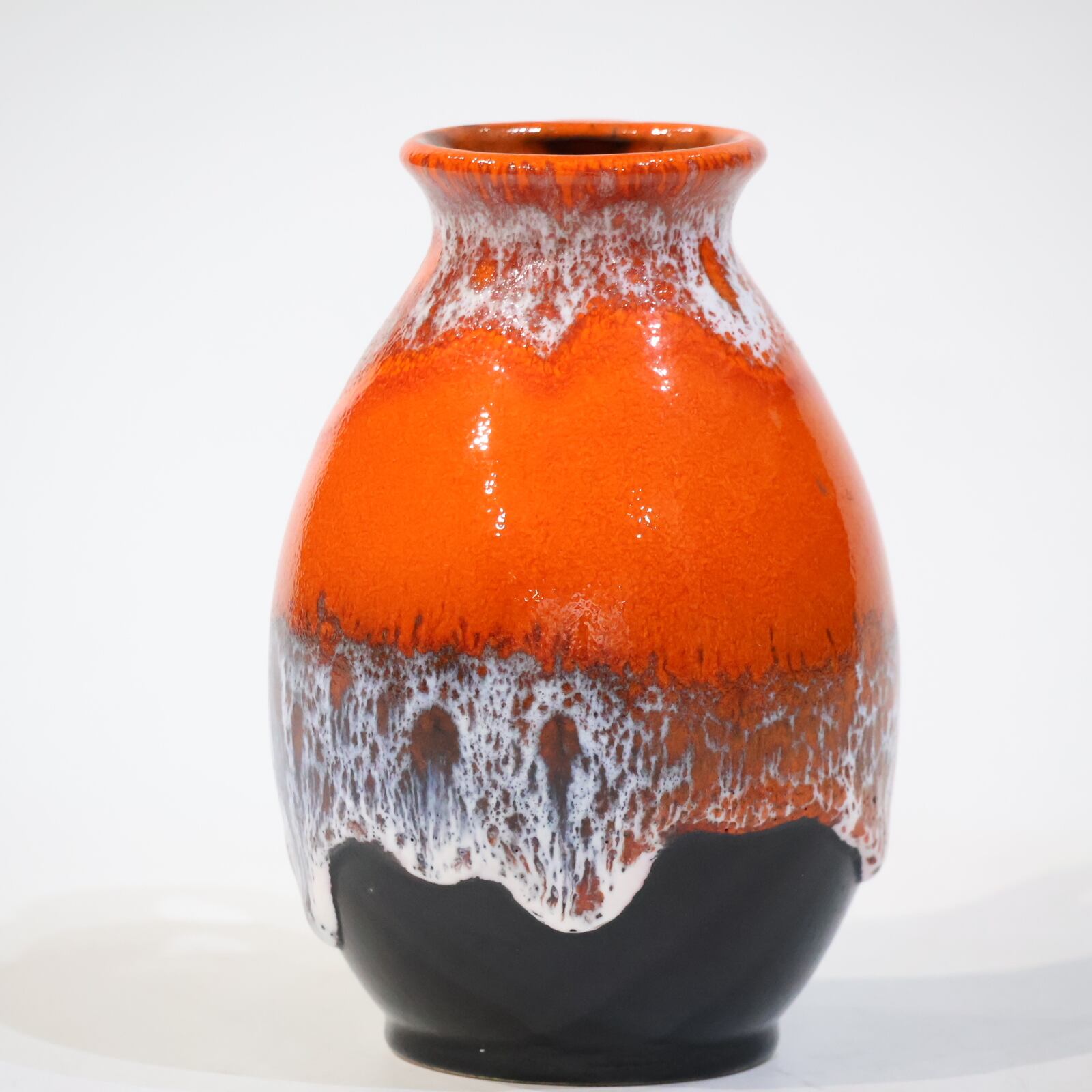 上部は高彩度のオレンジ釉が厚く掛かり、口縁付近では白い泡状の釉がにじむように現れます。中腹から下部にかけては、白釉が島状に流下し、その下で黒釉が重く受け止める構成。釉薬の層と重力の痕跡が明確に読み取れる仕上がりです。