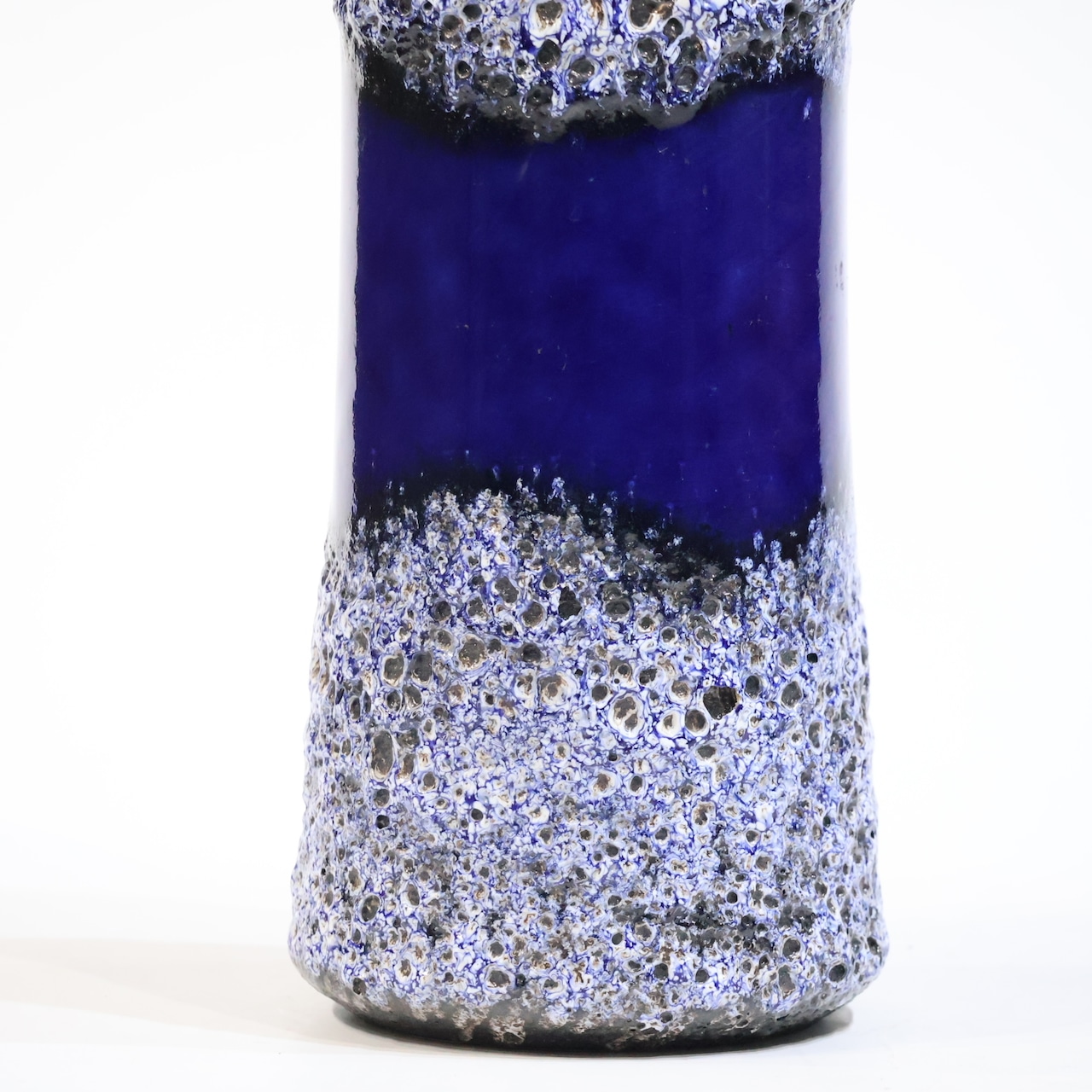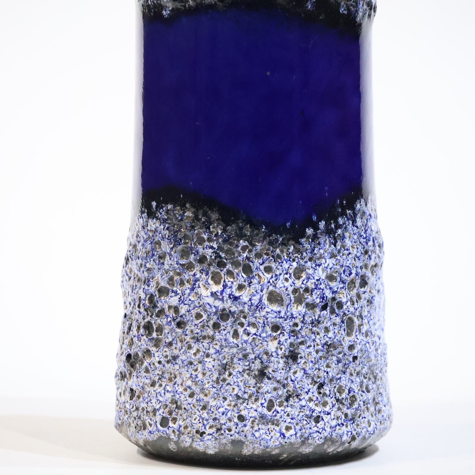 上下に噴き出すような発泡釉と、中央に走る深いブルーの帯が強いコントラストを生む一点。
