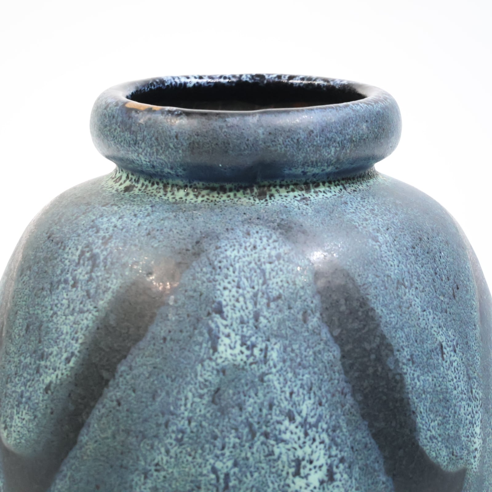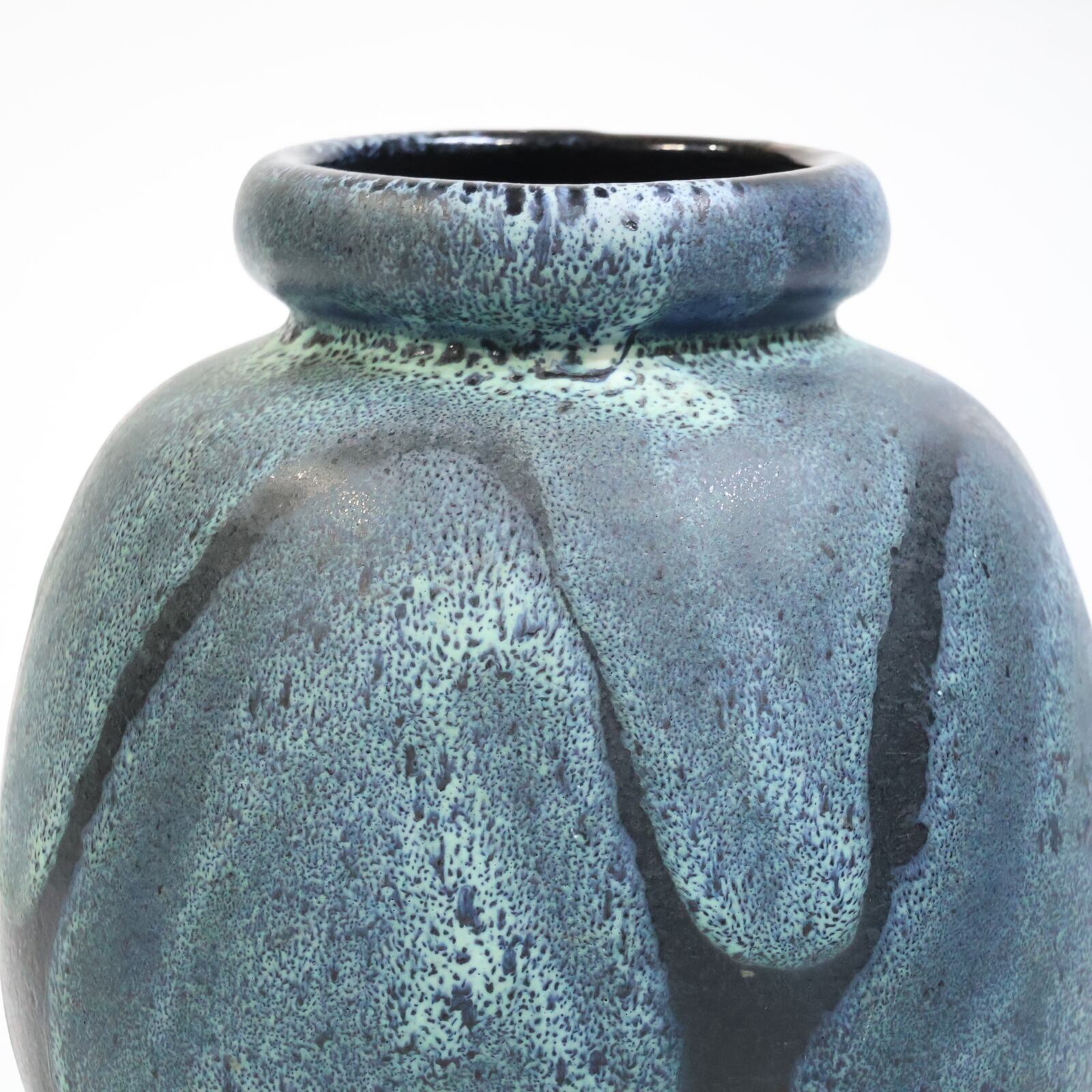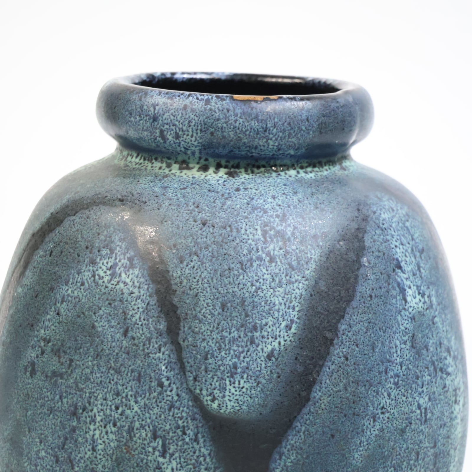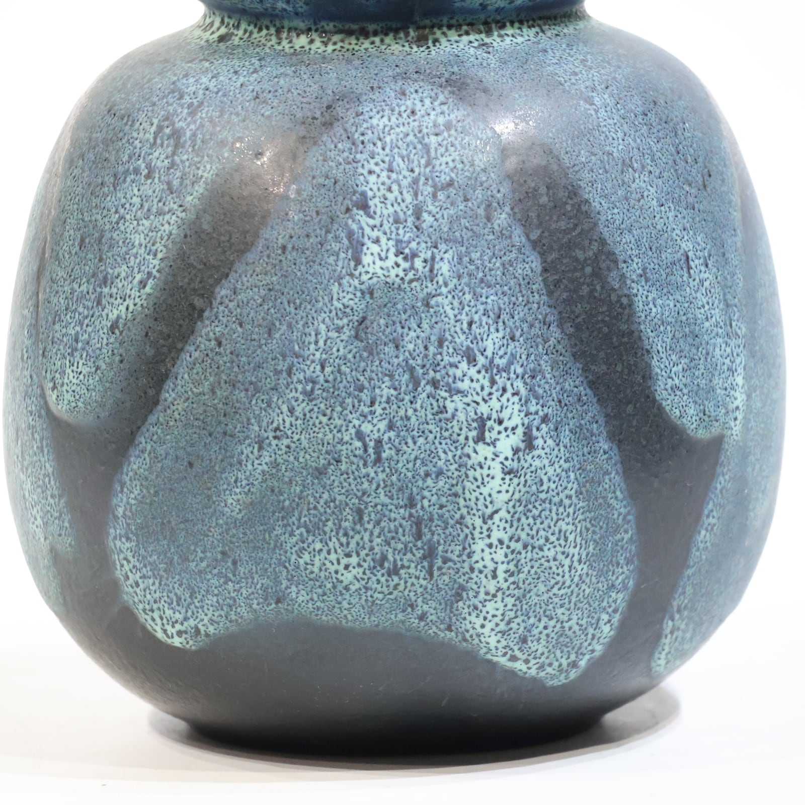 釉薬は青緑系で細かな斑点状の発色が全面に広がり、下部に向かってやや濃色へ移行しています。溶岩状に盛り上がる厚釉ではなく、マット寄りで粒立ちのある表情で落ち着きある一点です。
