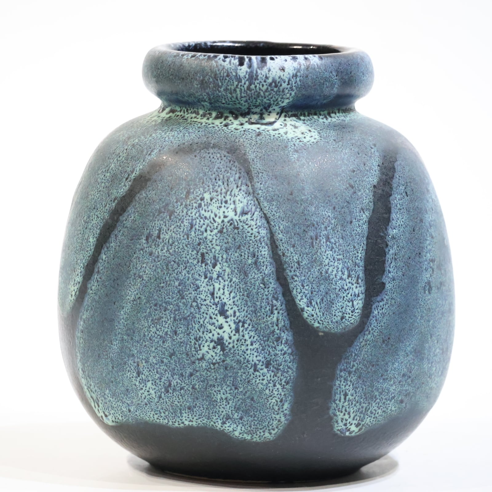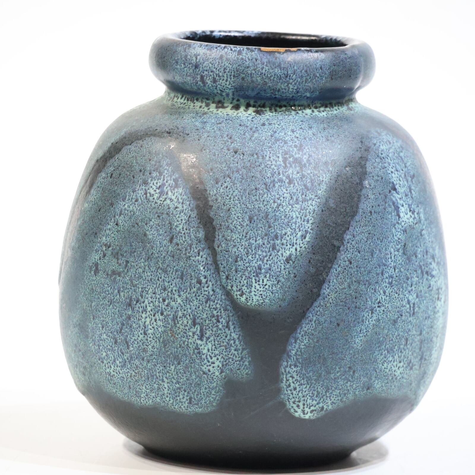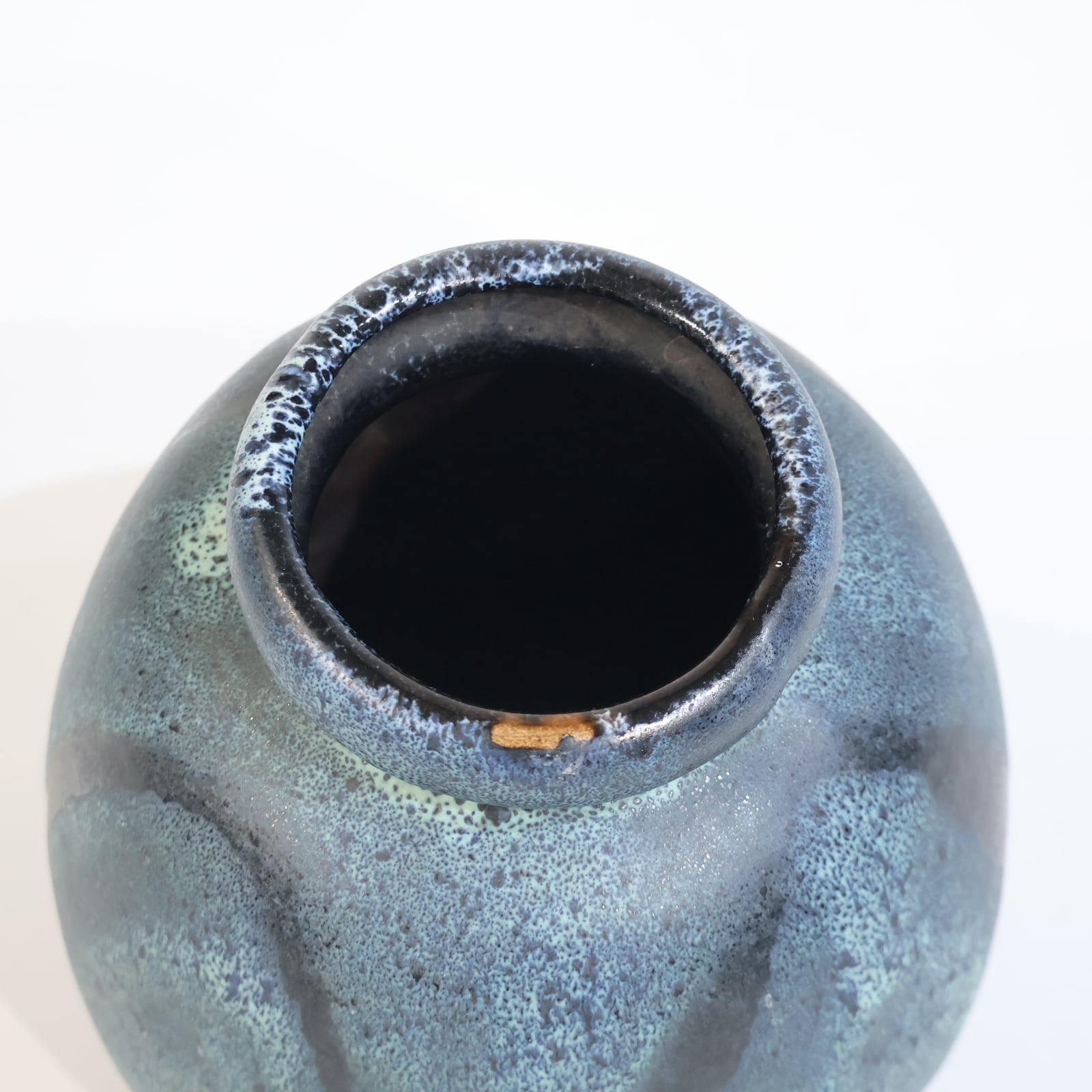釉薬は青緑系で細かな斑点状の発色が全面に広がり、下部に向かってやや濃色へ移行しています。溶岩状に盛り上がる厚釉ではなく、マット寄りで粒立ちのある表情で落ち着きある一点です。