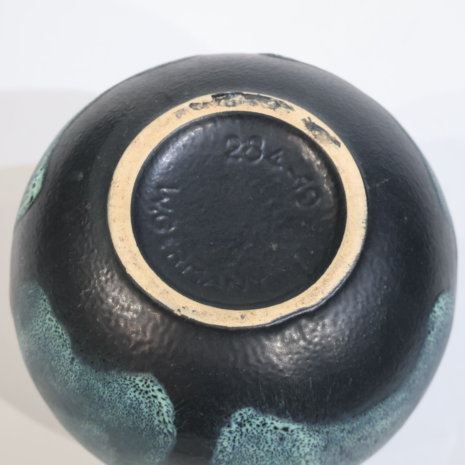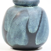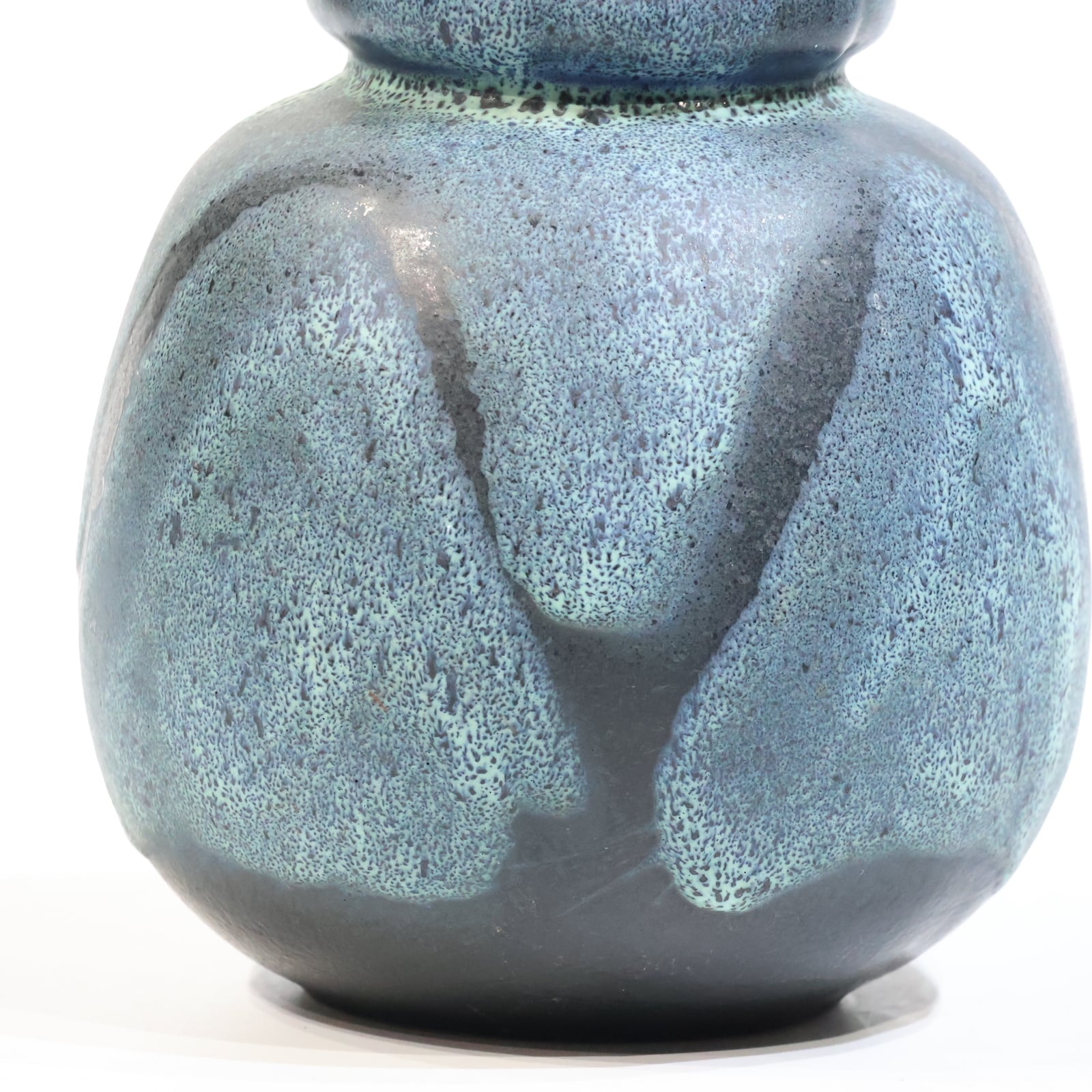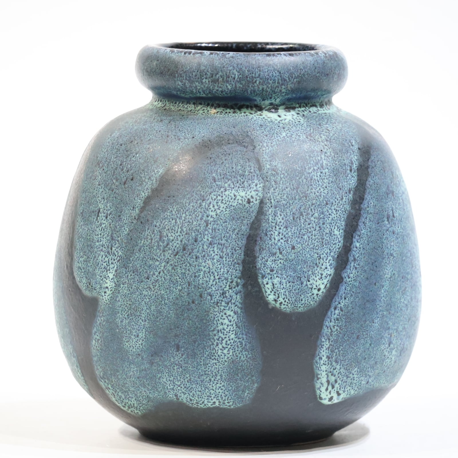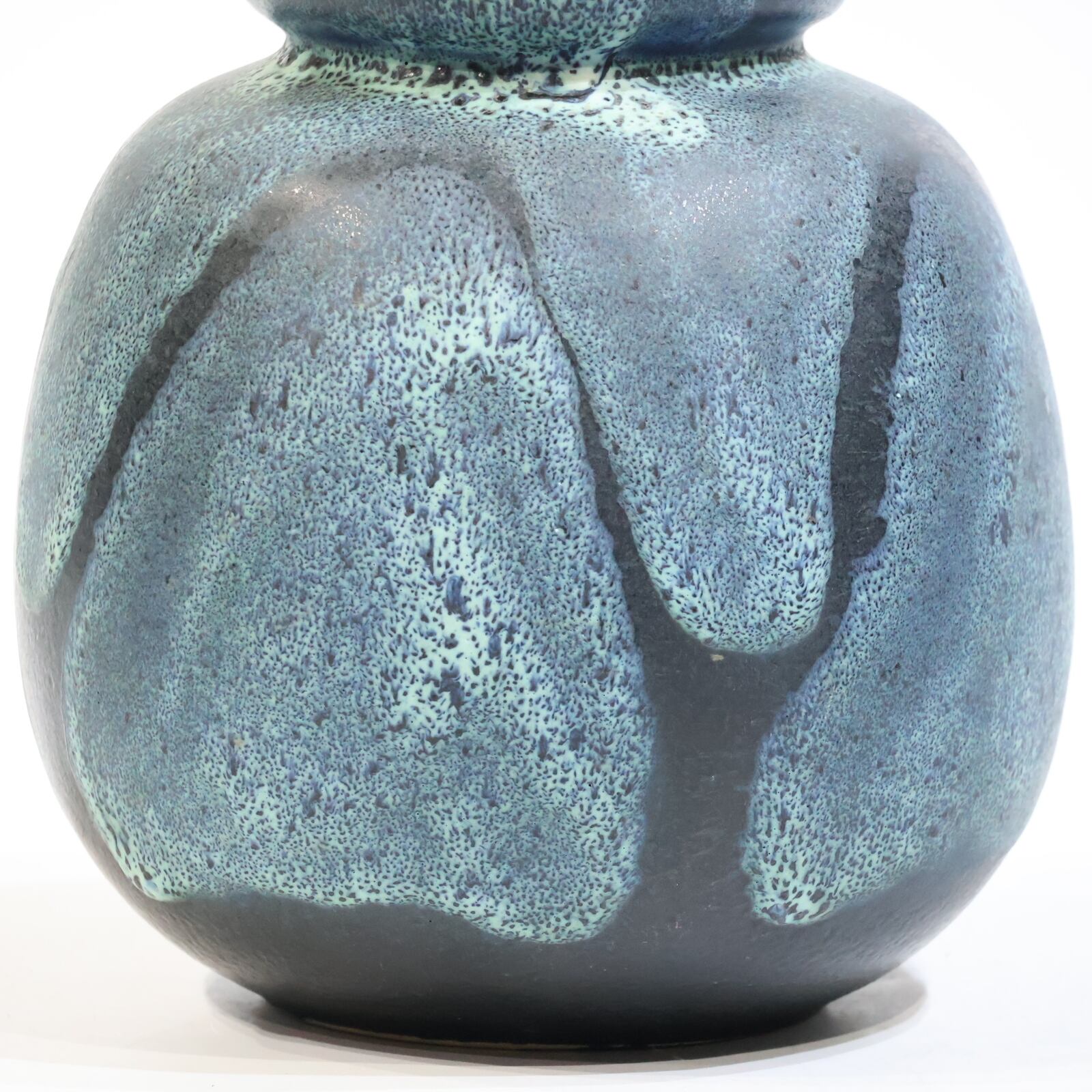 釉薬は青緑系で細かな斑点状の発色が全面に広がり、下部に向かってやや濃色へ移行しています。溶岩状に盛り上がる厚釉ではなく、マット寄りで粒立ちのある表情で落ち着きある一点です。