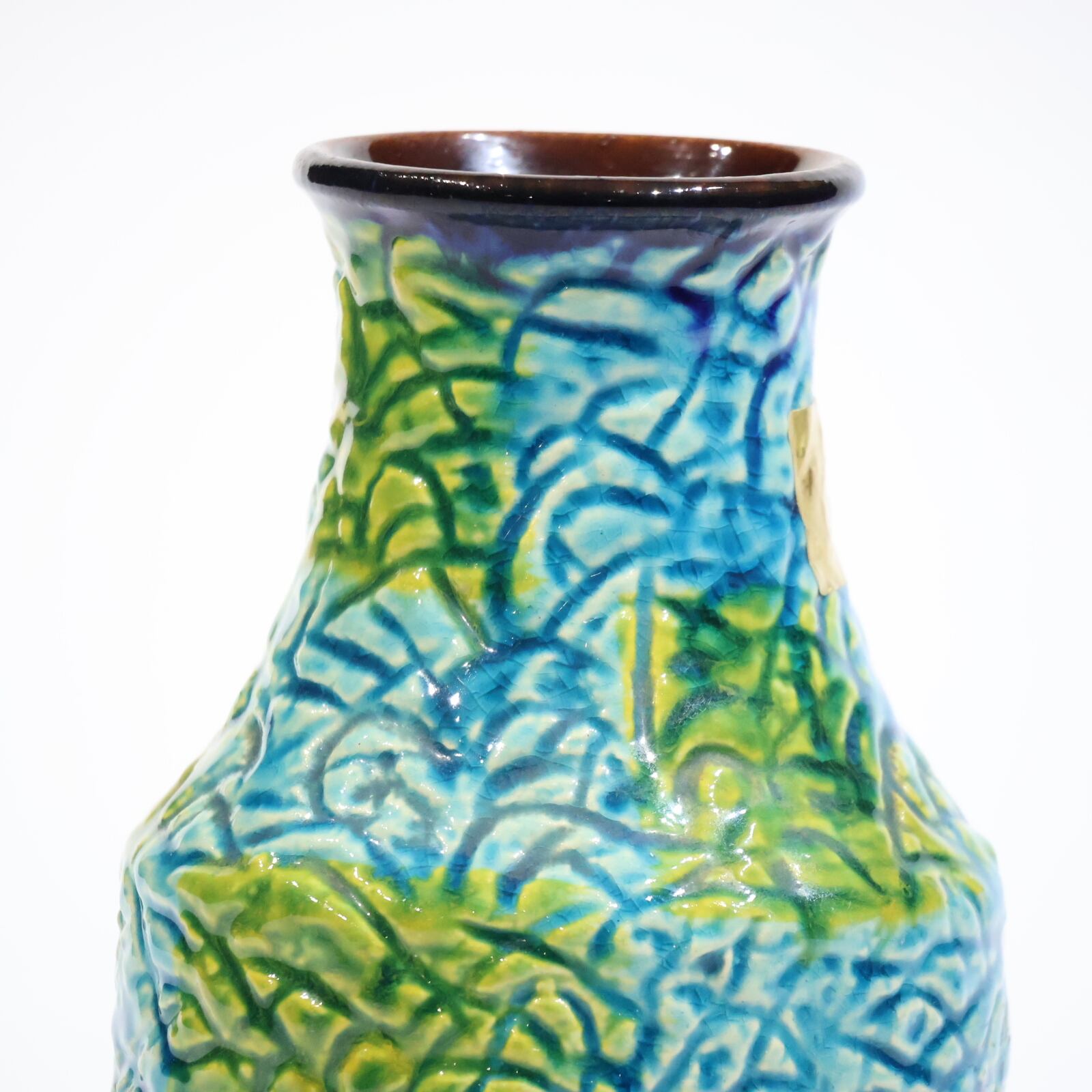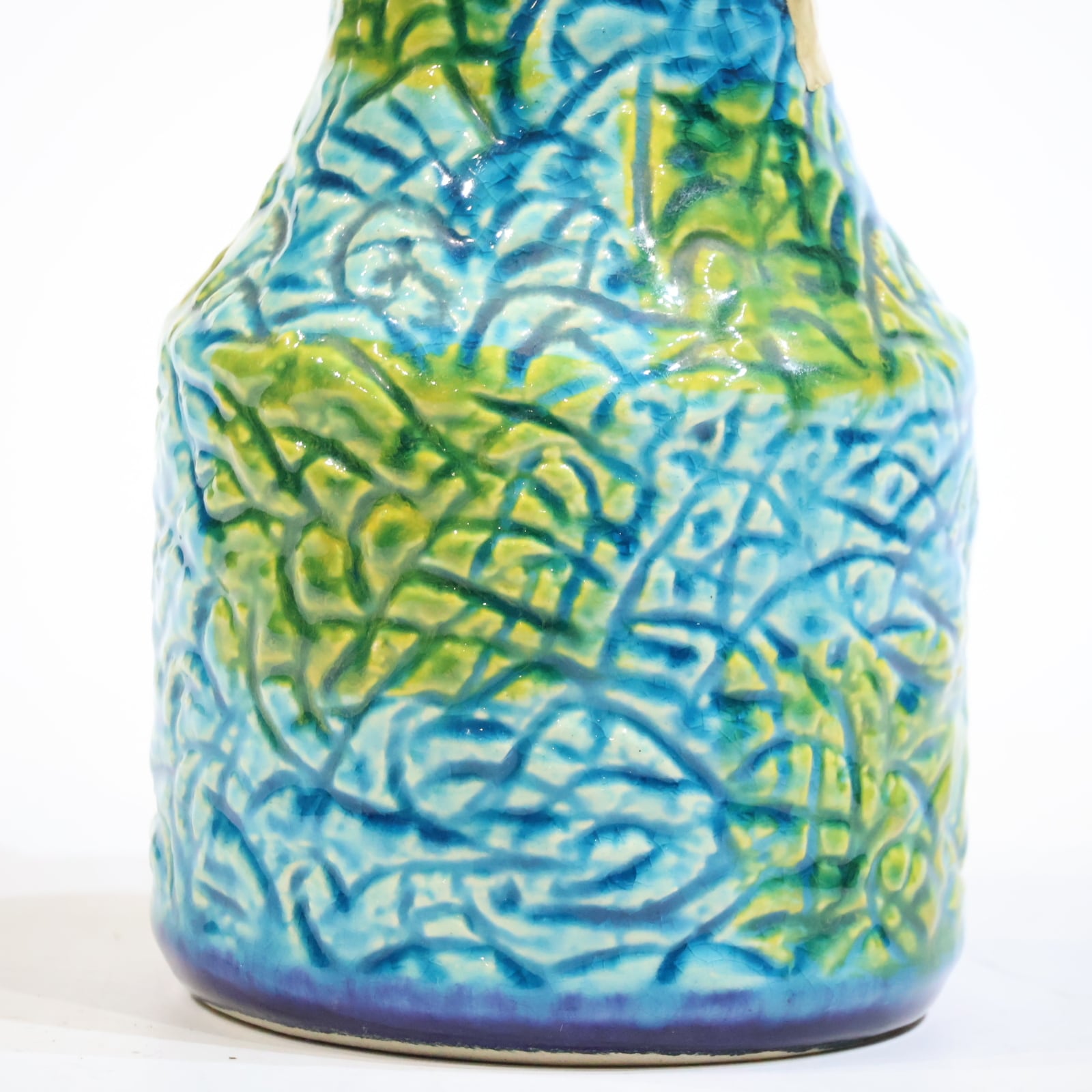 ルーを基調に、グリーンが溶け込むように重なり合う多層釉。全面に走る線刻文様が釉薬の濃淡を拾い、立体的な陰影を生み出しています。