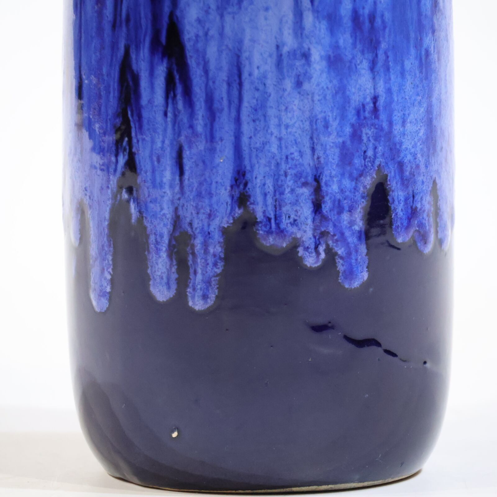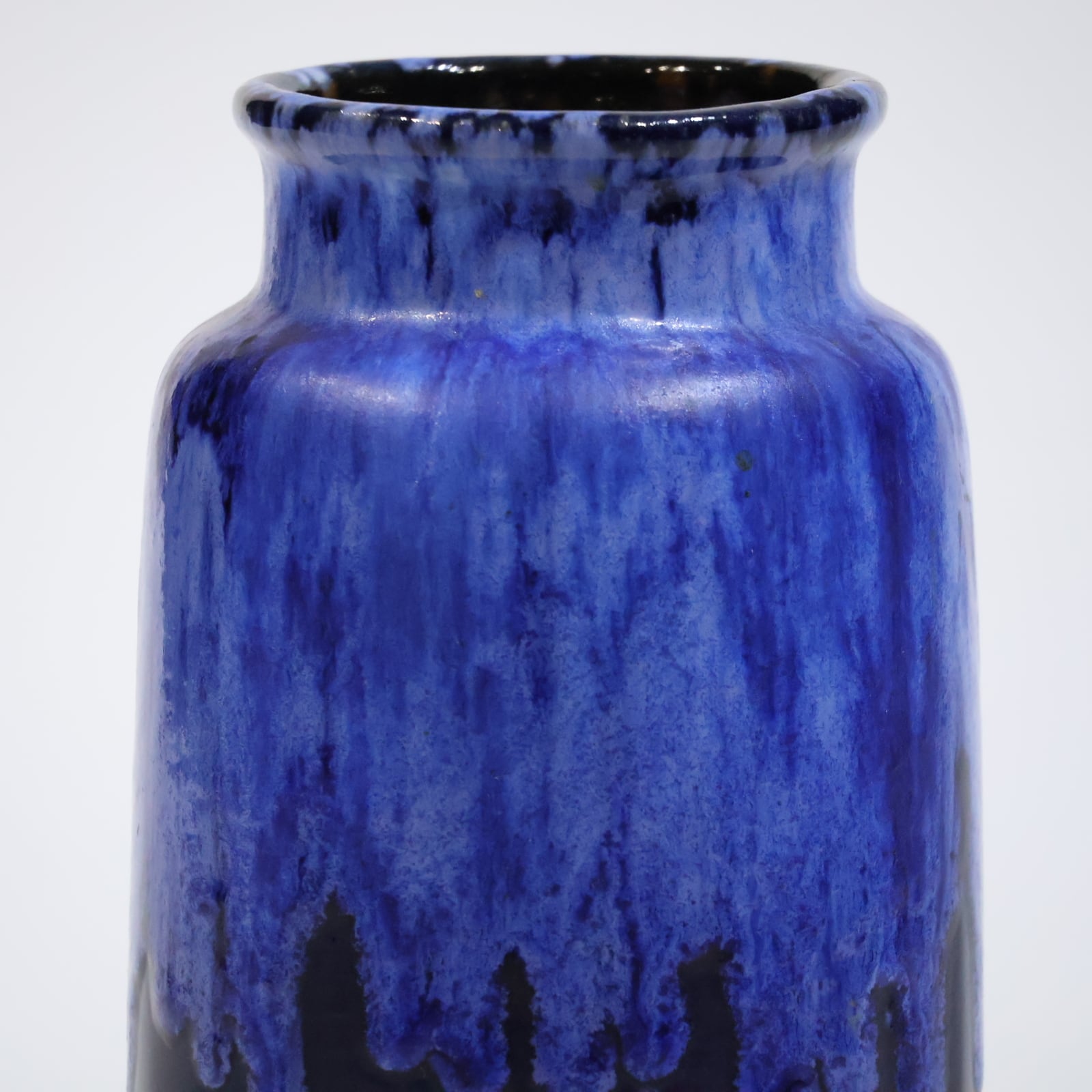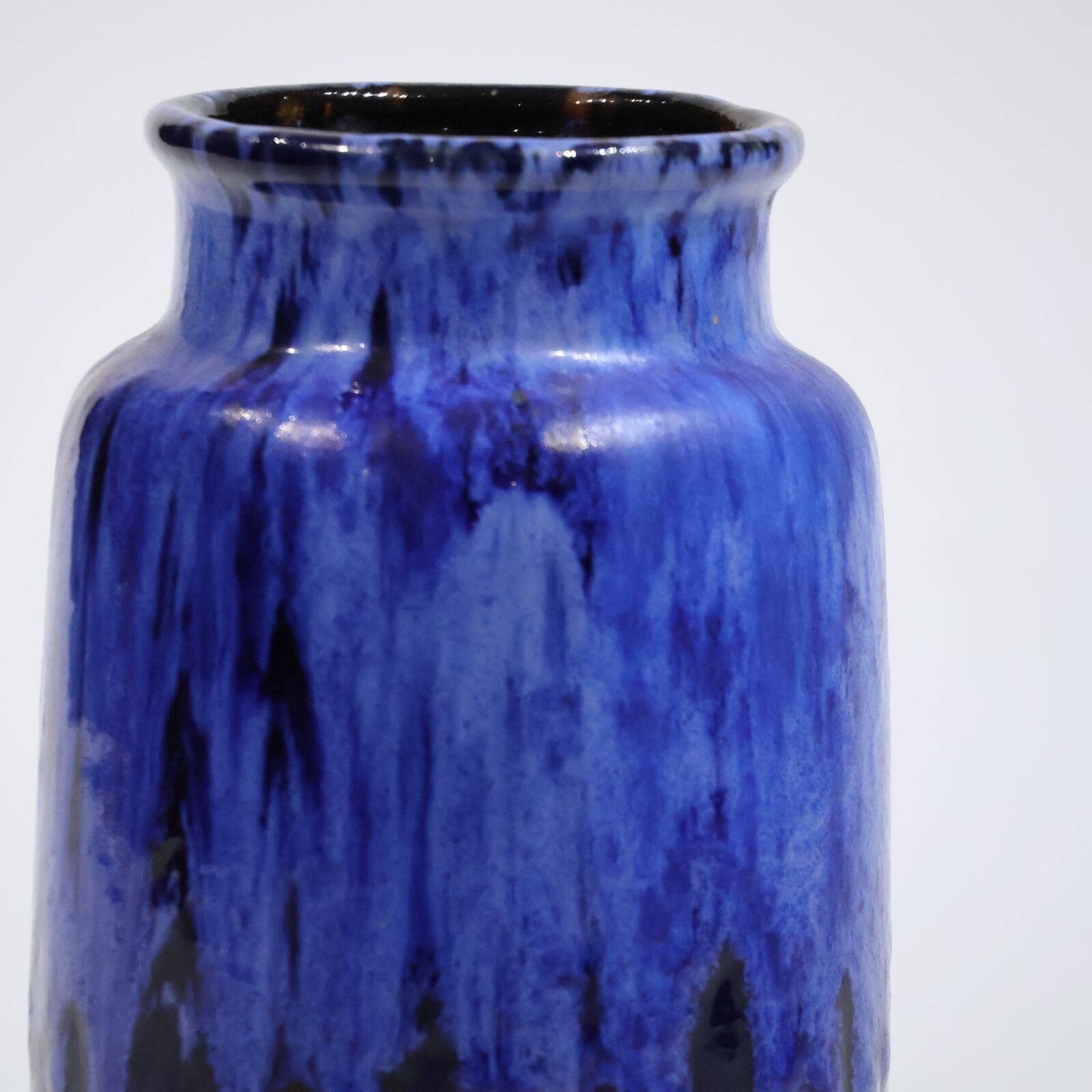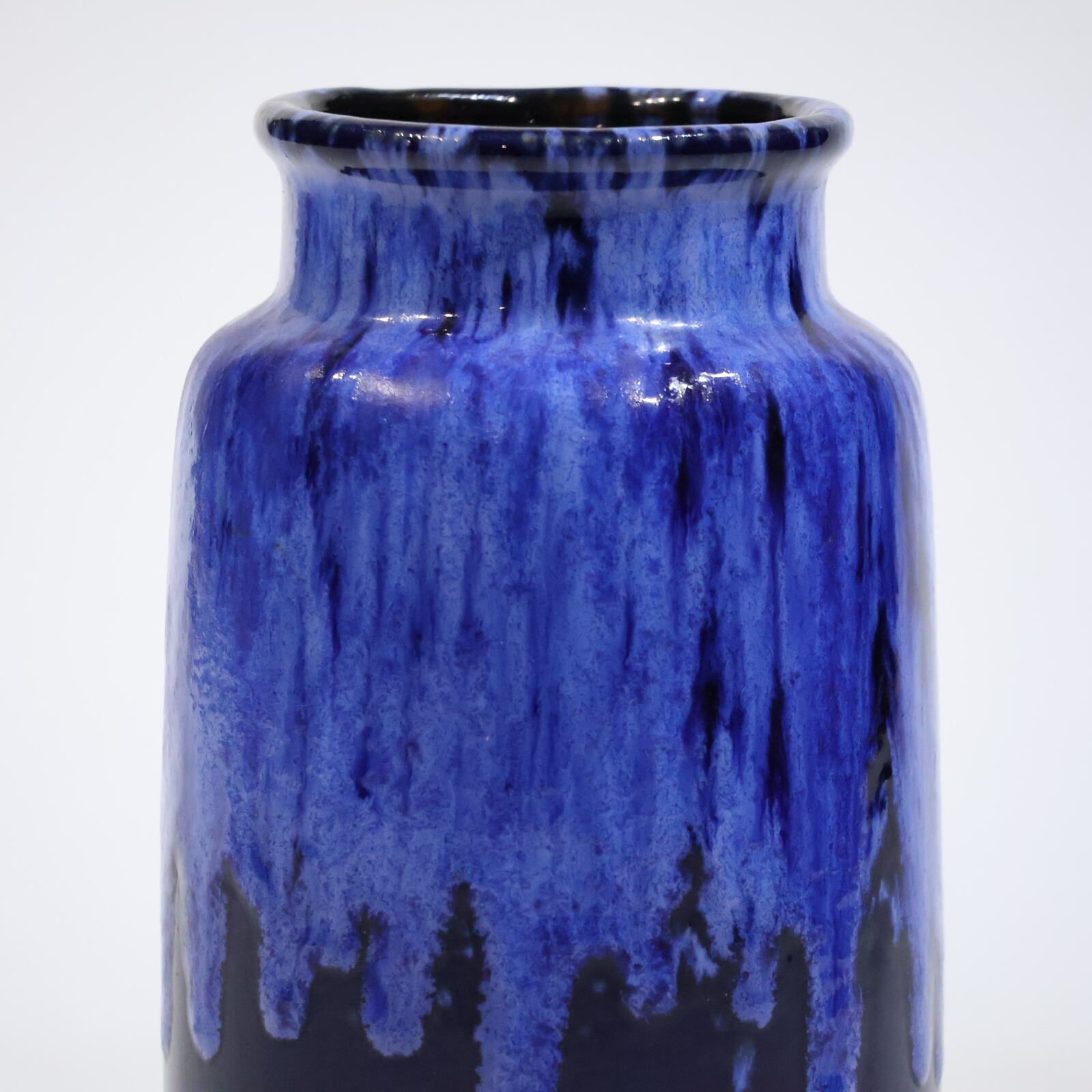 濃紺のボディに、上部から流れ落ちる青の釉が印象的な一点。