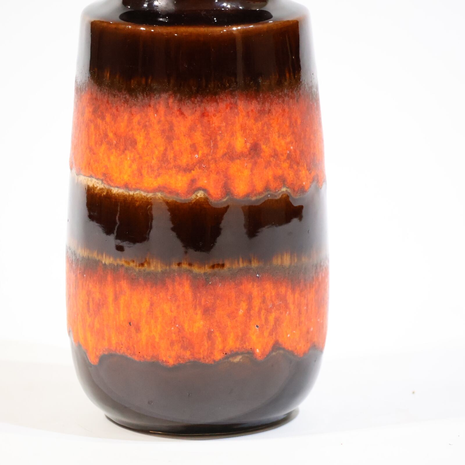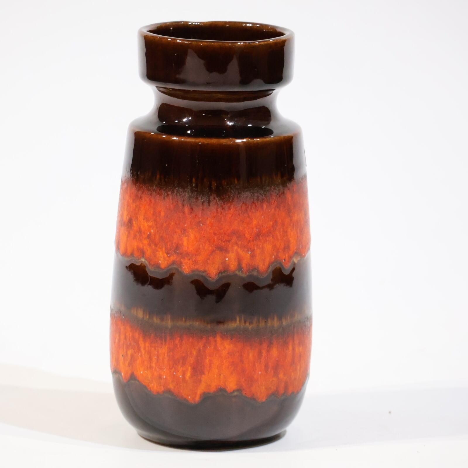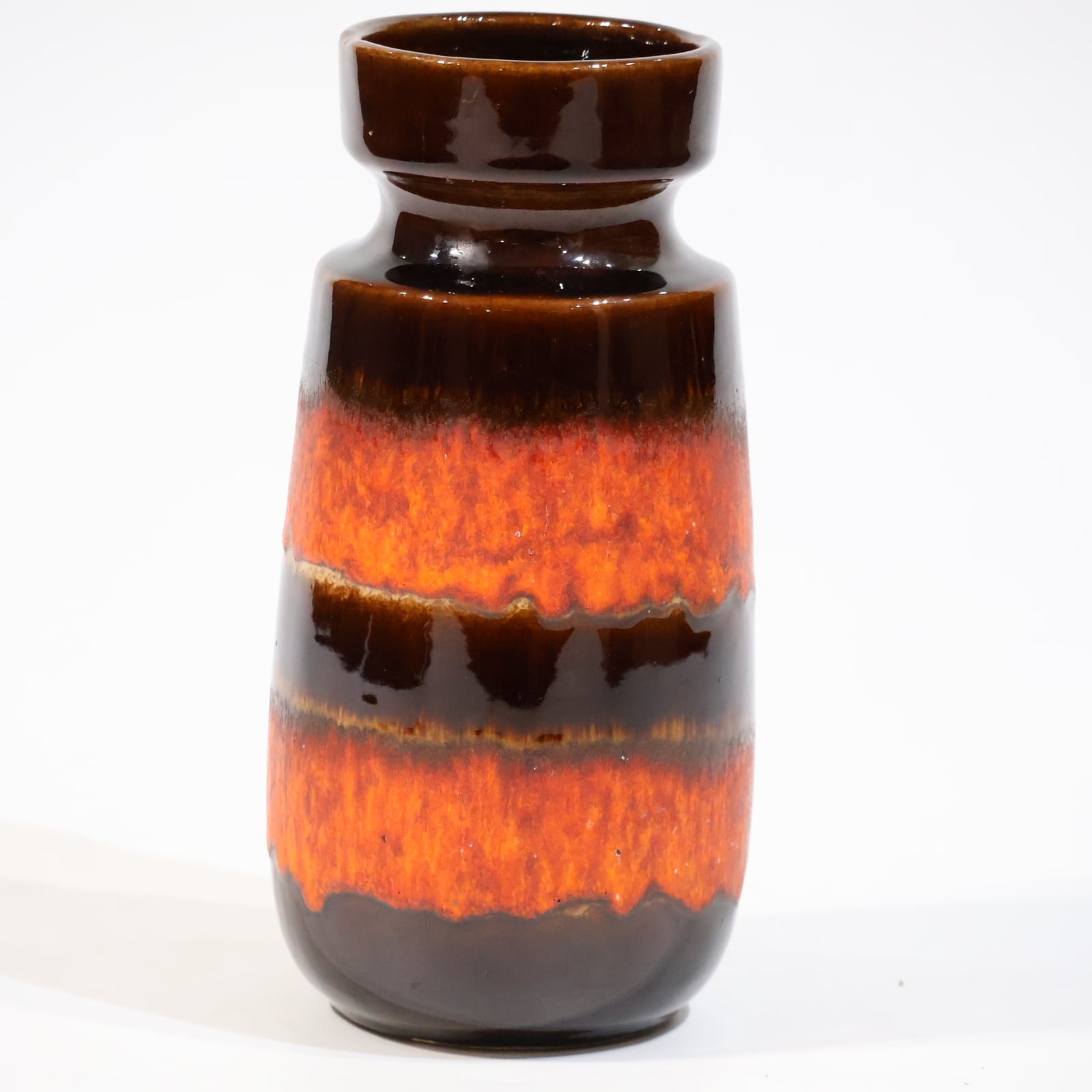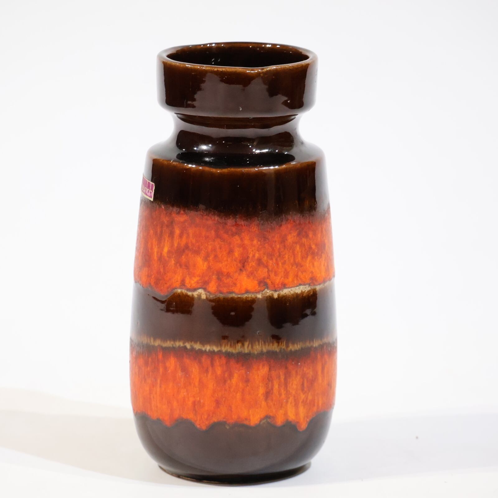 同社は急速に成長し、1950~80年代には陶 器製造の分野でドイツ最大のメーカーとなり、今日も確固たる地位を維持しています。形状に加えて釉薬でも、当時は最も幅広い品揃えを誇った他、輸出量も最大だったため、現在でも同社の製品はよく見られます。特に円筒形を基調にし たシンプルな形状で、型押し模様のある床置き 花瓶が代表的。色彩については当時主流だっ た赤やオレンジから、クリーム、ベージュ、茶色 などが多くを占めています。