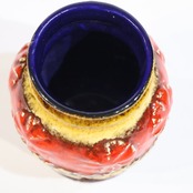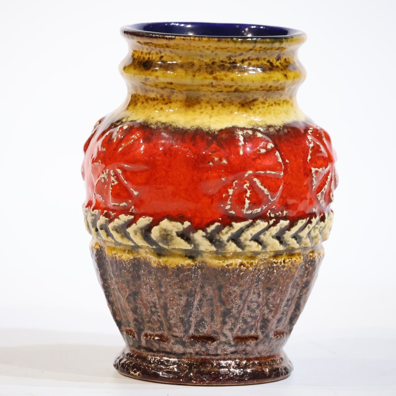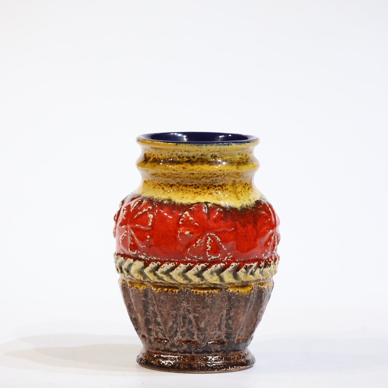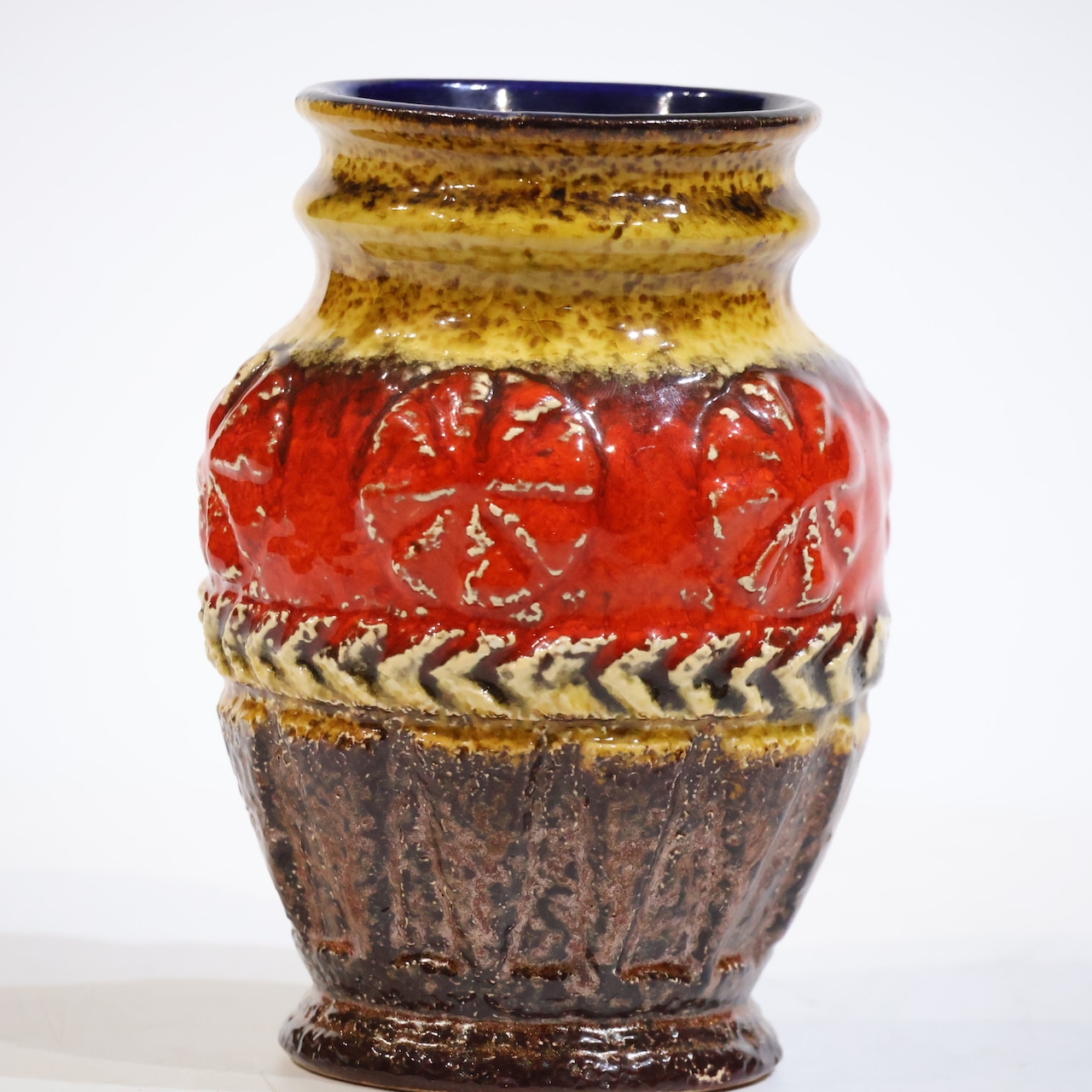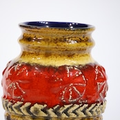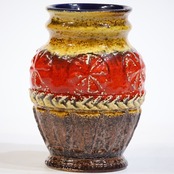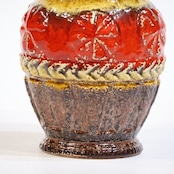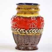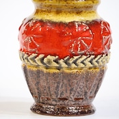 1960年代からのスタイルとしては、 当時広く流行していた色彩の釉薬(マットまたは 光沢あり)を使用し、シンプルなフォルムの上に様 式化した花の図柄の型押しや幾何学模様をあし らったものが多く、Scheurichのも のと混同されがちです。