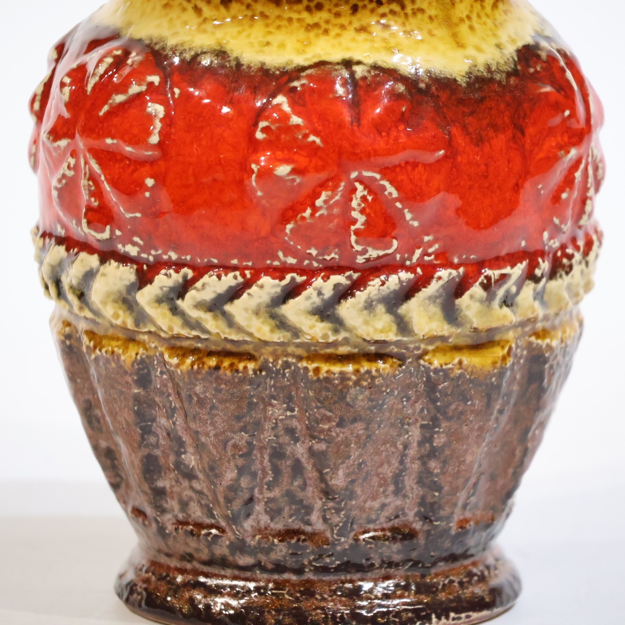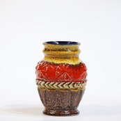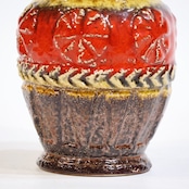 ボディ上部には艶やかなレッドが帯状にめぐり、押し型による葉のレリーフが浮かび上がっています。その上には蜂蜜のような黄色の釉薬が垂れるように重なり、陰影と奥行きを演出。中央にはジグザグ模様のレリーフが帯状に入り、下部はマットで質感のあるブラウンにはところどころラメのような光沢感があり、ユニークな仕上がりになっています。