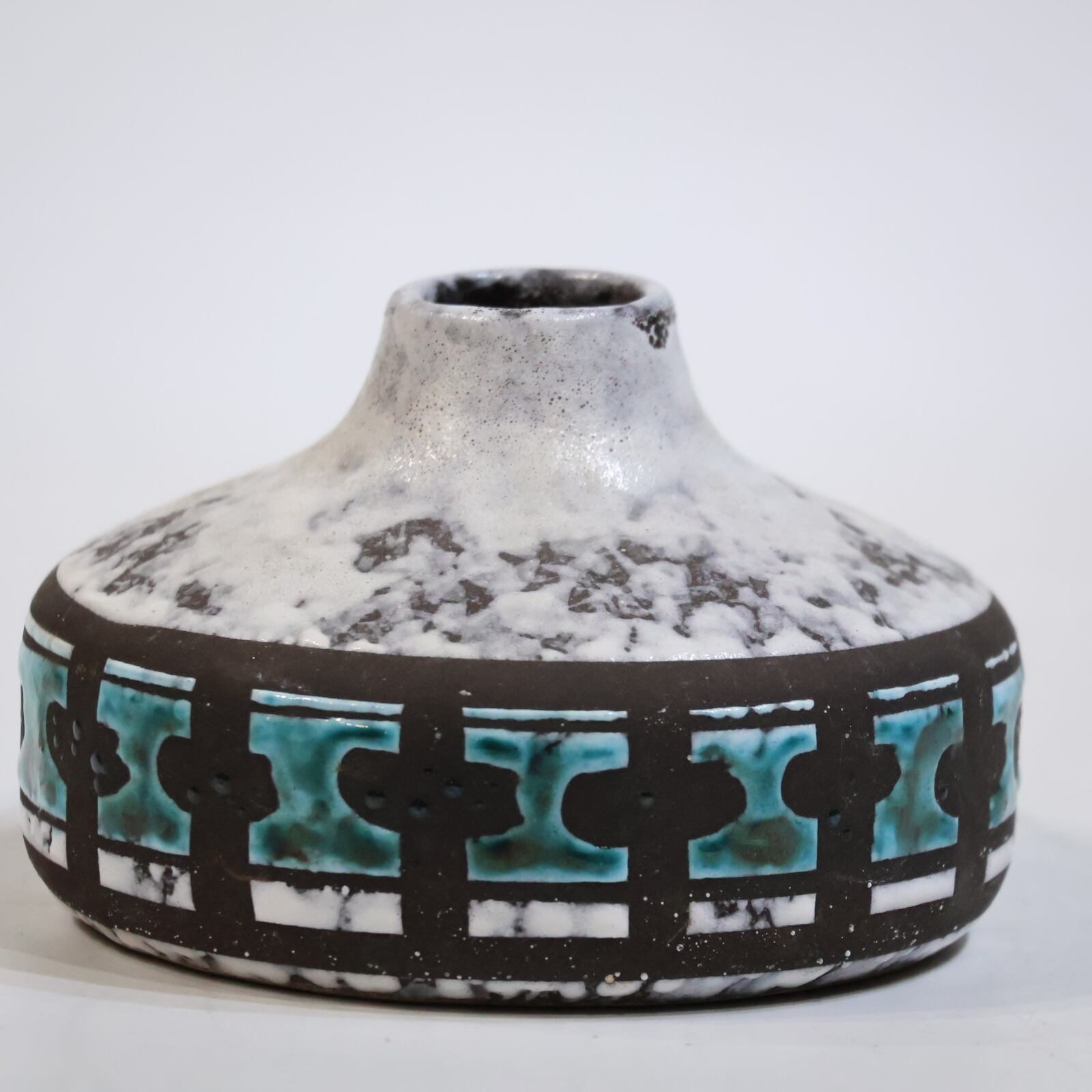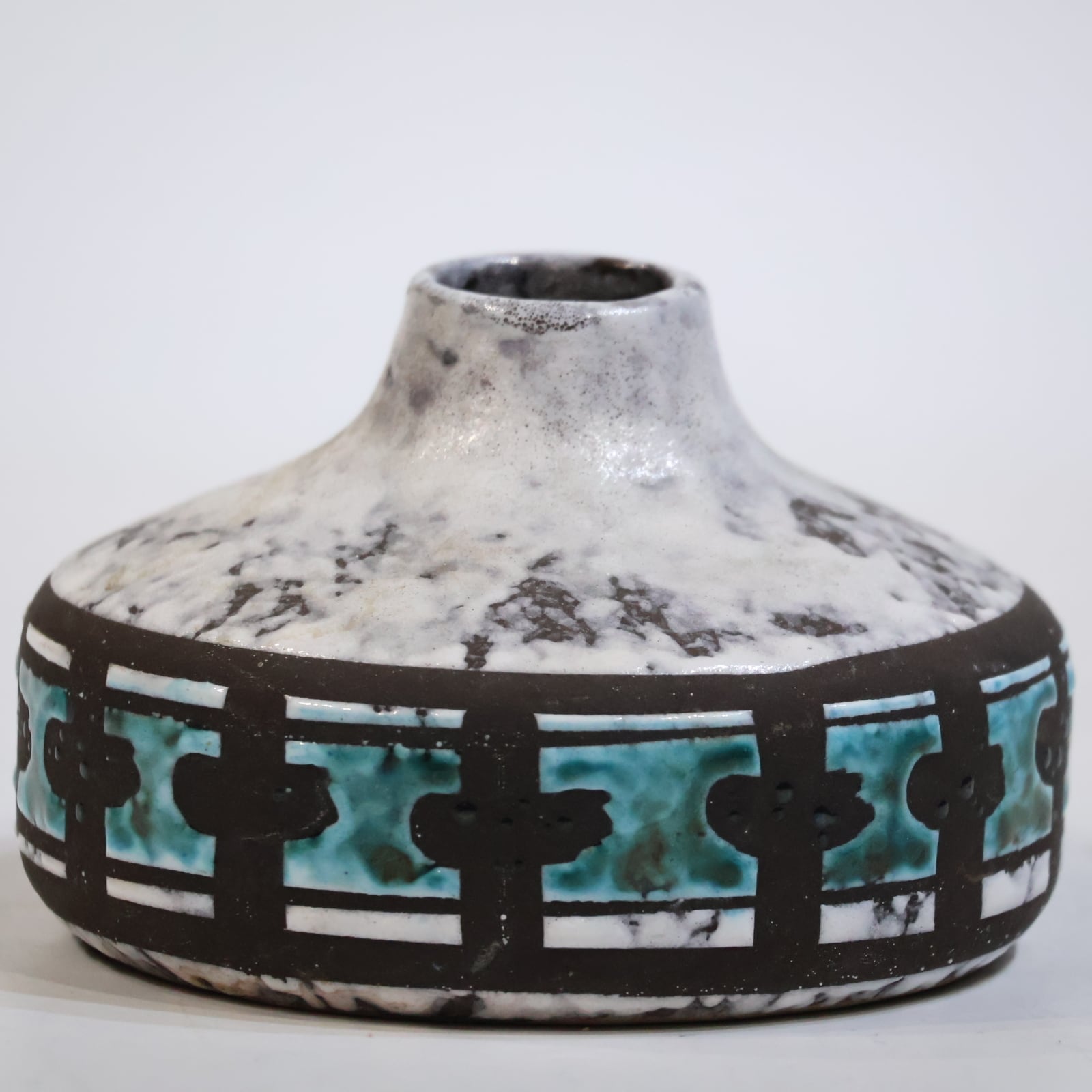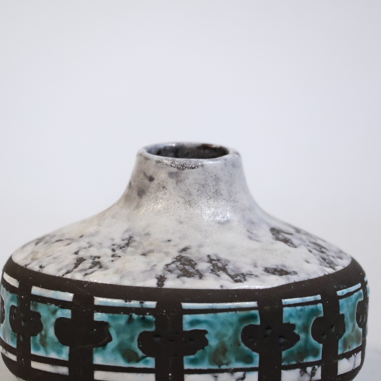 黒を基調に、白とターコイズの釉薬が織りなすコントラストが美しい一点。肩からボディにかけてはマットな釉薬が施され、まるで石のような質感を感じさせます。一方、胴部をぐるりと囲む幾何学的な装飾帯は、アフリカの民族文様を彷彿とさせるようなリズム感あるデザインで、艶やかな釉薬が立体的な奥行きを演出しています。