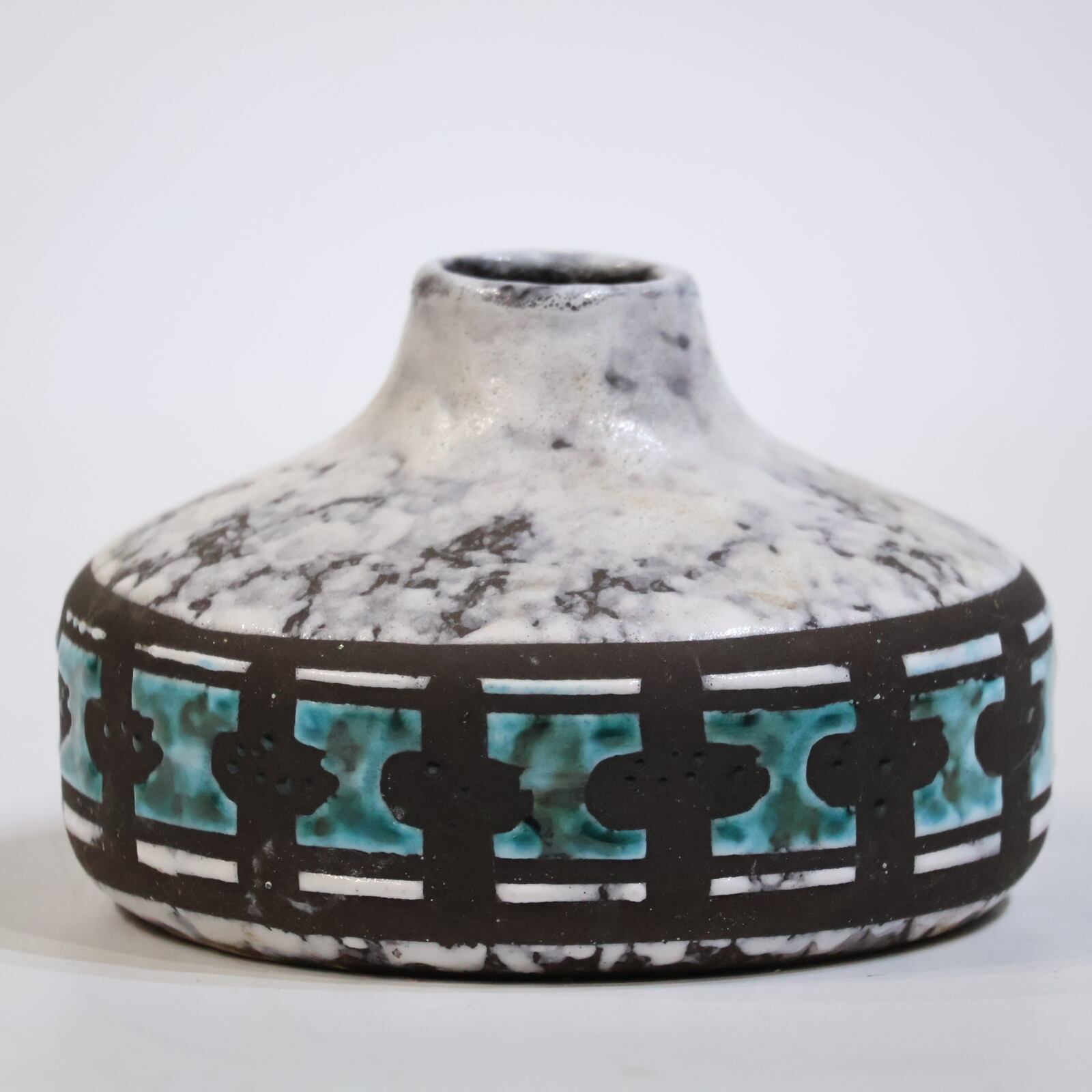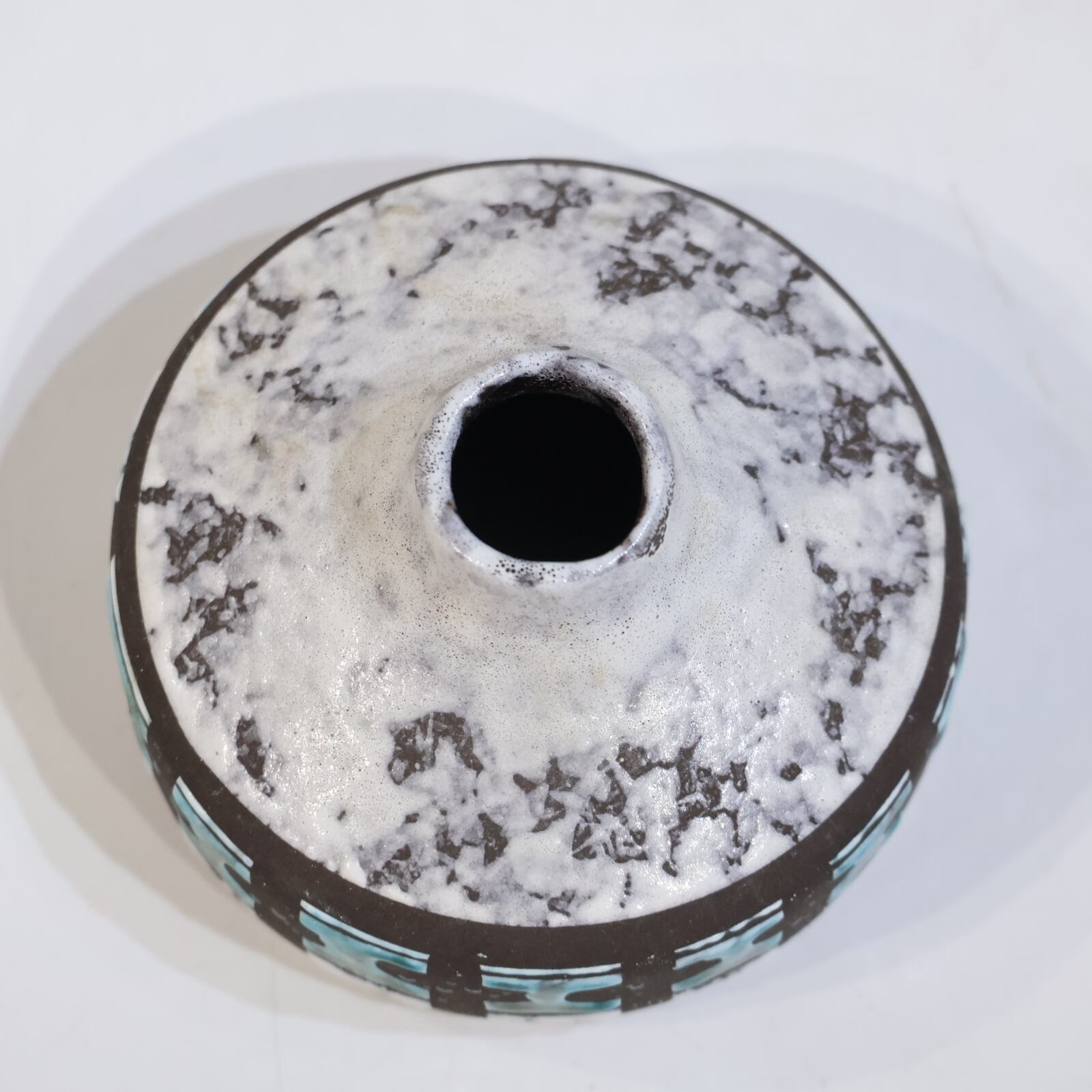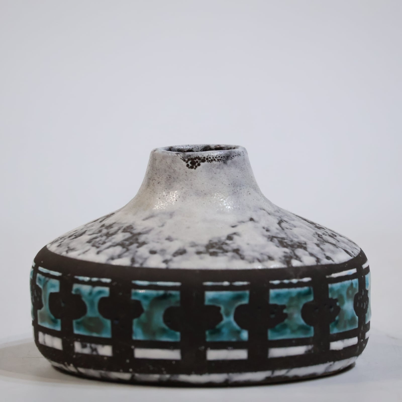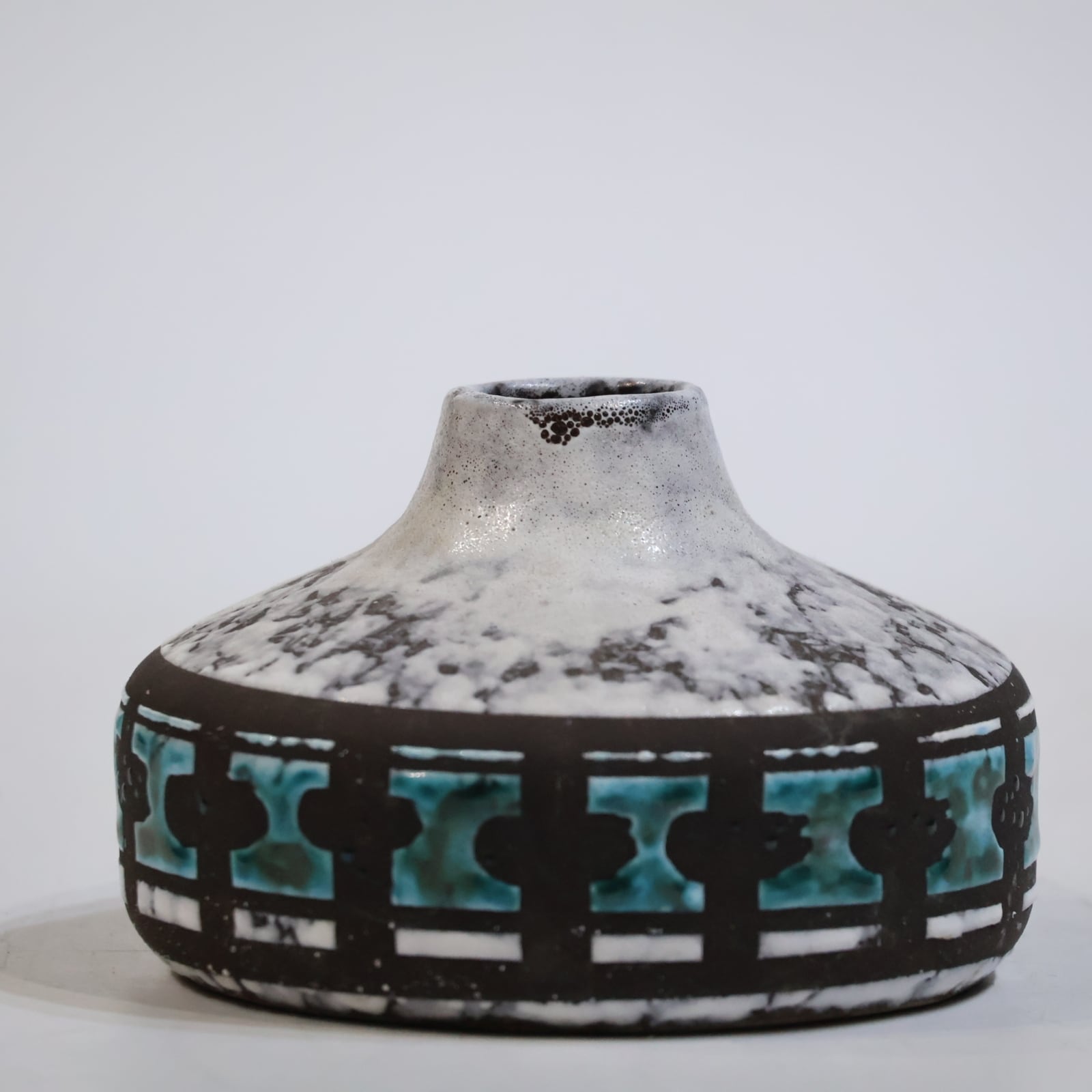 黒を基調に、白とターコイズの釉薬が織りなすコントラストが美しい一点。肩からボディにかけてはマットな釉薬が施され、まるで石のような質感を感じさせます。一方、胴部をぐるりと囲む幾何学的な装飾帯は、アフリカの民族文様を彷彿とさせるようなリズム感あるデザインで、艶やかな釉薬が立体的な奥行きを演出しています。