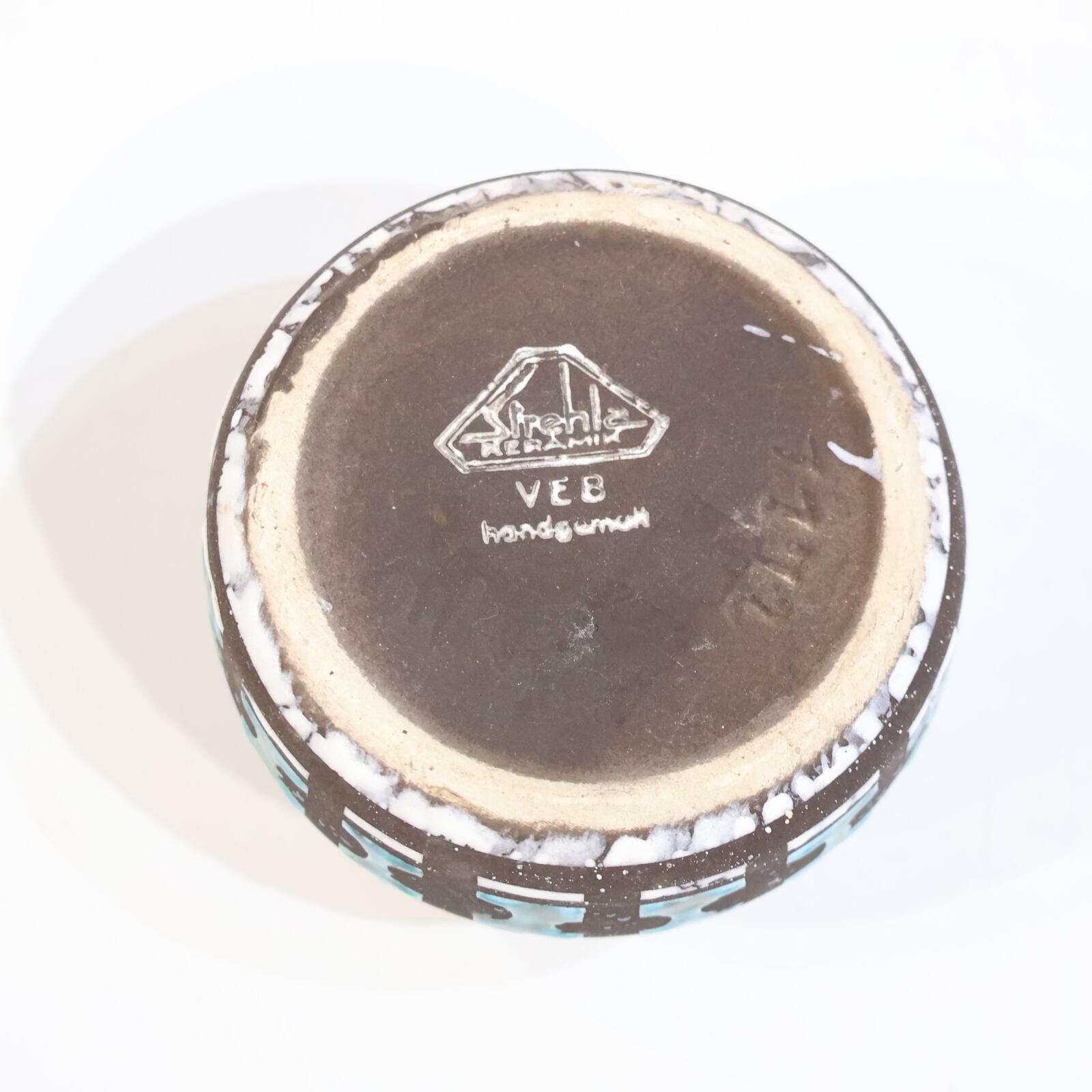 Strehlaの作品は、60年代後半から70年代にかけて、手作業で追加されたチューブで裏打ちされたFat Lava釉薬を使用した装飾によって特徴づけられました。ほとんどの作品には「Strehla」と刻印されたインクが刻印されており、ベースには型番が刻印されています。おそらく生産の多くが輸出されたので、アイテムは西ドイツの商品よりドイツで見つけるのが難しいです。