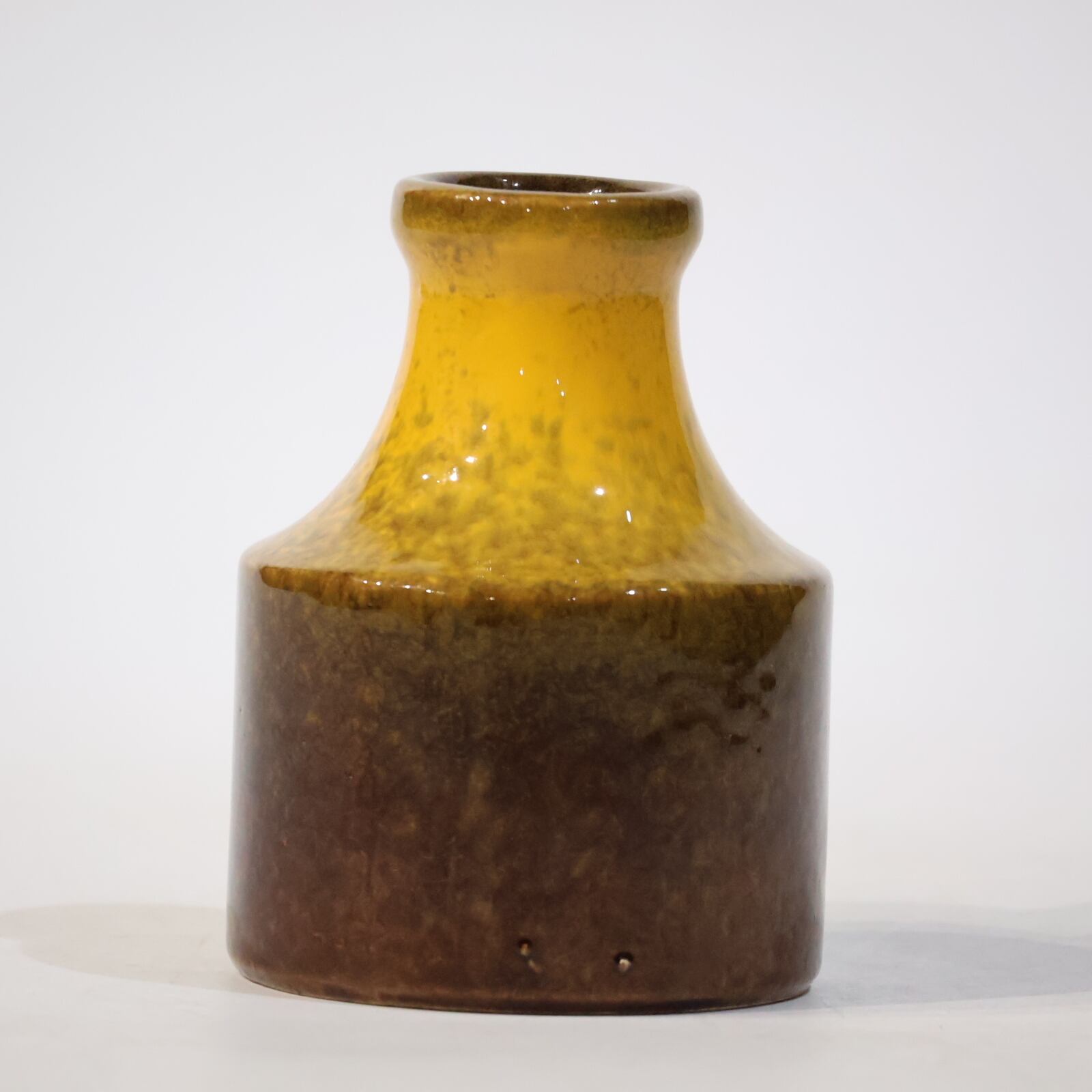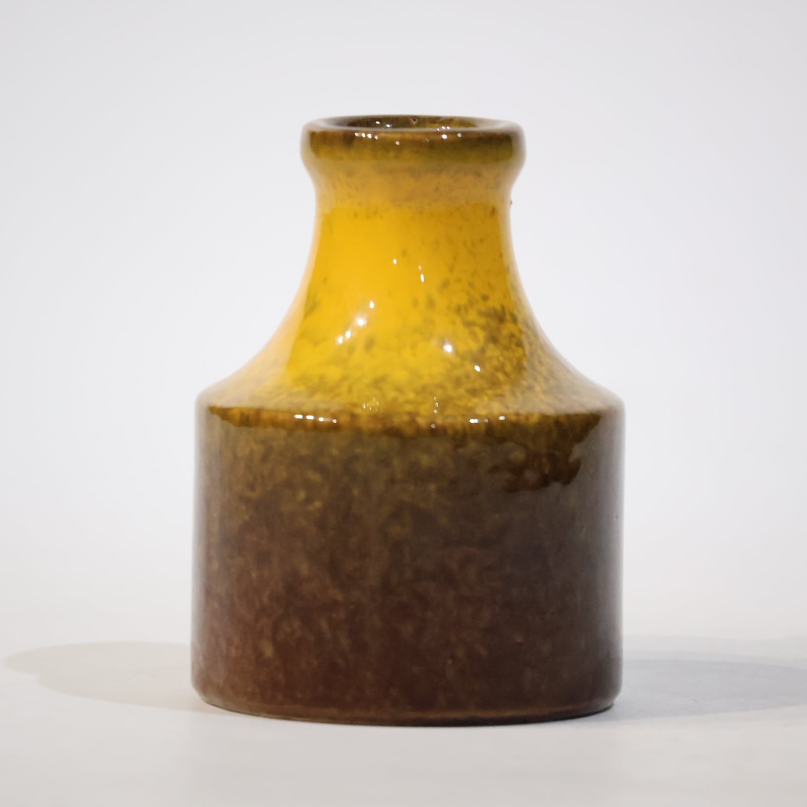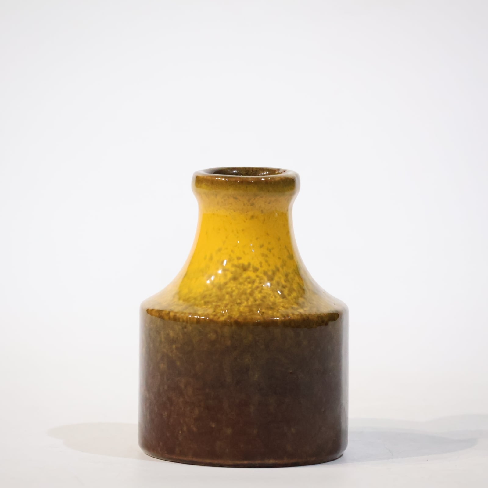 イエローからブラウンへと溶ける釉調の細かな斑が効いており、小ぶりながら存在感があります。卓上や棚の余白に置くと、ぐっと空気が締まりますね。