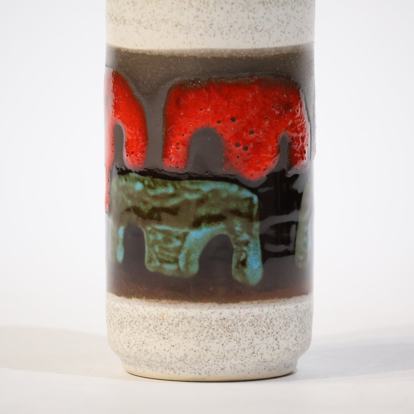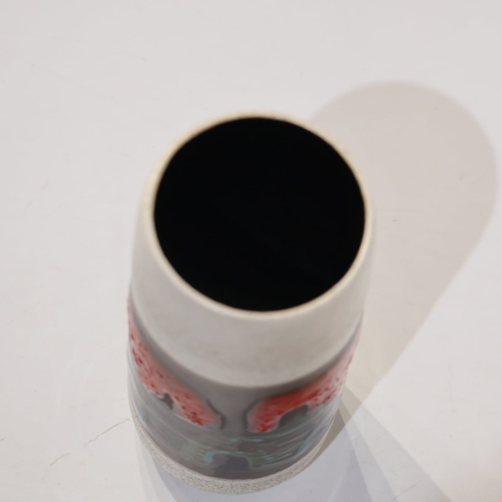上下はマットな白釉でまとめられており、その中央にぐるりと一周するように施された装飾帯には、赤と緑のアーチ状のモチーフが立体的に浮かび上がっています。