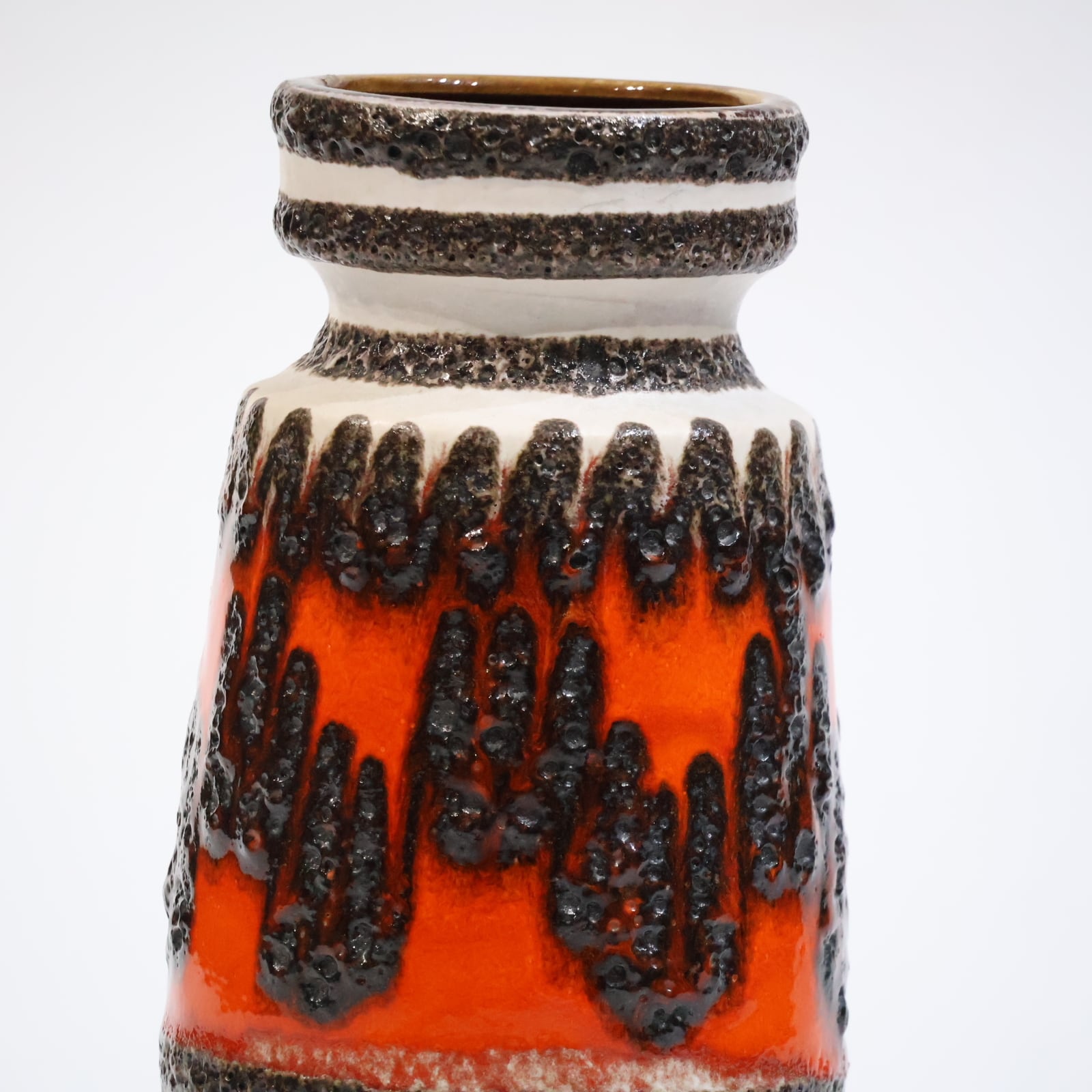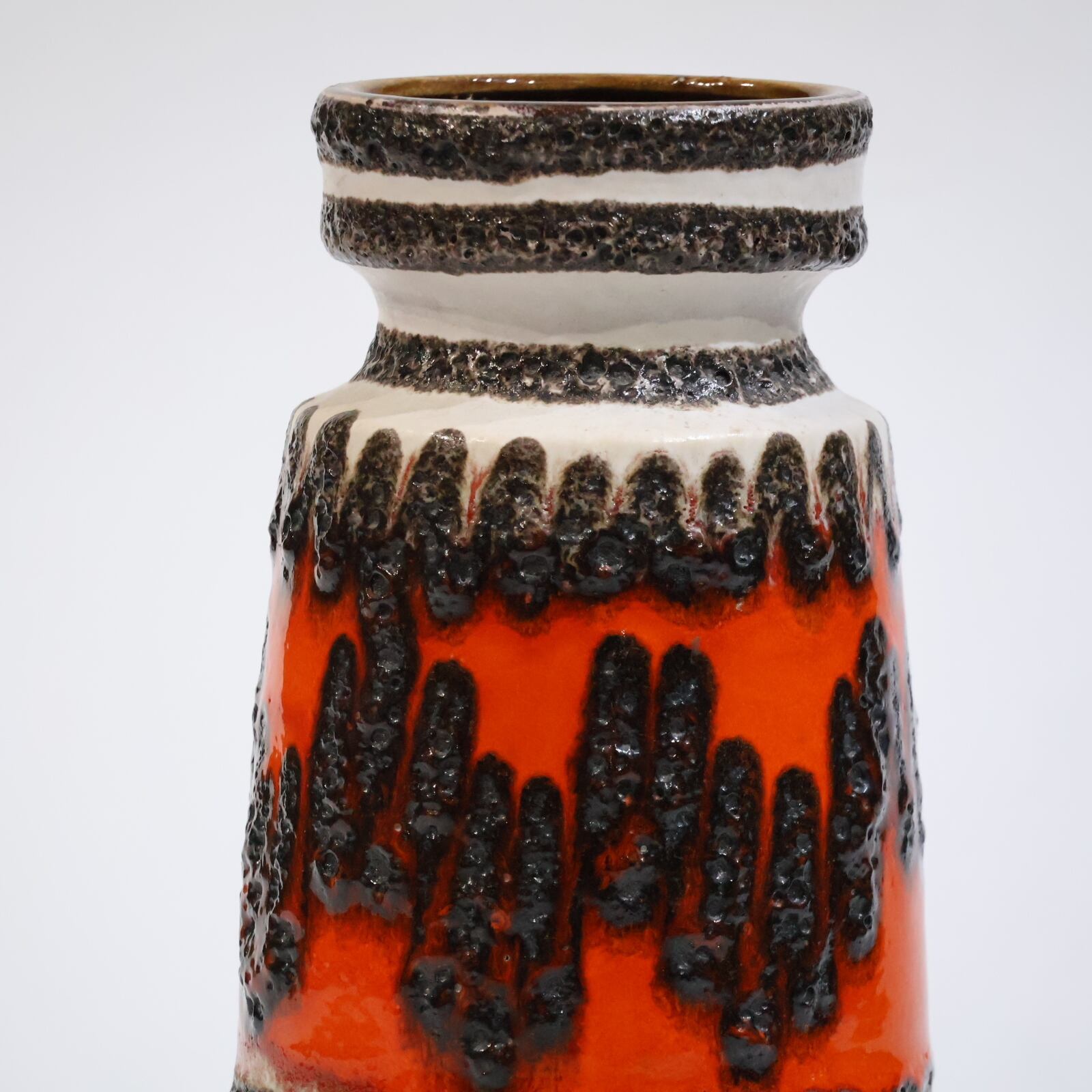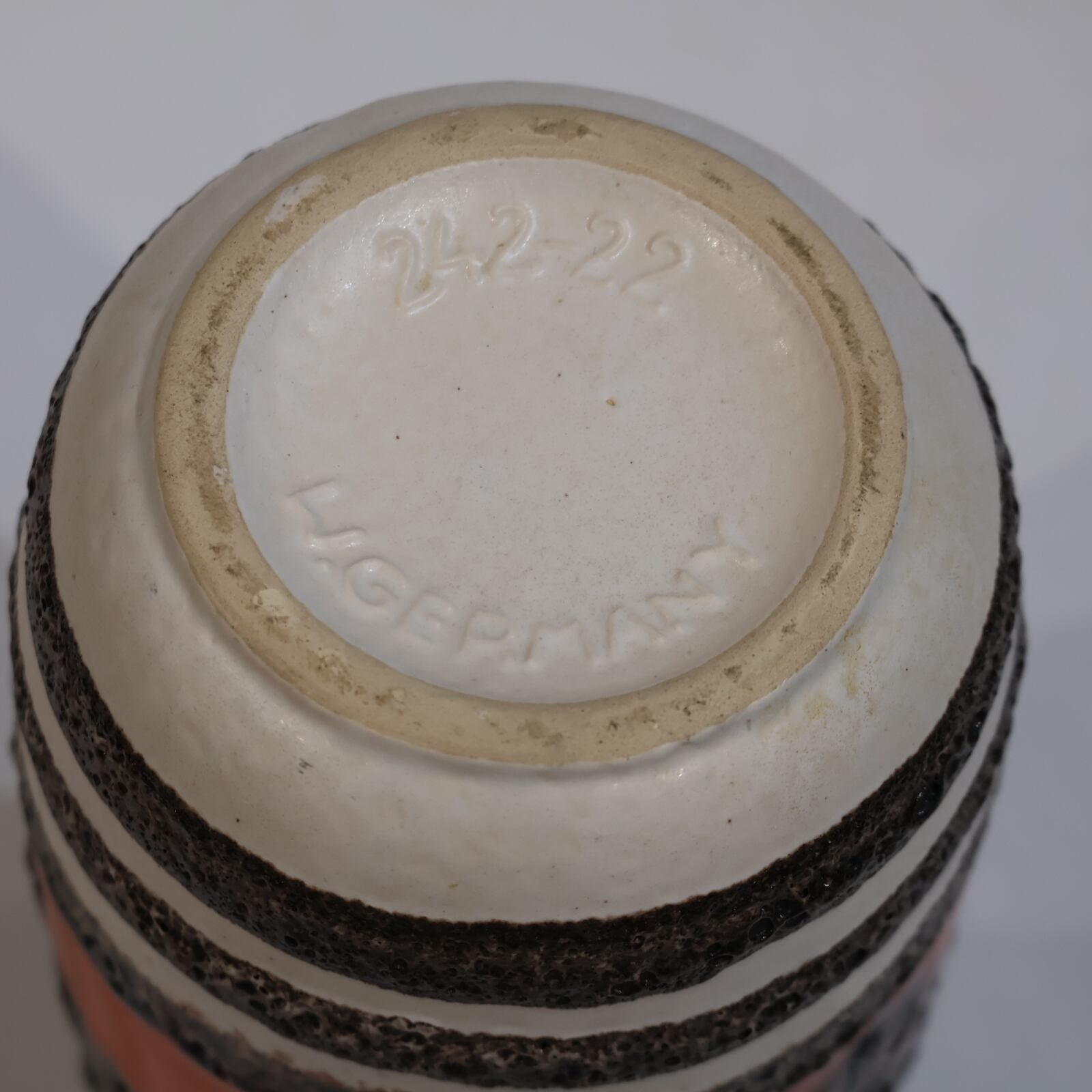 同社は急速に成長し、1950~80年代には陶 器製造の分野でドイツ最大のメーカーとなり、今日も確固たる地位を維持しています。形状に加えて釉薬でも、当時は最も幅広い品揃えを誇った他、輸出量も最大だったため、現在でも同社の製品はよく見られます。特に円筒形を基調にし たシンプルな形状で、型押し模様のある床置き 花瓶が代表的。色彩については当時主流だっ た赤やオレンジから、クリーム、ベージュ、茶色 などが多くを占めています。
