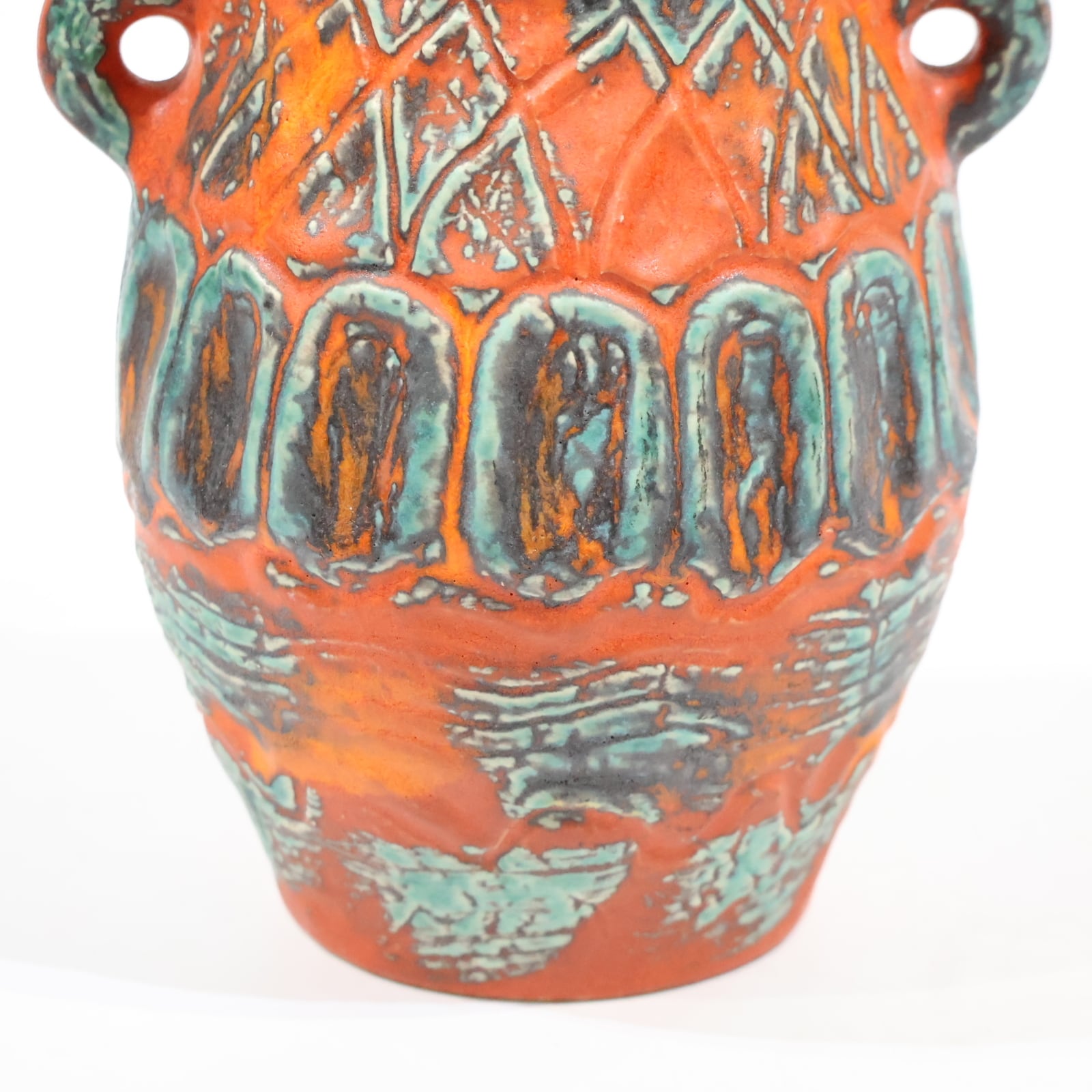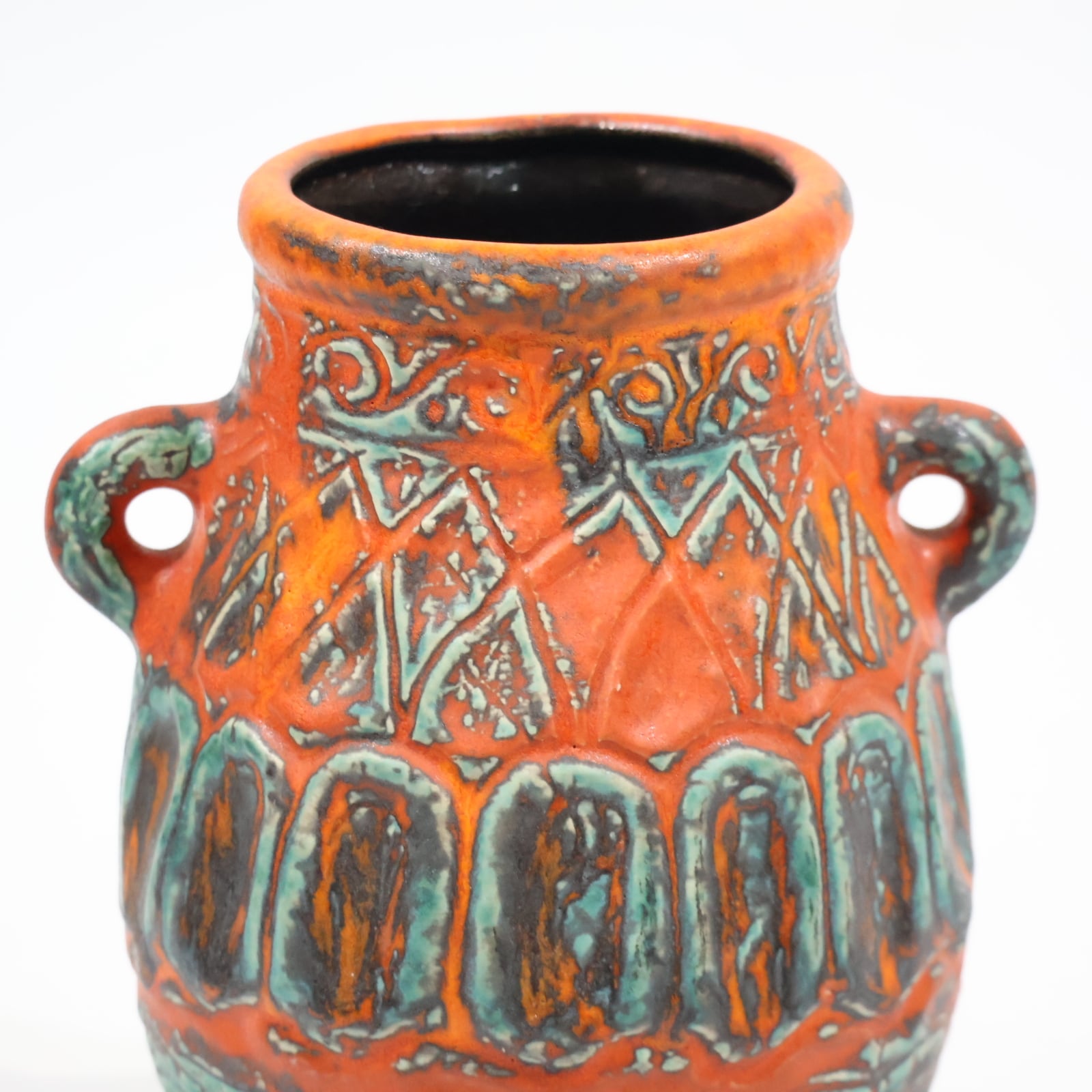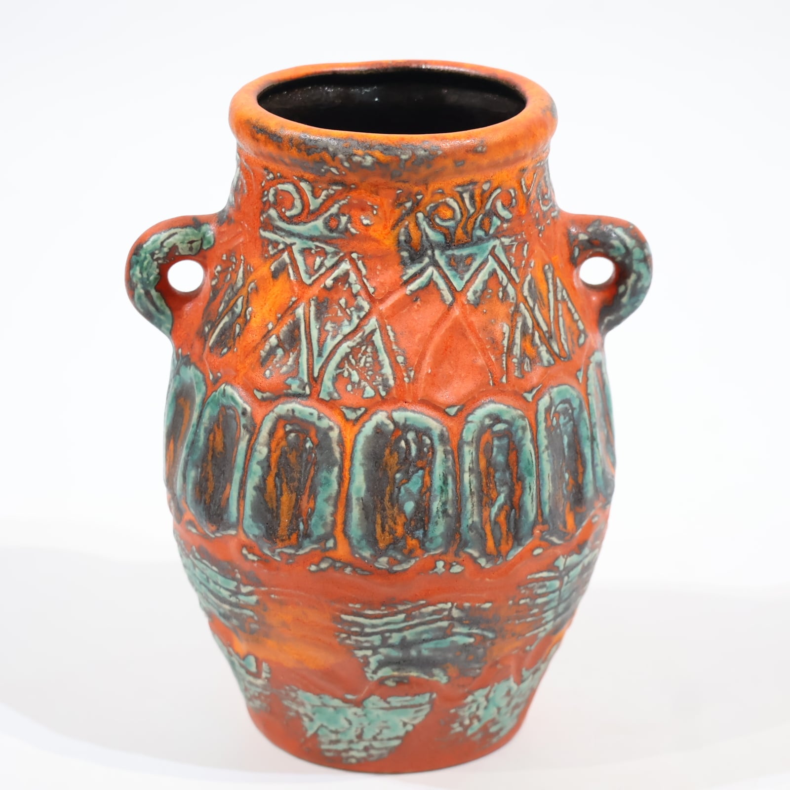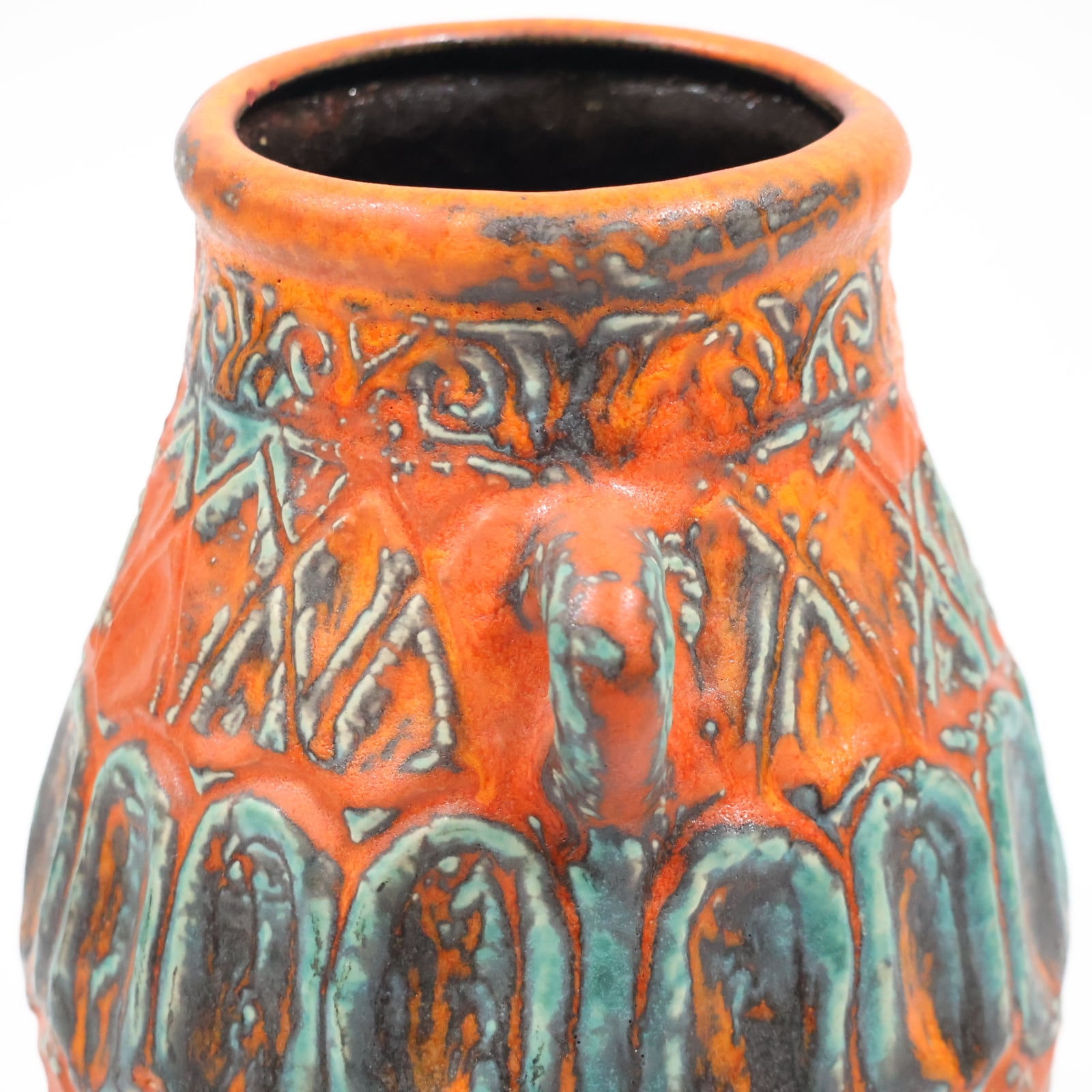 鮮やかなテラコッタオレンジの地肌に、ターコイズブルーとダークブラウンの釉薬が大胆にあしらわれた一品。彫り模様には幾何学的なラインと抽象的なパターンが交差し、リズミカルな構成を見せています。