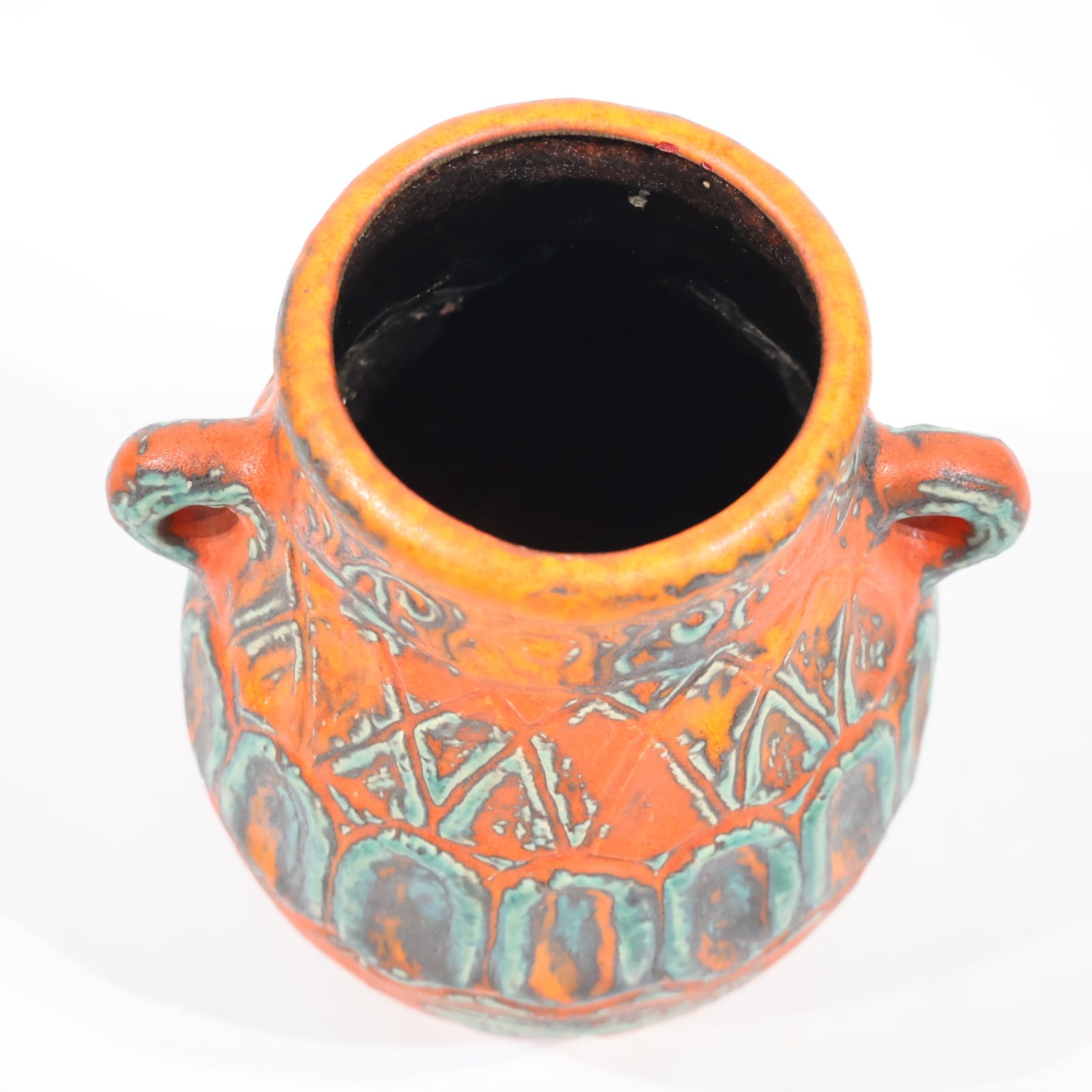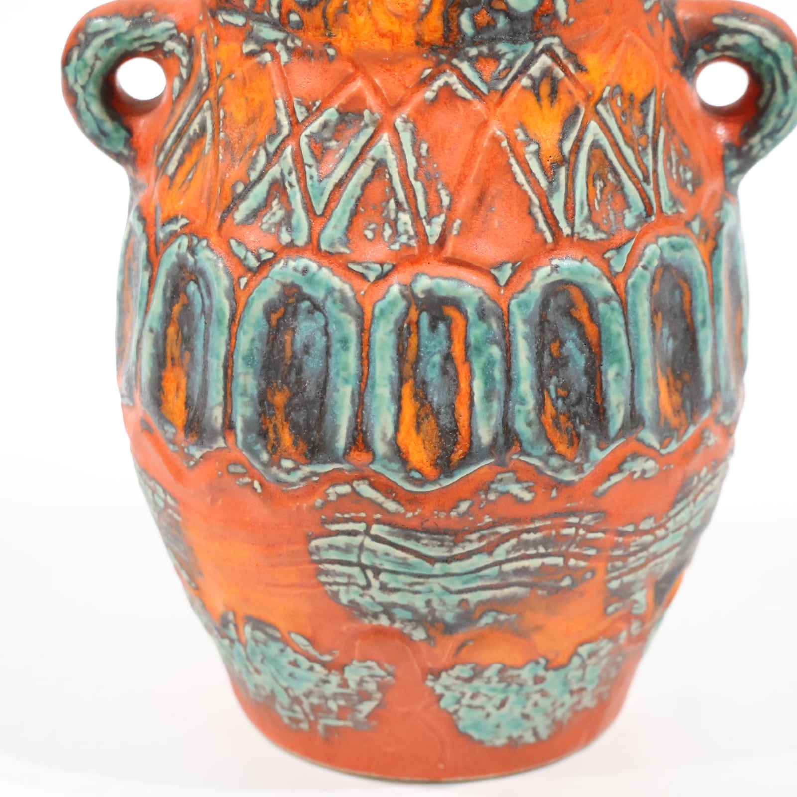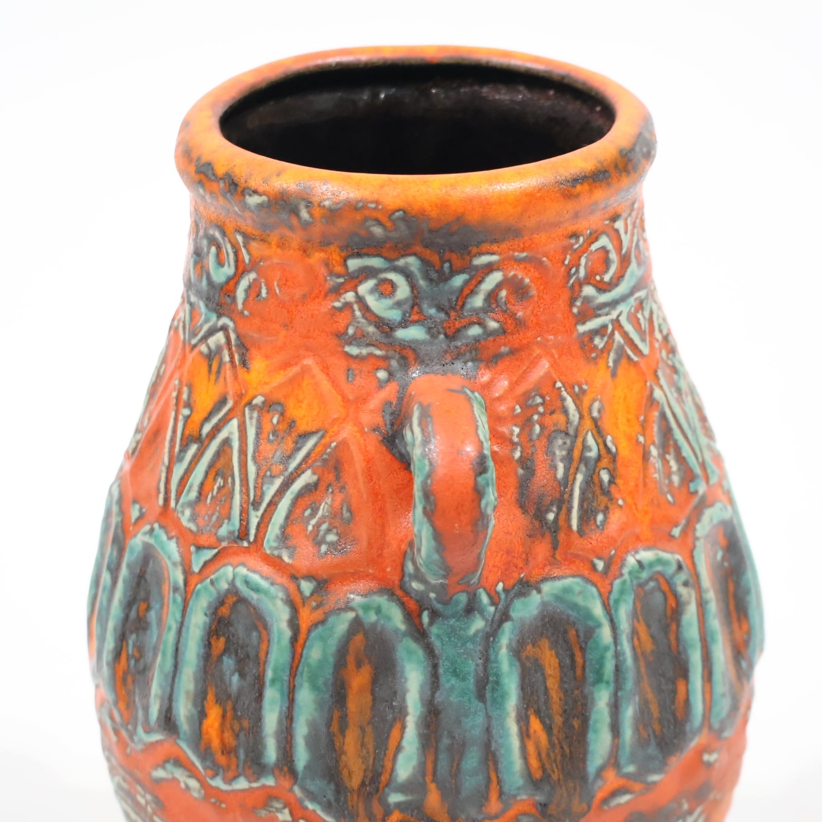鮮やかなテラコッタオレンジの地肌に、ターコイズブルーとダークブラウンの釉薬が大胆にあしらわれた一品。彫り模様には幾何学的なラインと抽象的なパターンが交差し、リズミカルな構成を見せています。