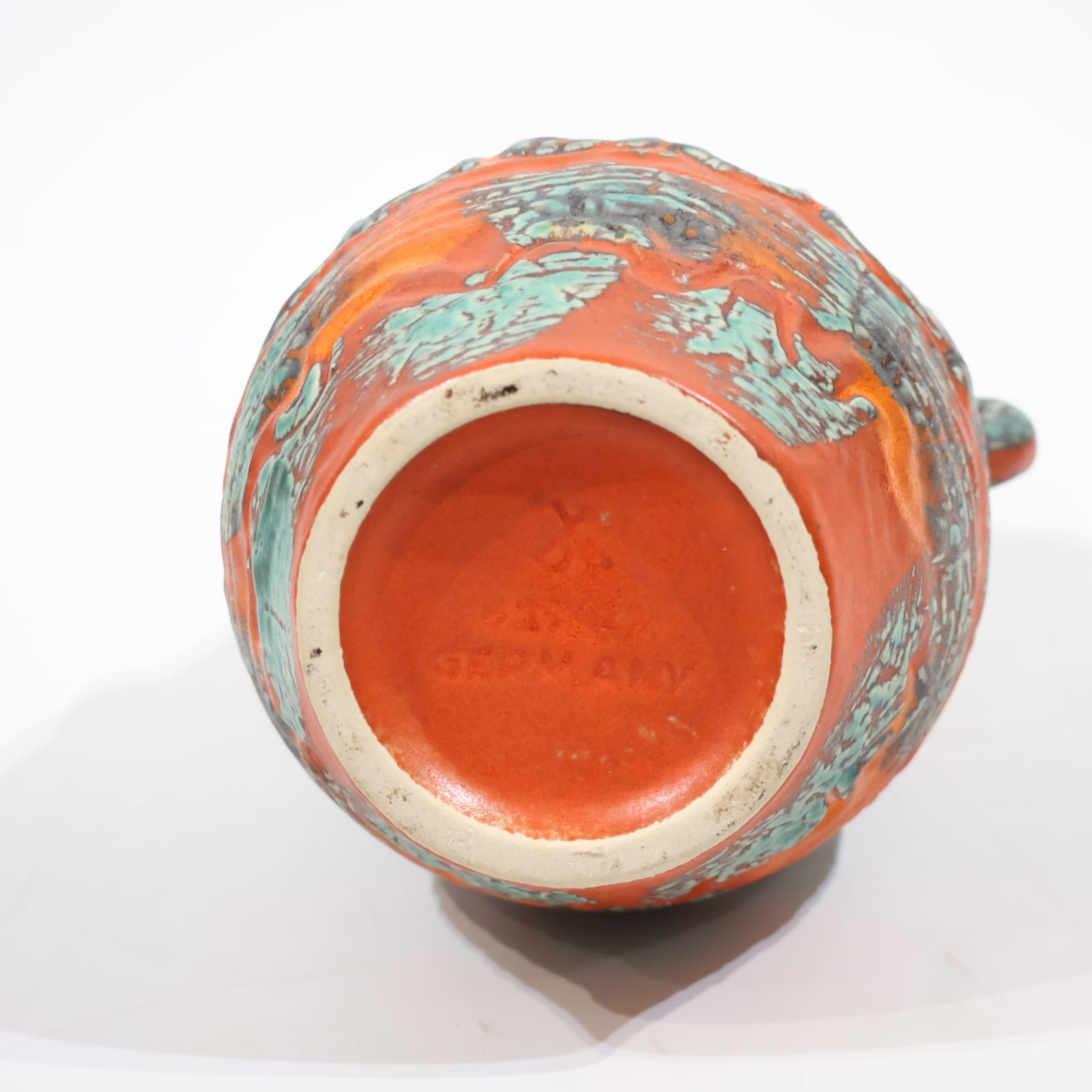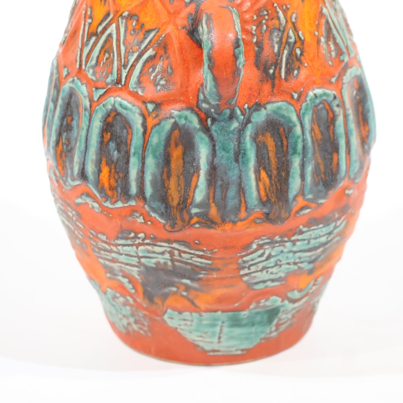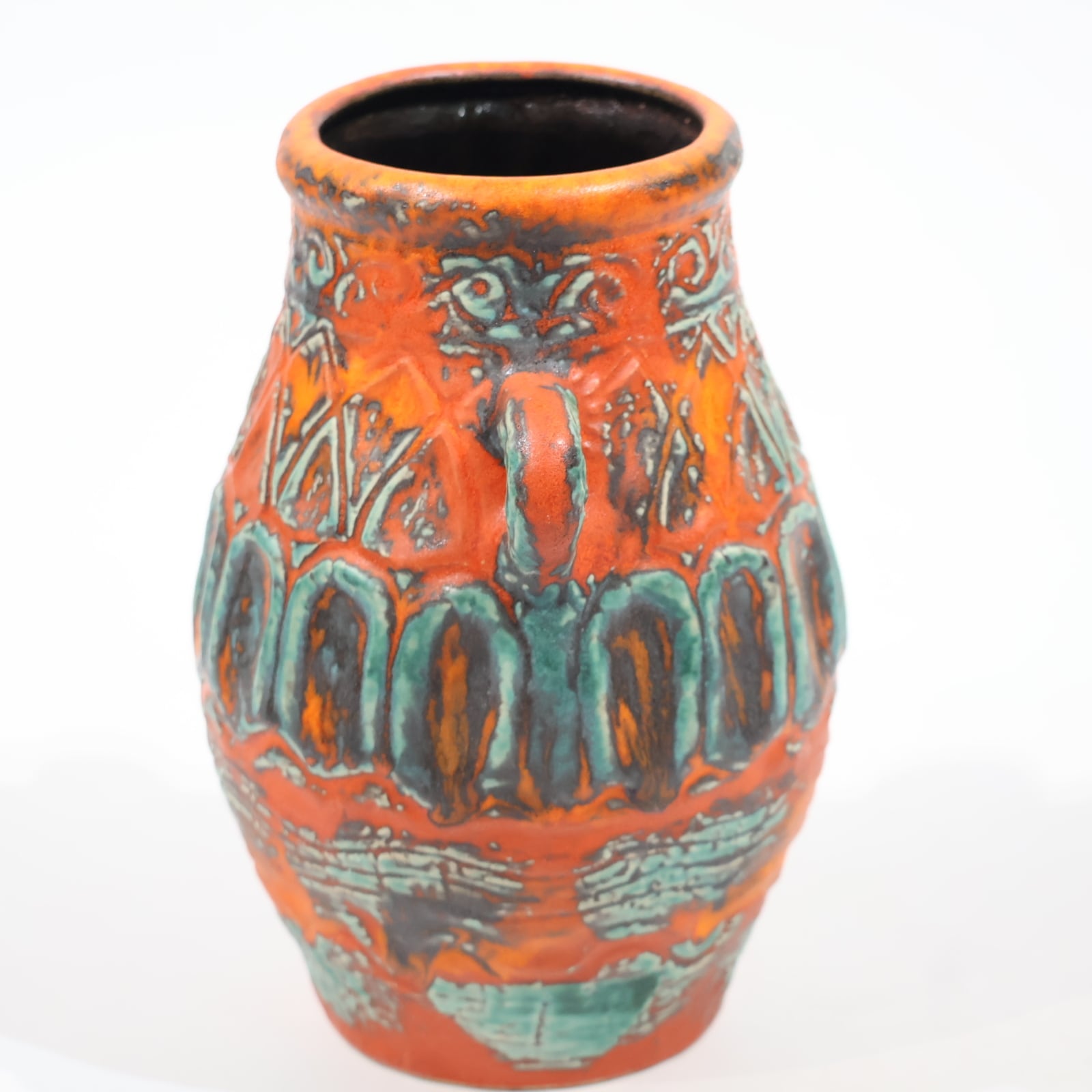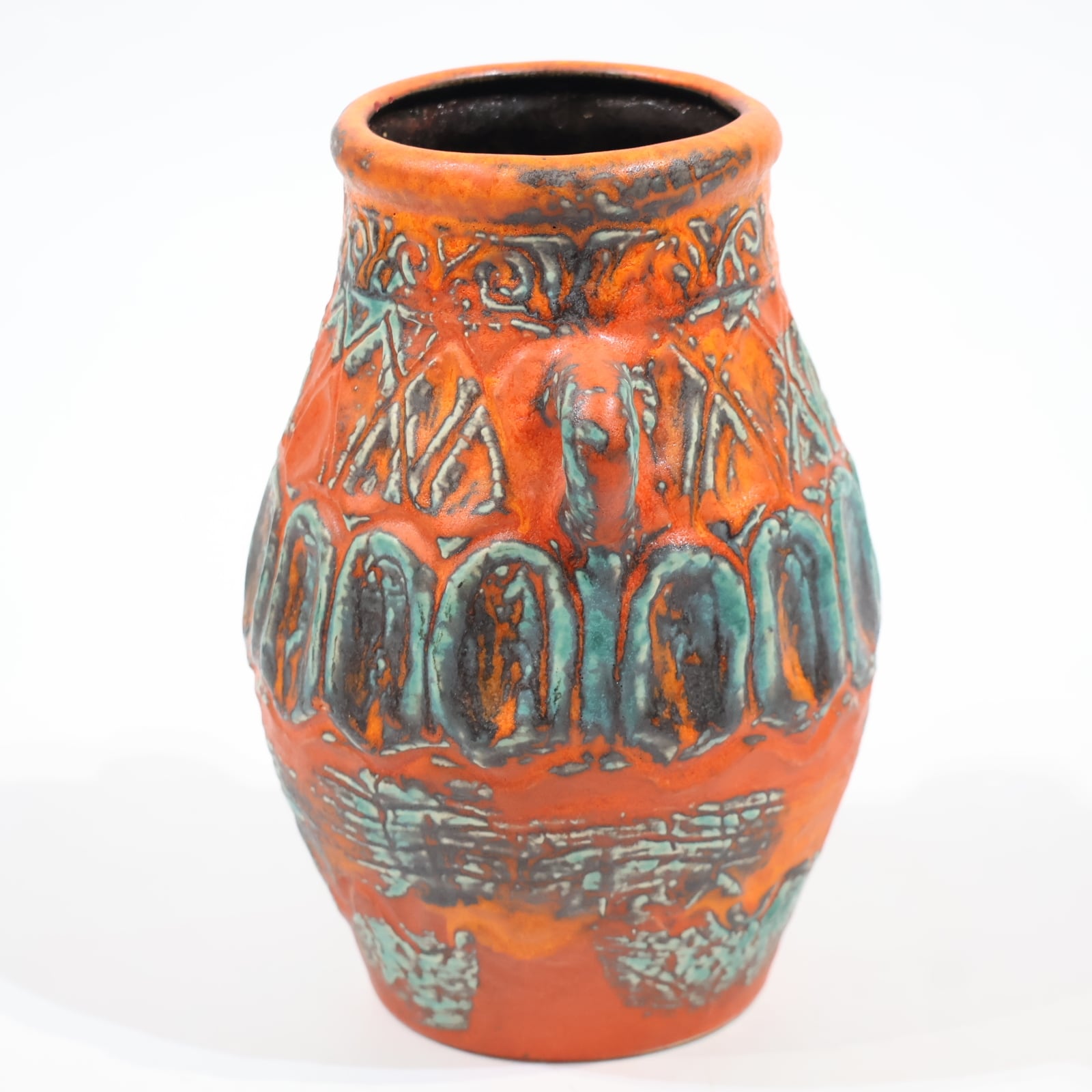 鮮やかなテラコッタオレンジの地肌に、ターコイズブルーとダークブラウンの釉薬が大胆にあしらわれた一品。彫り模様には幾何学的なラインと抽象的なパターンが交差し、リズミカルな構成を見せています。