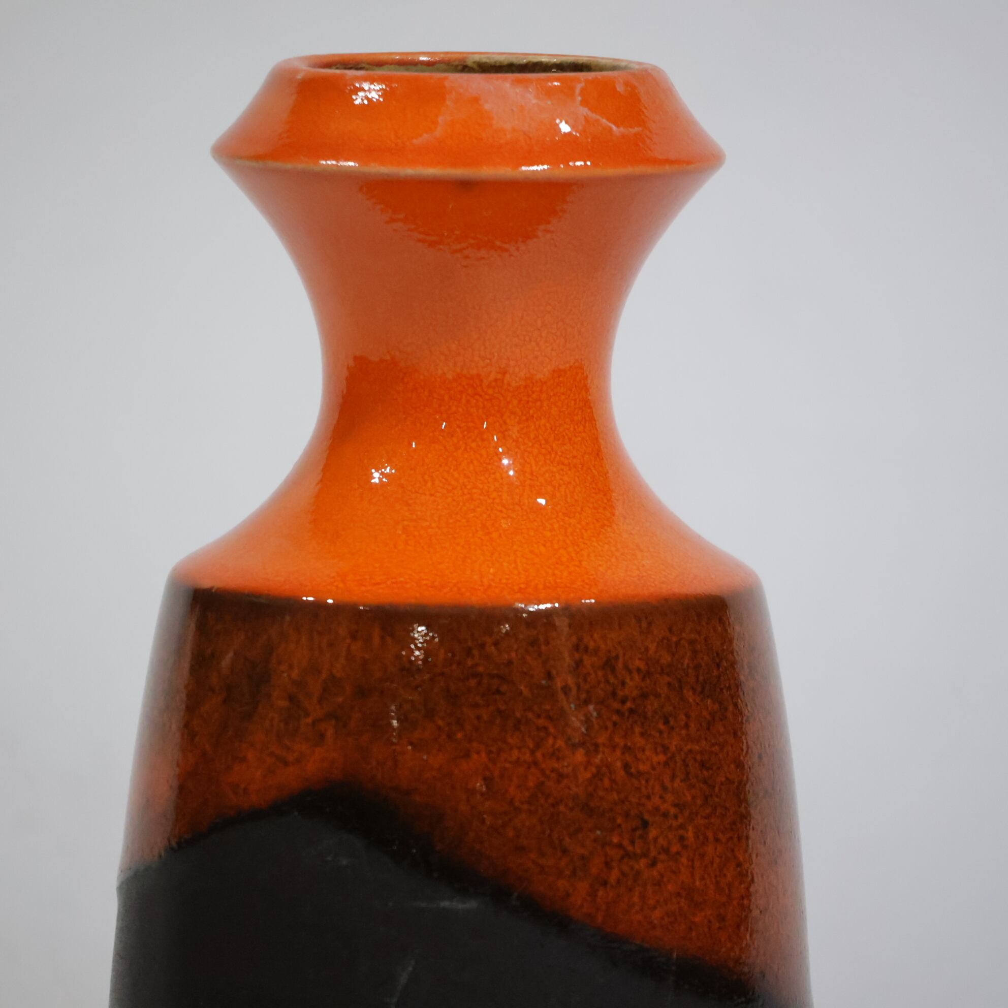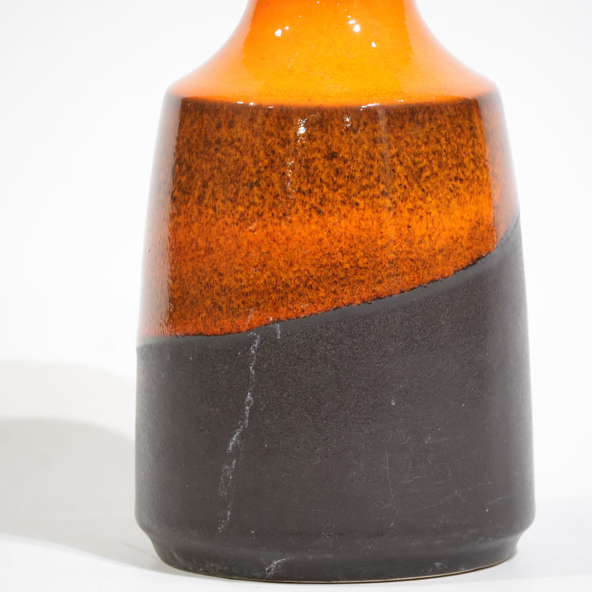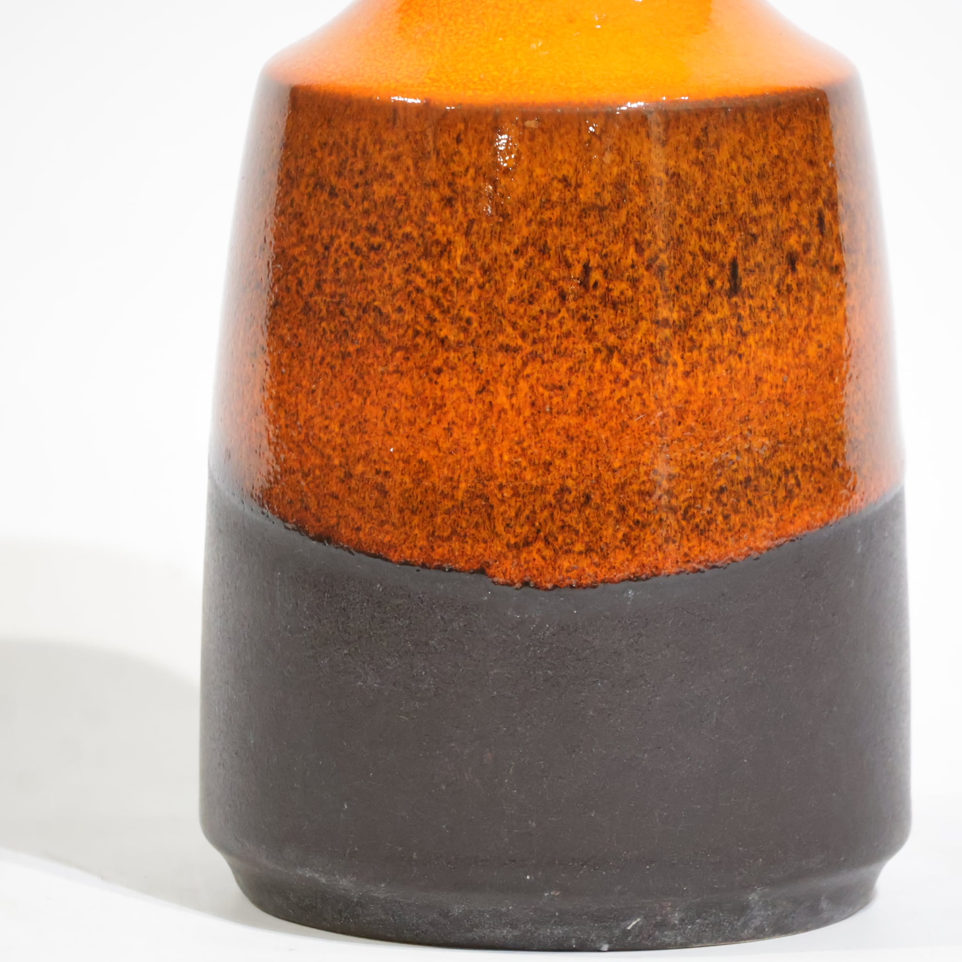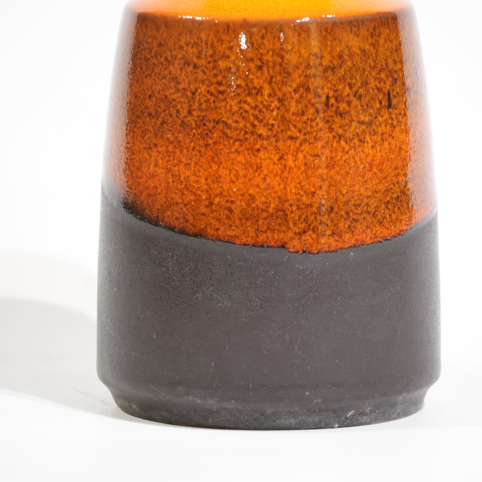 中腹には細かな粒子状のブラウンが密に現れ、下部はマットなブラックで切り替わる三層構成。オレンジからブラウンへの移行部では、釉薬がわずかに滲み、焼成時の流動が表面に残っています。