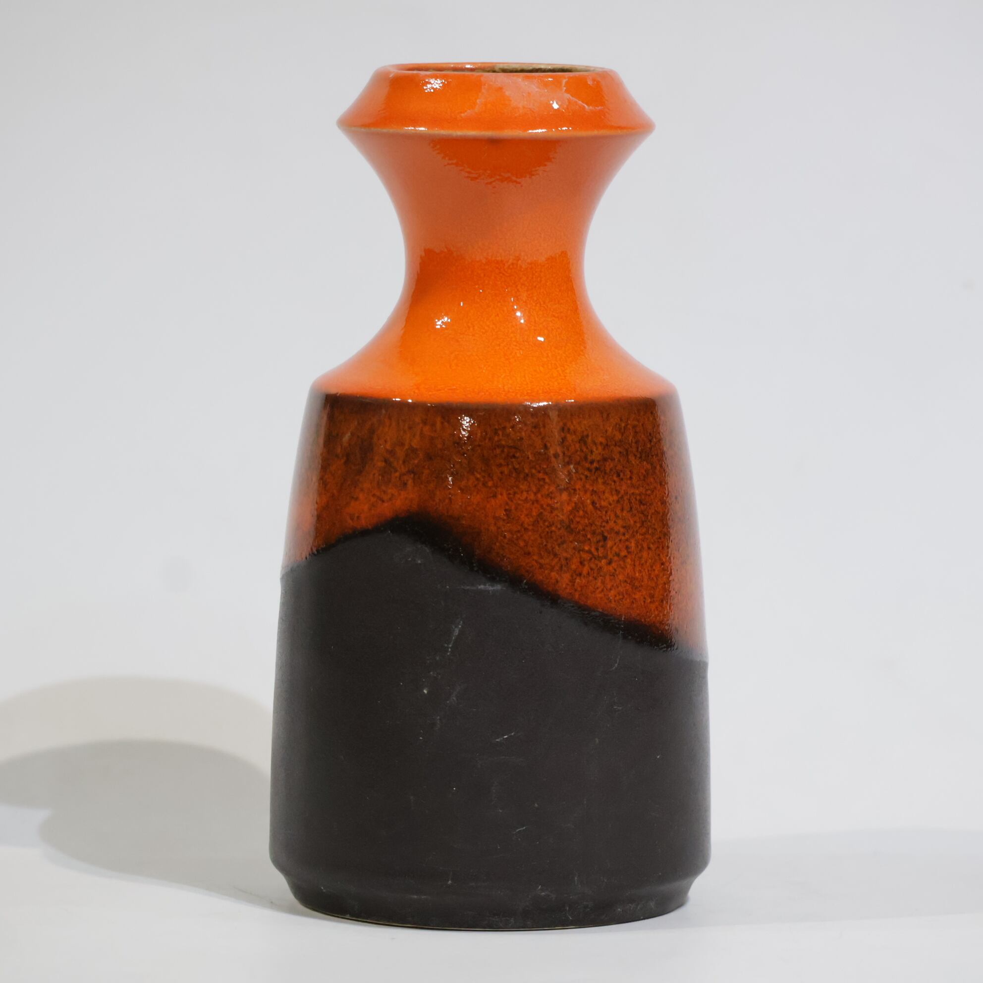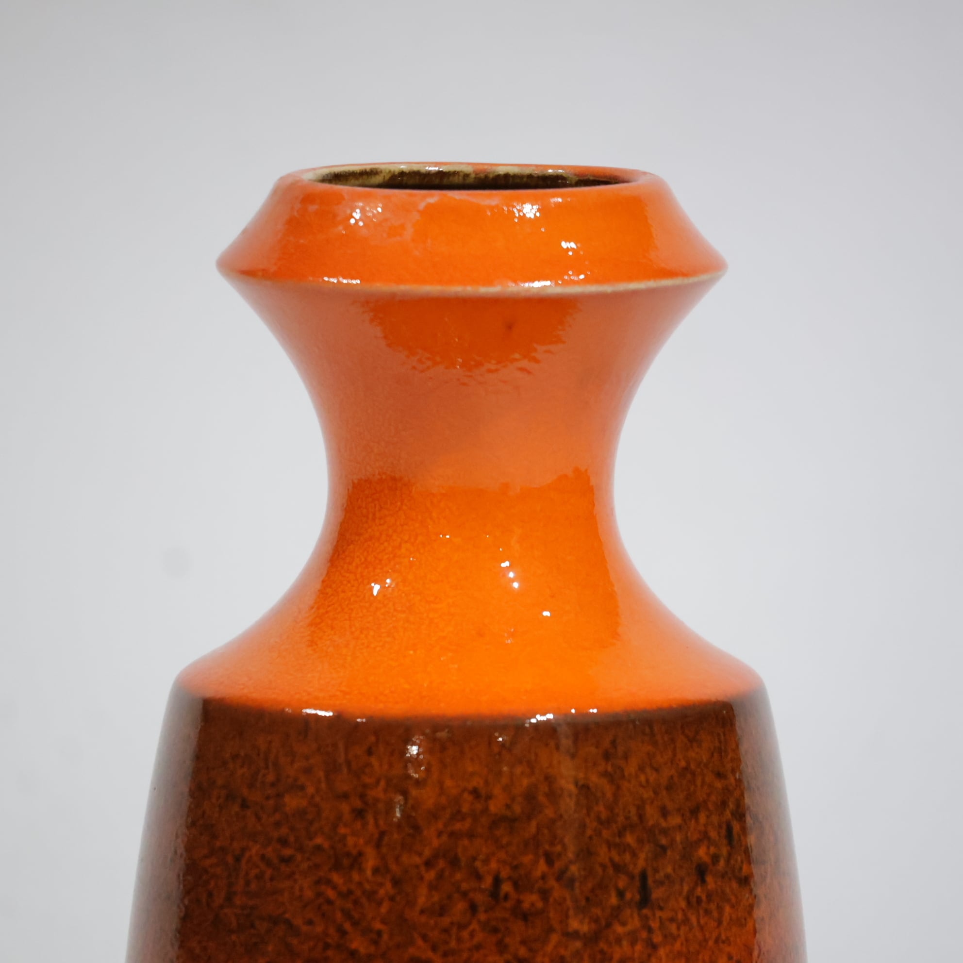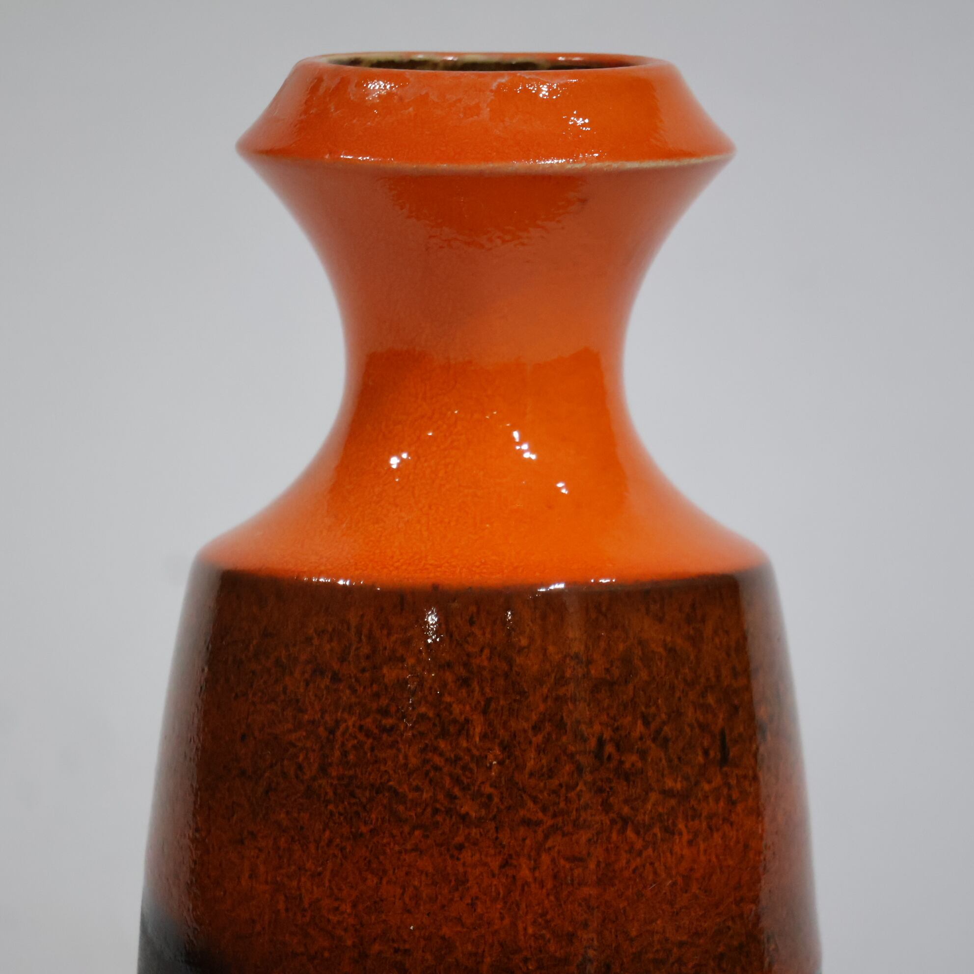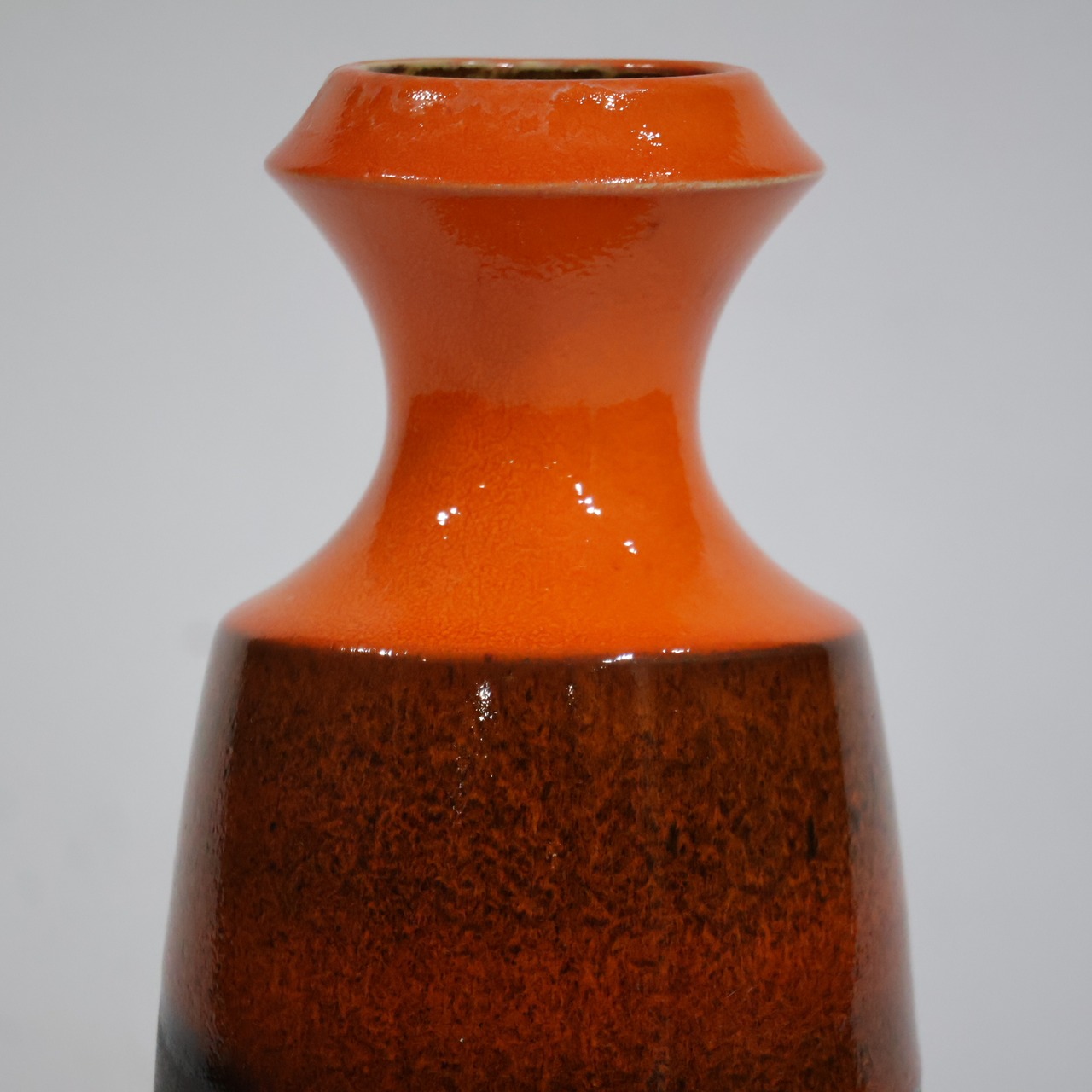 中腹には細かな粒子状のブラウンが密に現れ、下部はマットなブラックで切り替わる三層構成。オレンジからブラウンへの移行部では、釉薬がわずかに滲み、焼成時の流動が表面に残っています。