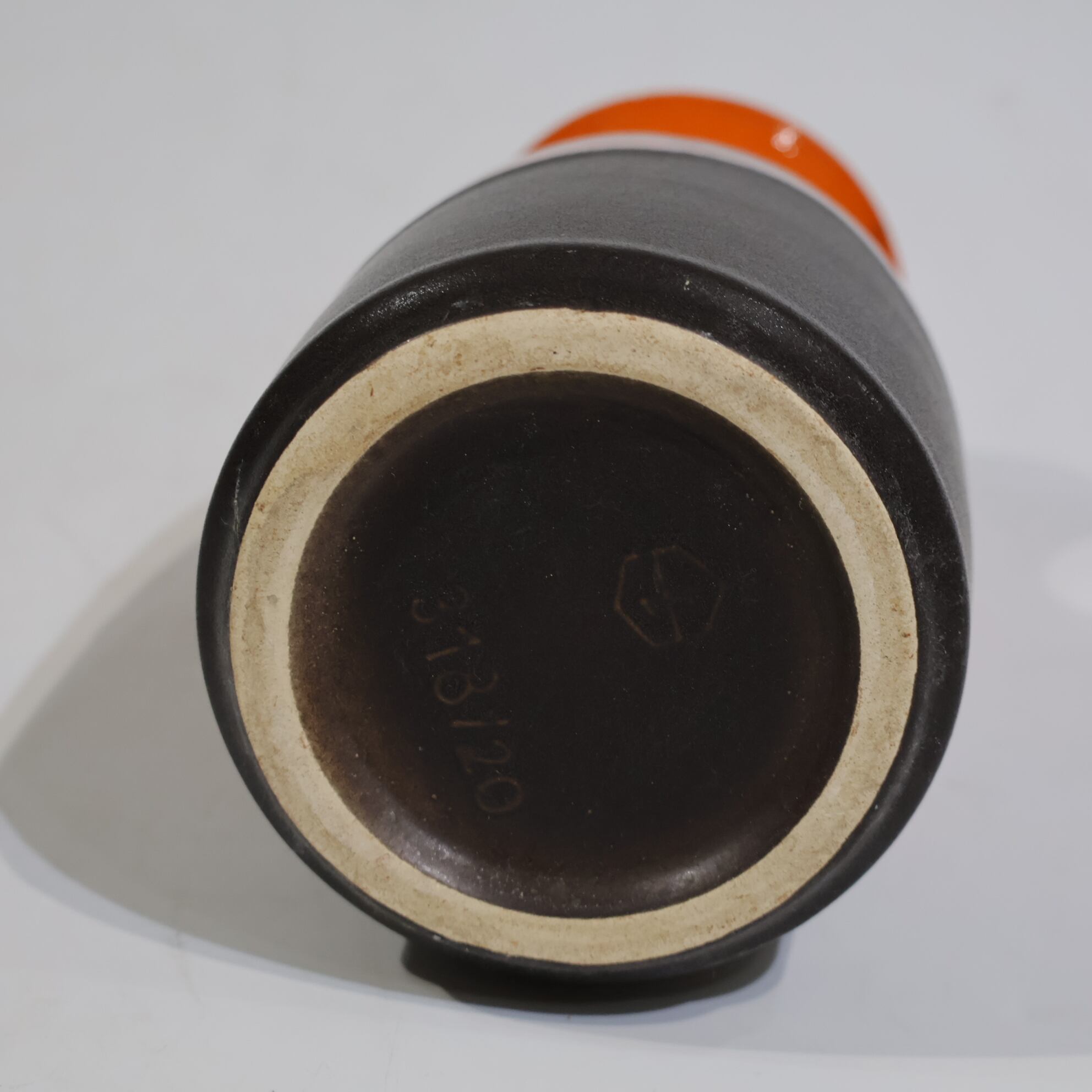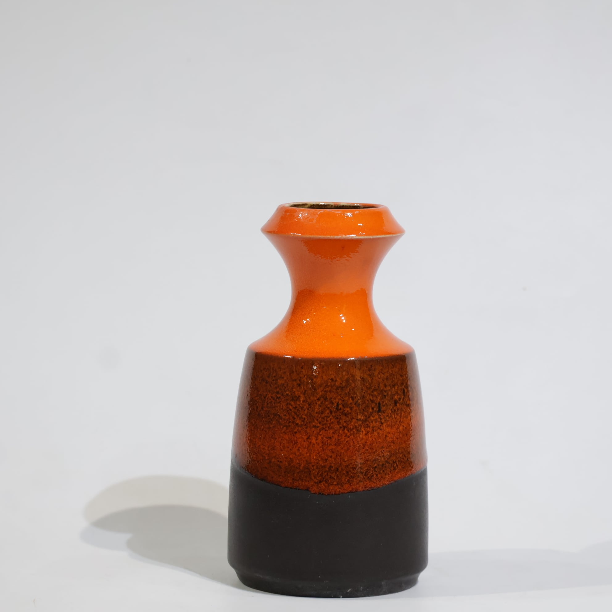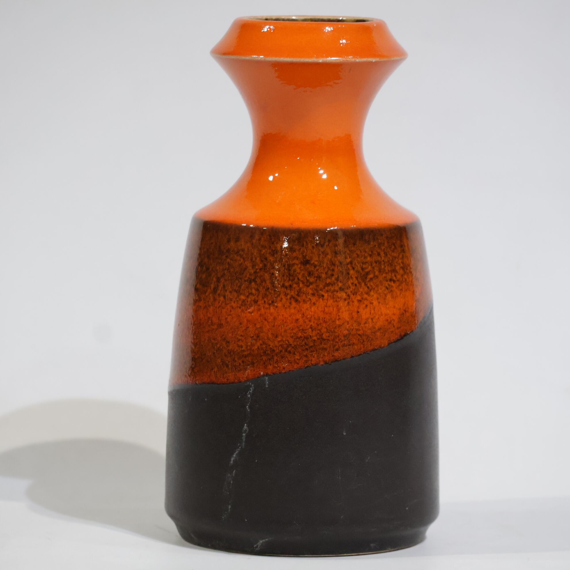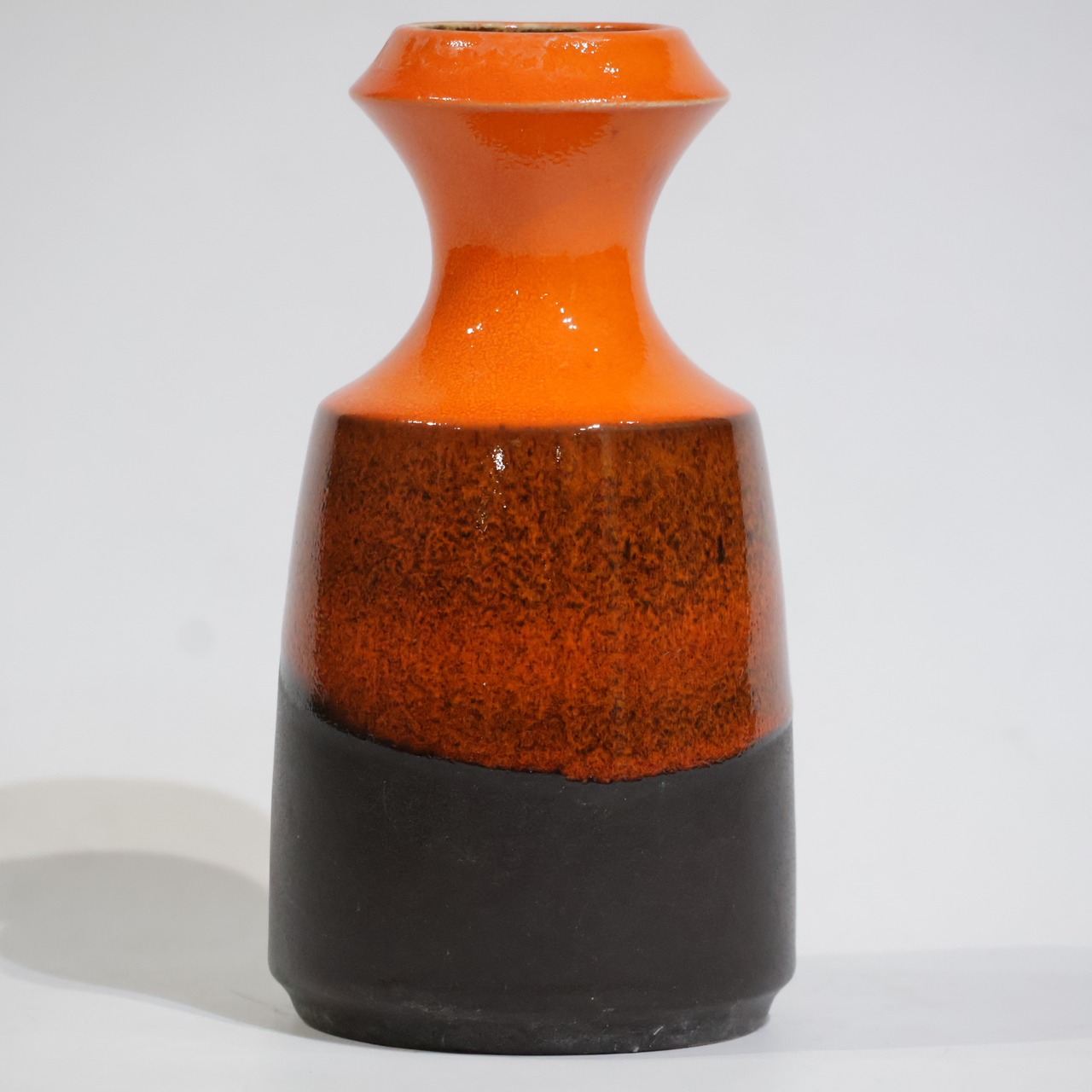 中腹には細かな粒子状のブラウンが密に現れ、下部はマットなブラックで切り替わる三層構成。オレンジからブラウンへの移行部では、釉薬がわずかに滲み、焼成時の流動が表面に残っています。