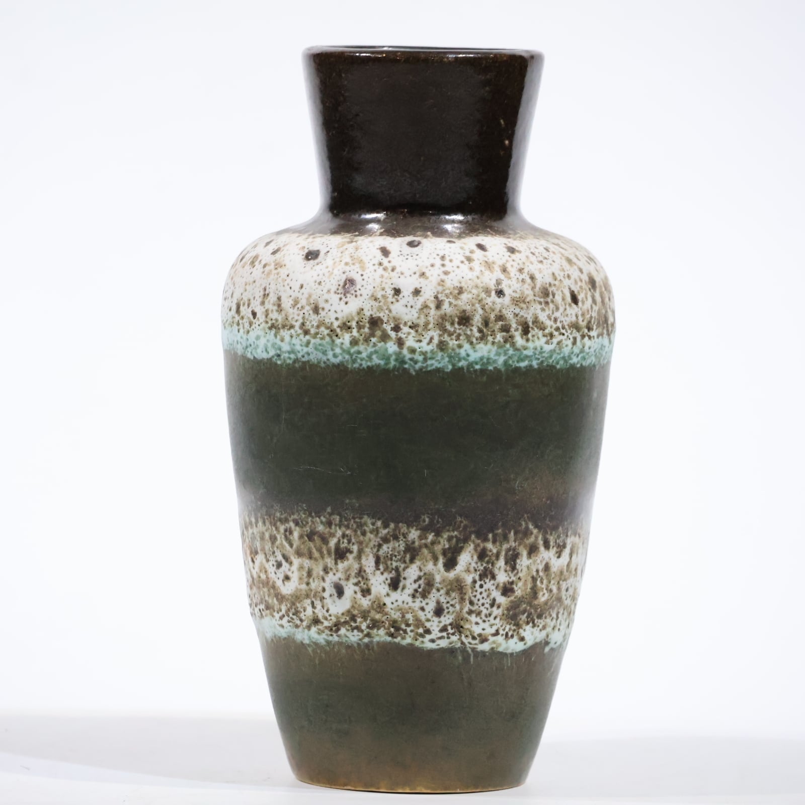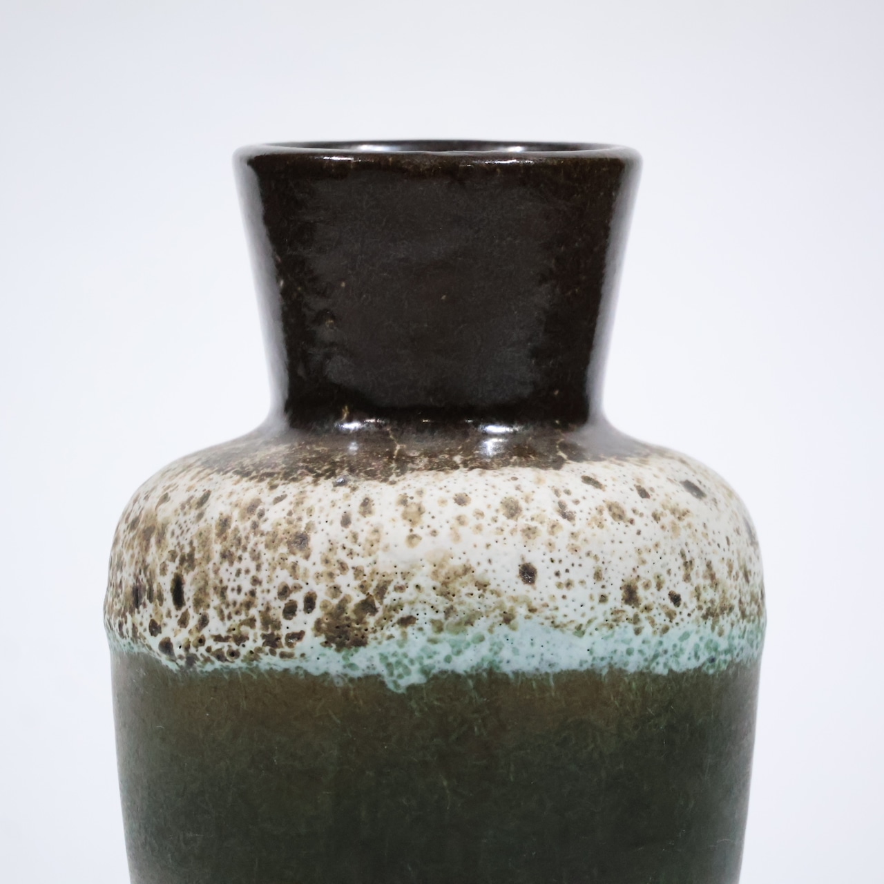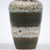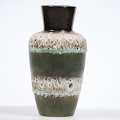 同社は急速に成長し、1950~80年代には陶 器製造の分野でドイツ最大のメーカーとなり、今日も確固たる地位を維持しています。形状に加えて釉薬でも、当時は最も幅広い品揃えを誇った他、輸出量も最大だったため、現在でも同社の製品はよく見られます。特に円筒形を基調にし たシンプルな形状で、型押し模様のある床置き 花瓶が代表的。色彩については当時主流だっ た赤やオレンジから、クリーム、ベージュ、茶色 などが多くを占めています。