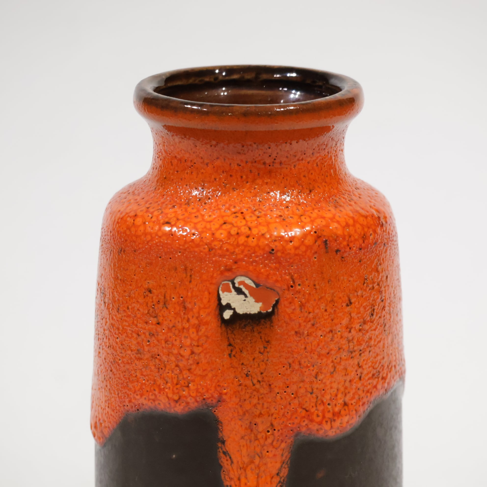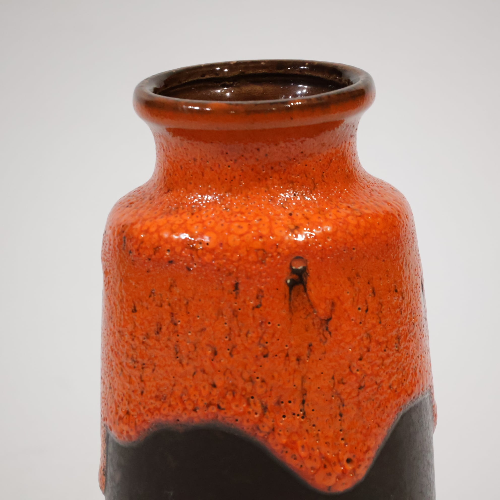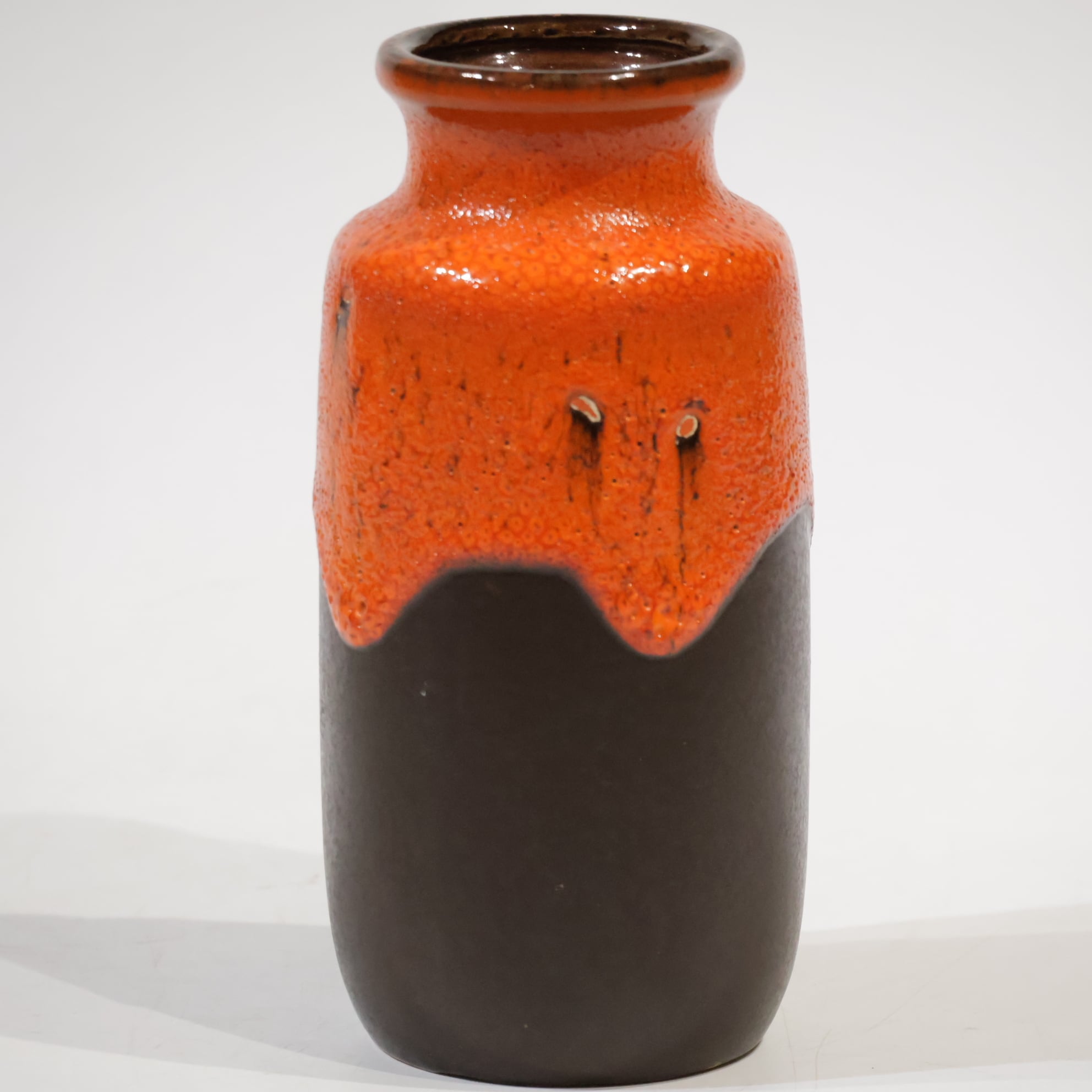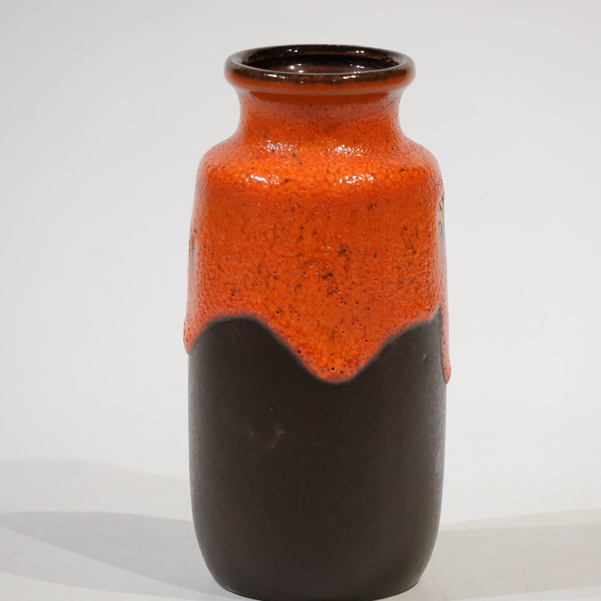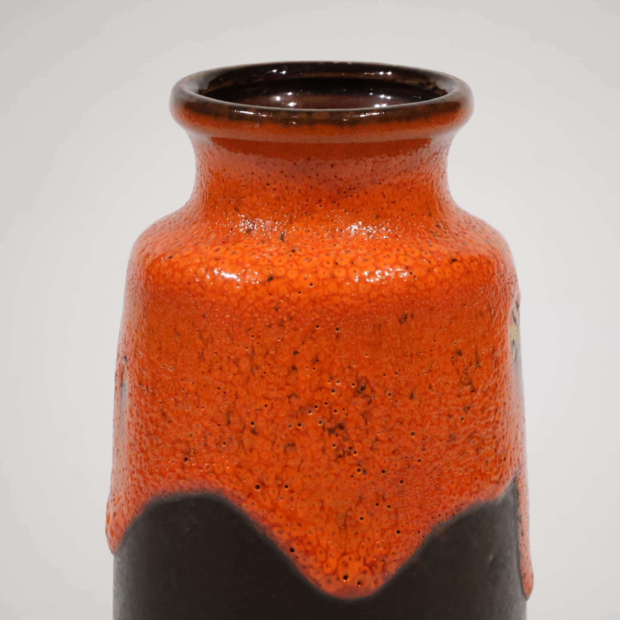 同社は急速に成長し、1950~80年代には陶 器製造の分野でドイツ最大のメーカーとなり、今日も確固たる地位を維持しています。形状に加えて釉薬でも、当時は最も幅広い品揃えを誇った他、輸出量も最大だったため、現在でも同社の製品はよく見られます。特に円筒形を基調にし たシンプルな形状で、型押し模様のある床置き 花瓶が代表的。色彩については当時主流だっ た赤やオレンジから、クリーム、ベージュ、茶色 などが多くを占めています。