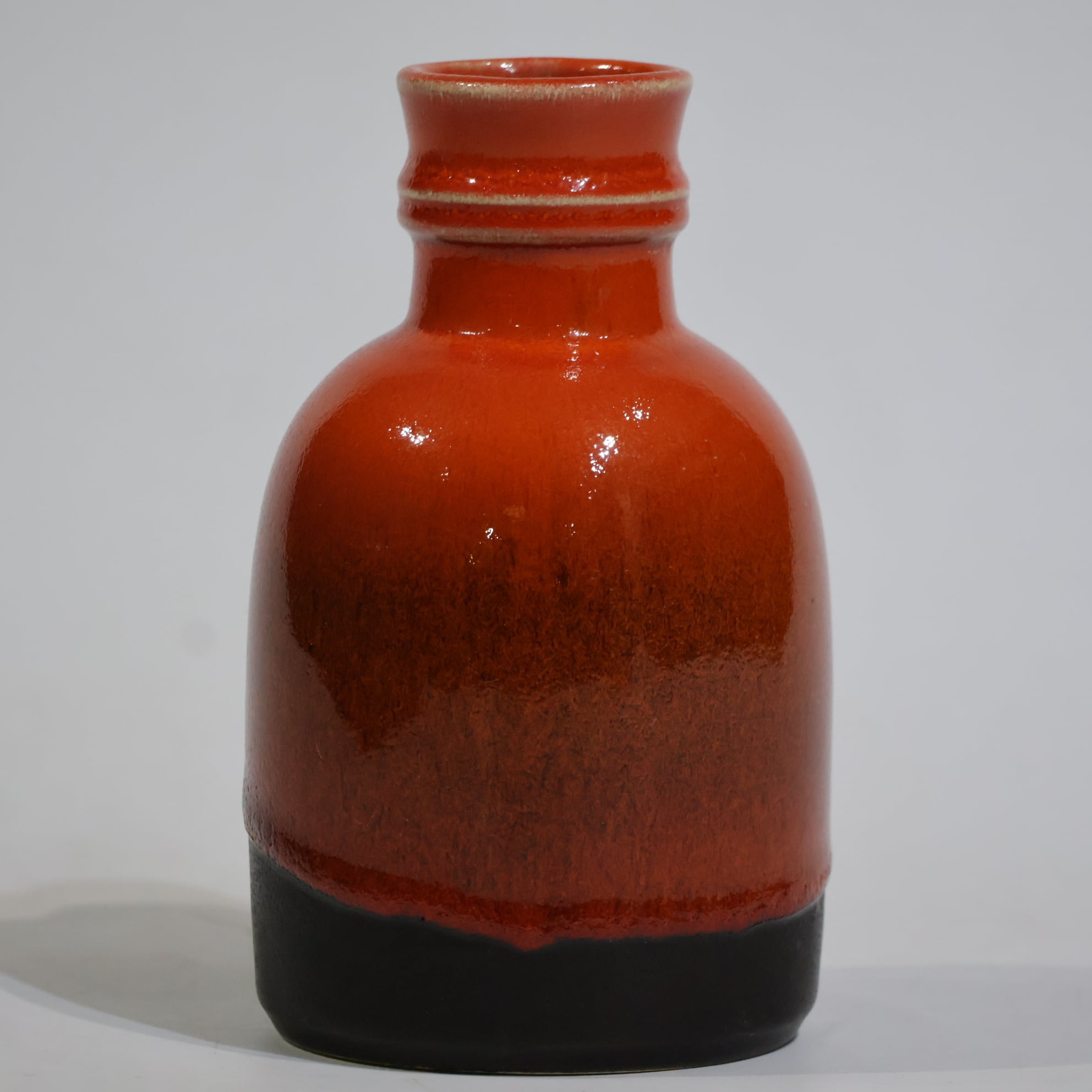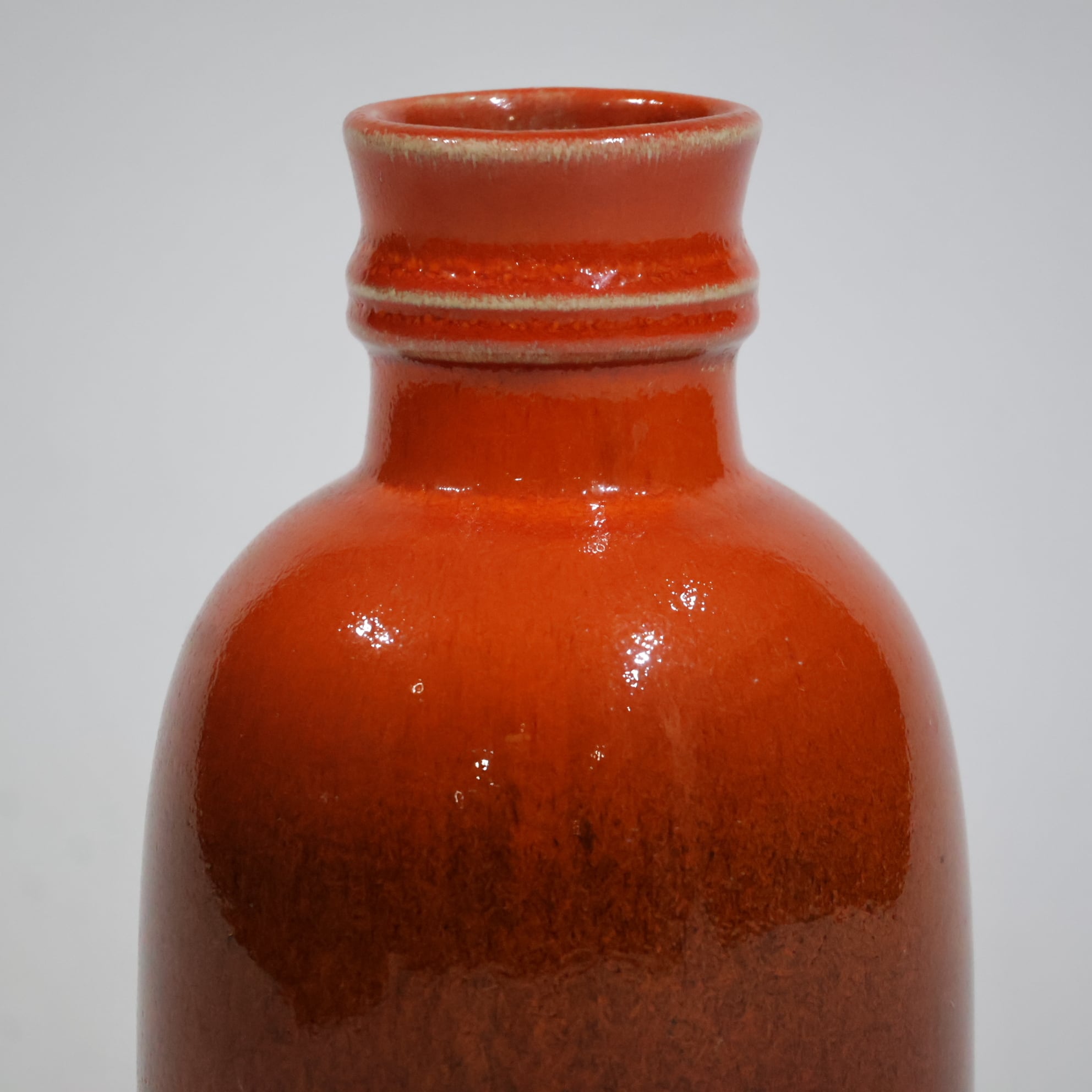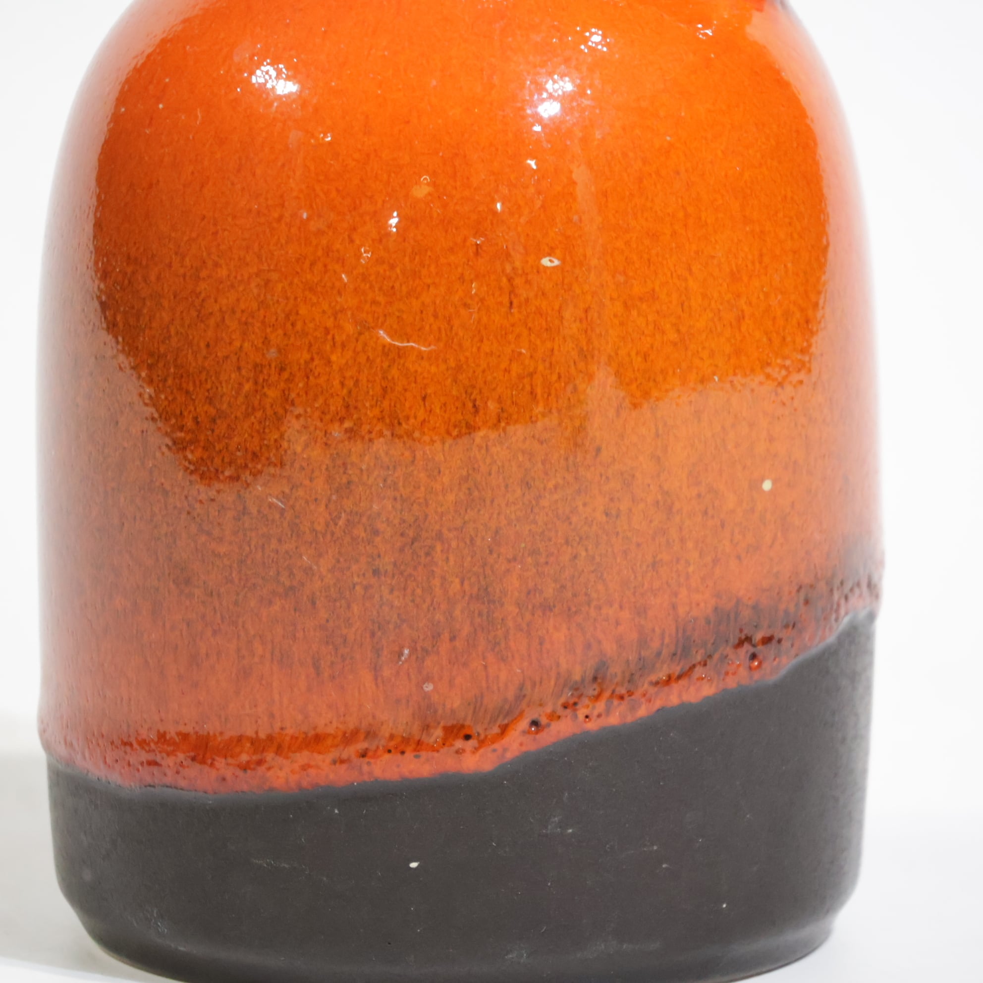 釉薬は鮮やかなオレンジの光沢釉。中腹から下にかけてブラウンを経由し、最下部はマットなブラックへと切り替わり、小ぶりながらアクセントになる一点です。