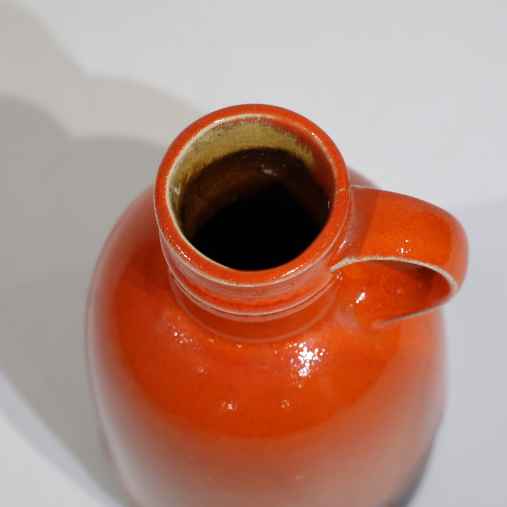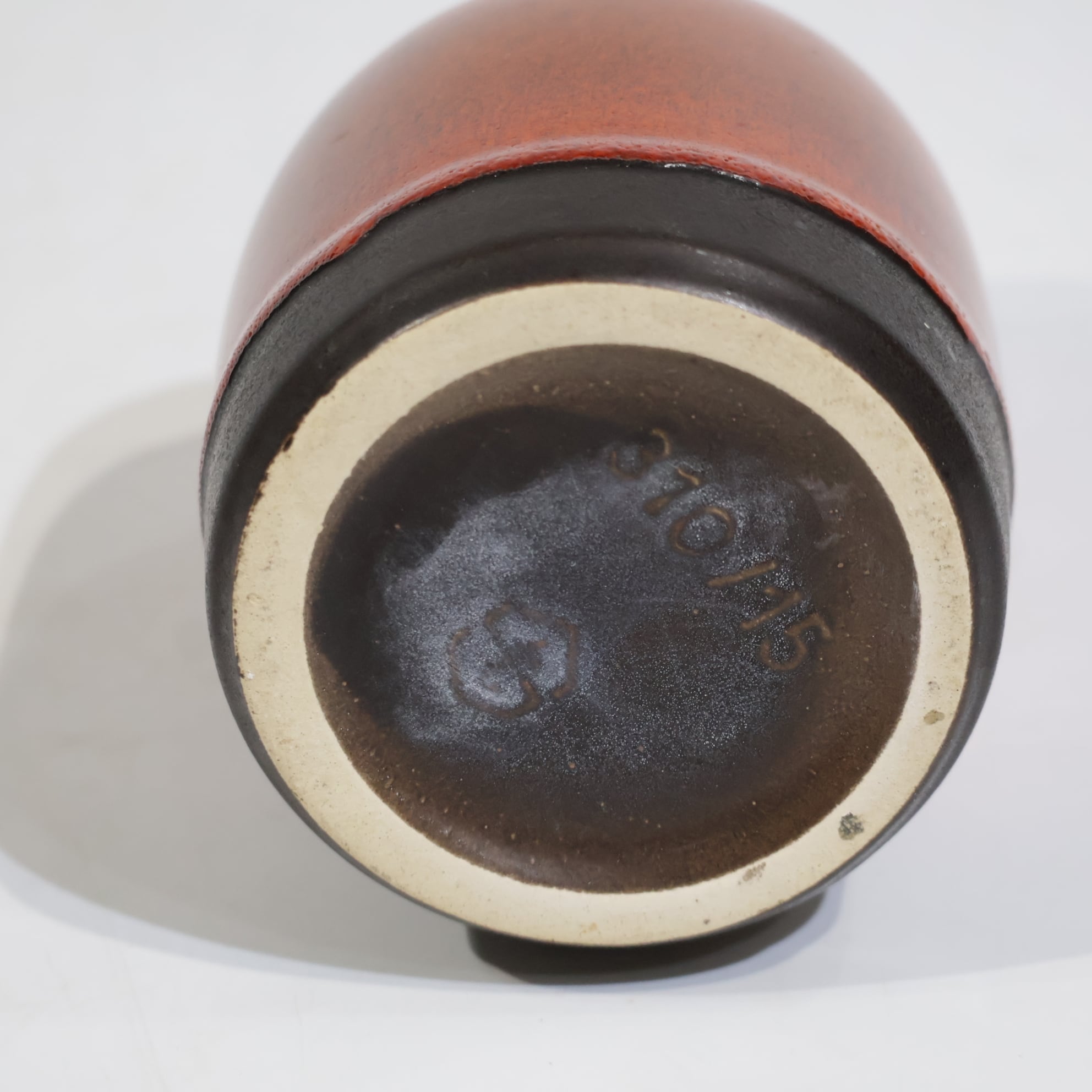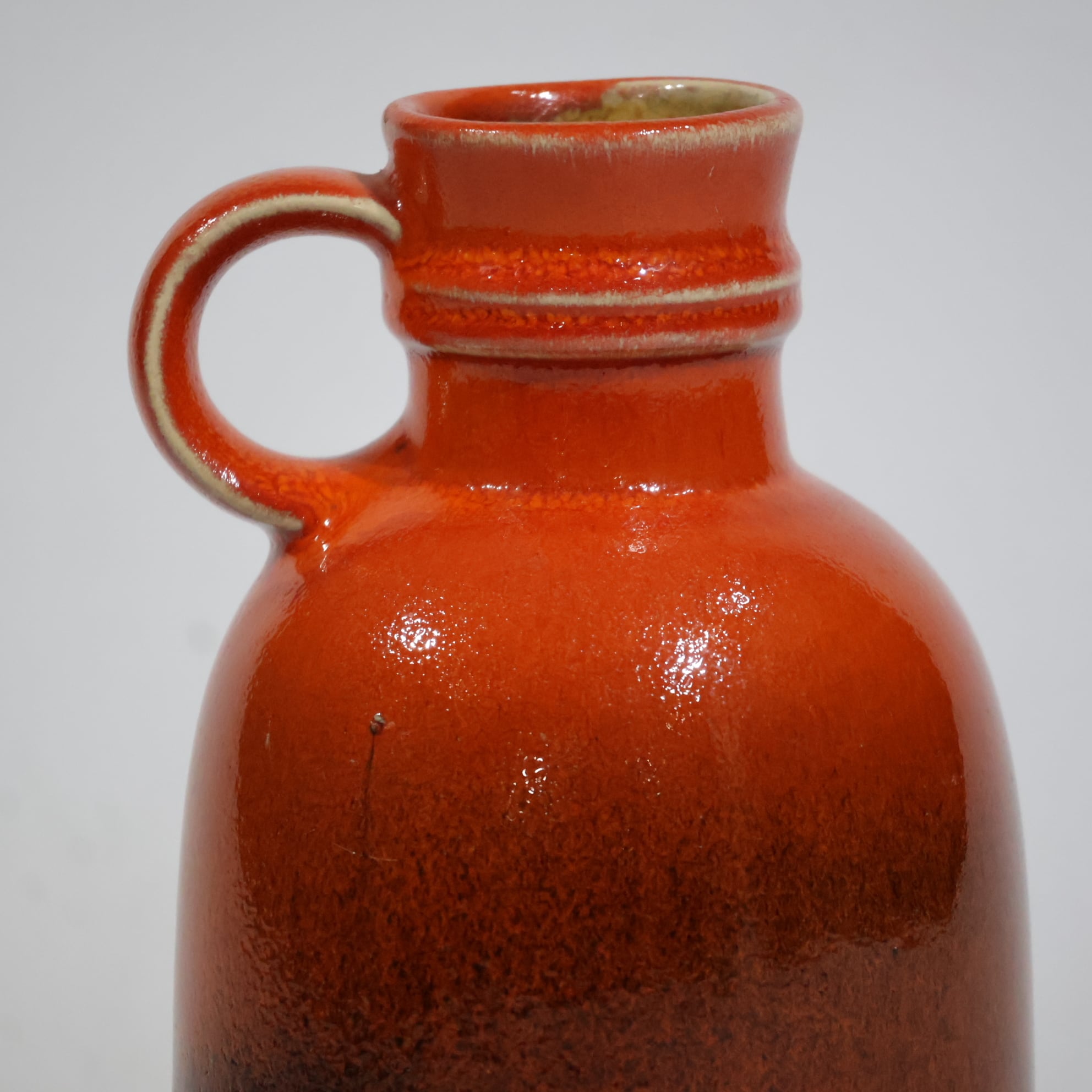 釉薬は鮮やかなオレンジの光沢釉。中腹から下にかけてブラウンを経由し、最下部はマットなブラックへと切り替わり、小ぶりながらアクセントになる一点です。