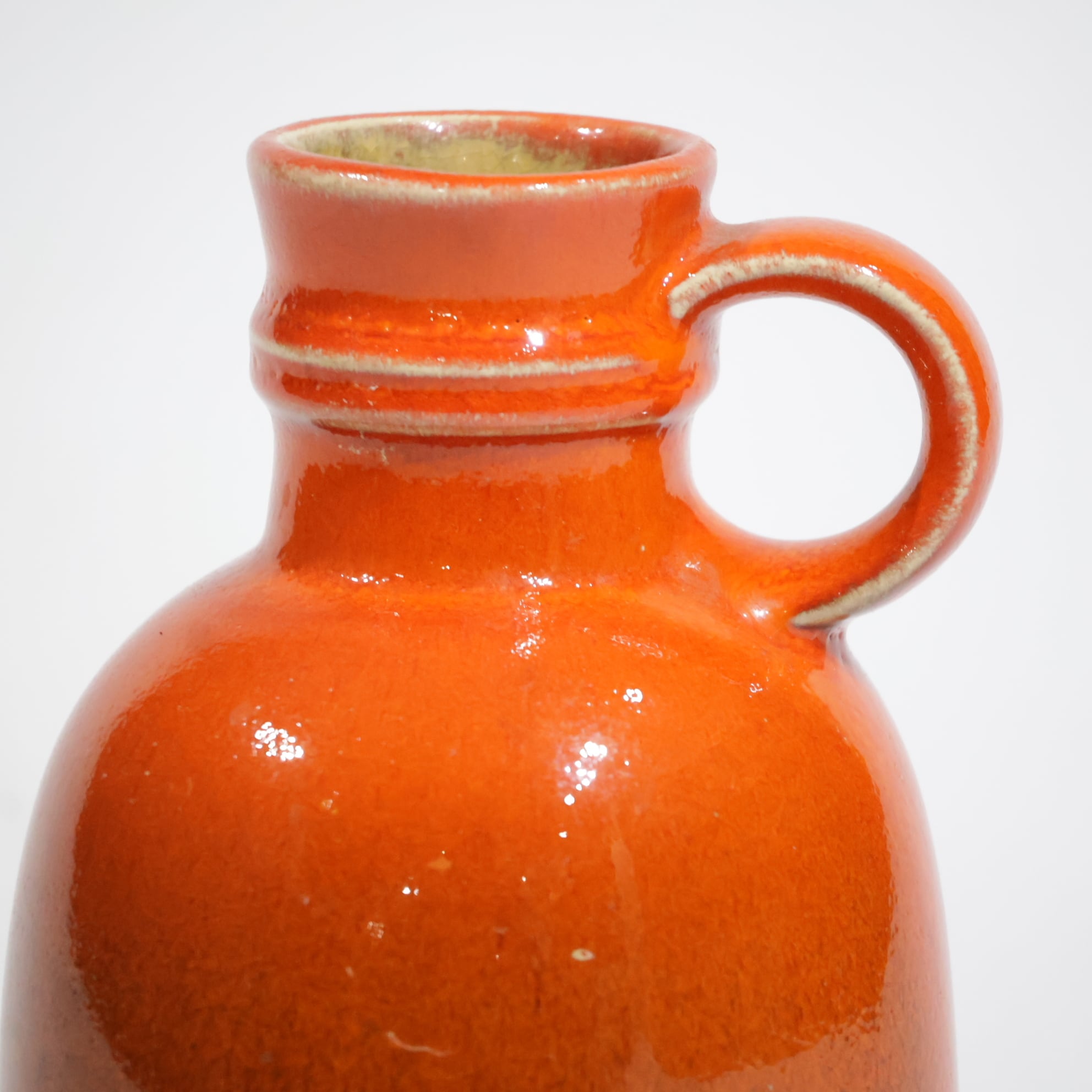 細い口縁から緩やかに膨らむ胴、短い首にリング状の段差を設け、側面に小振りな円形ハンドルを付けた造形でプロポーションは縦方向に引き締まり、底部は安定した形になっています。