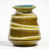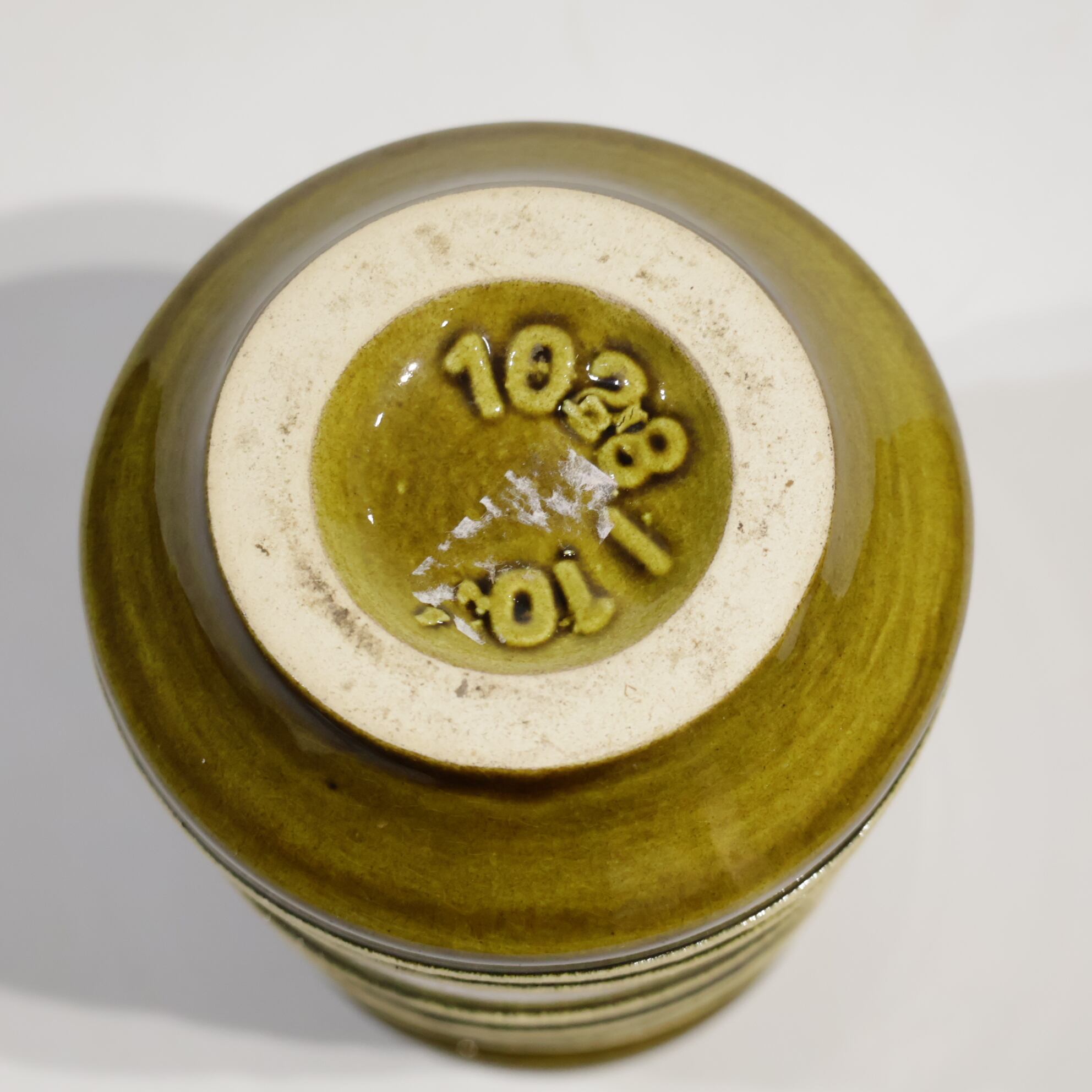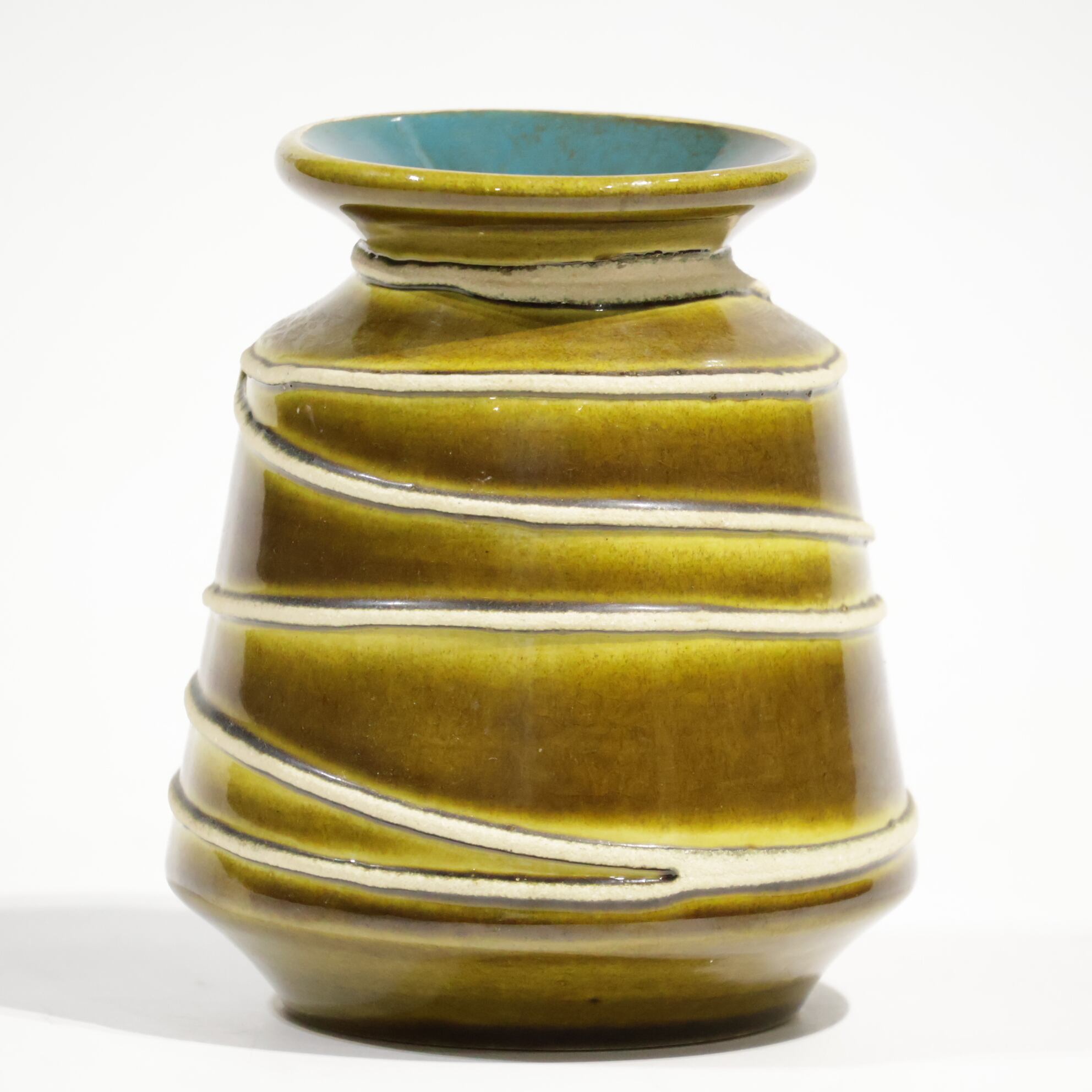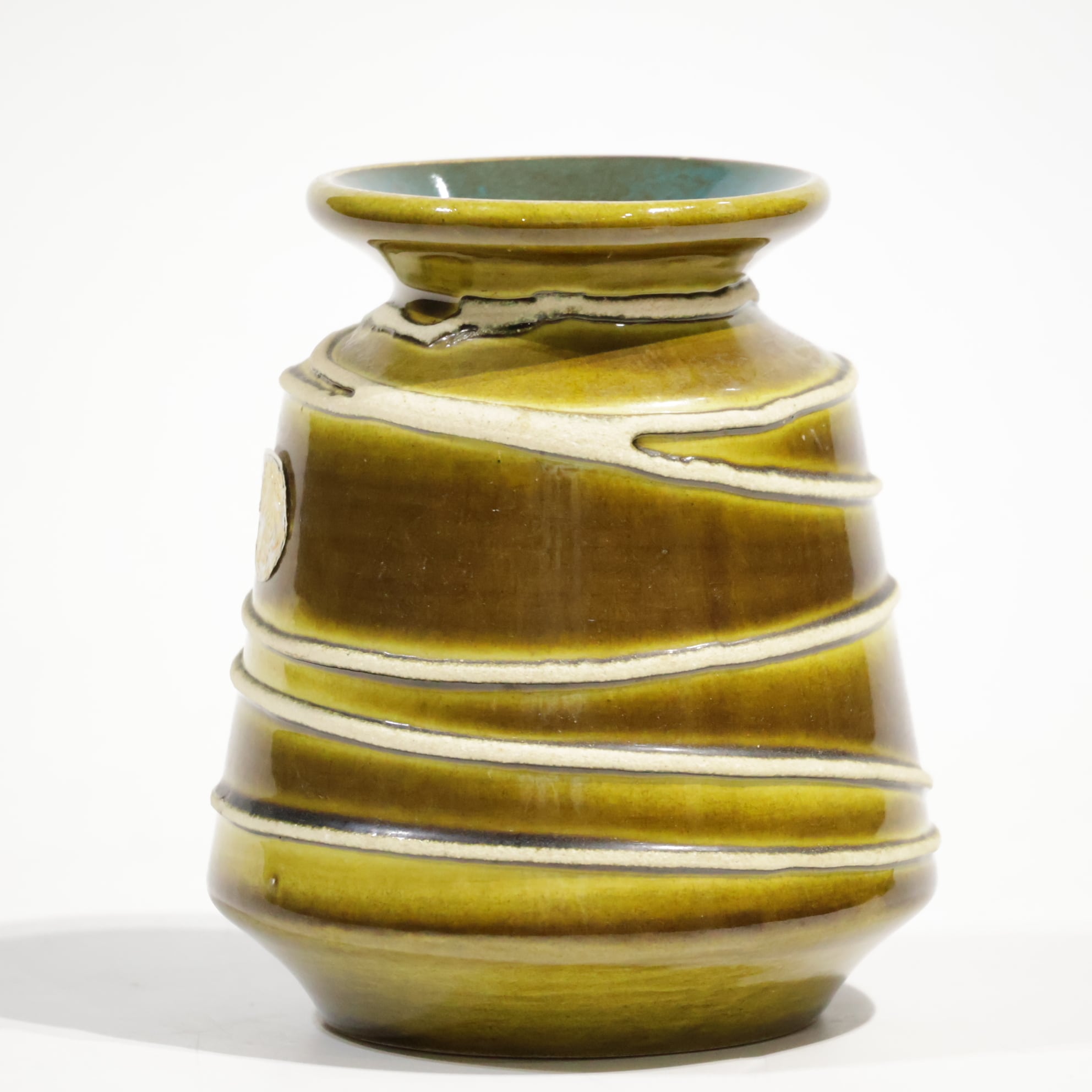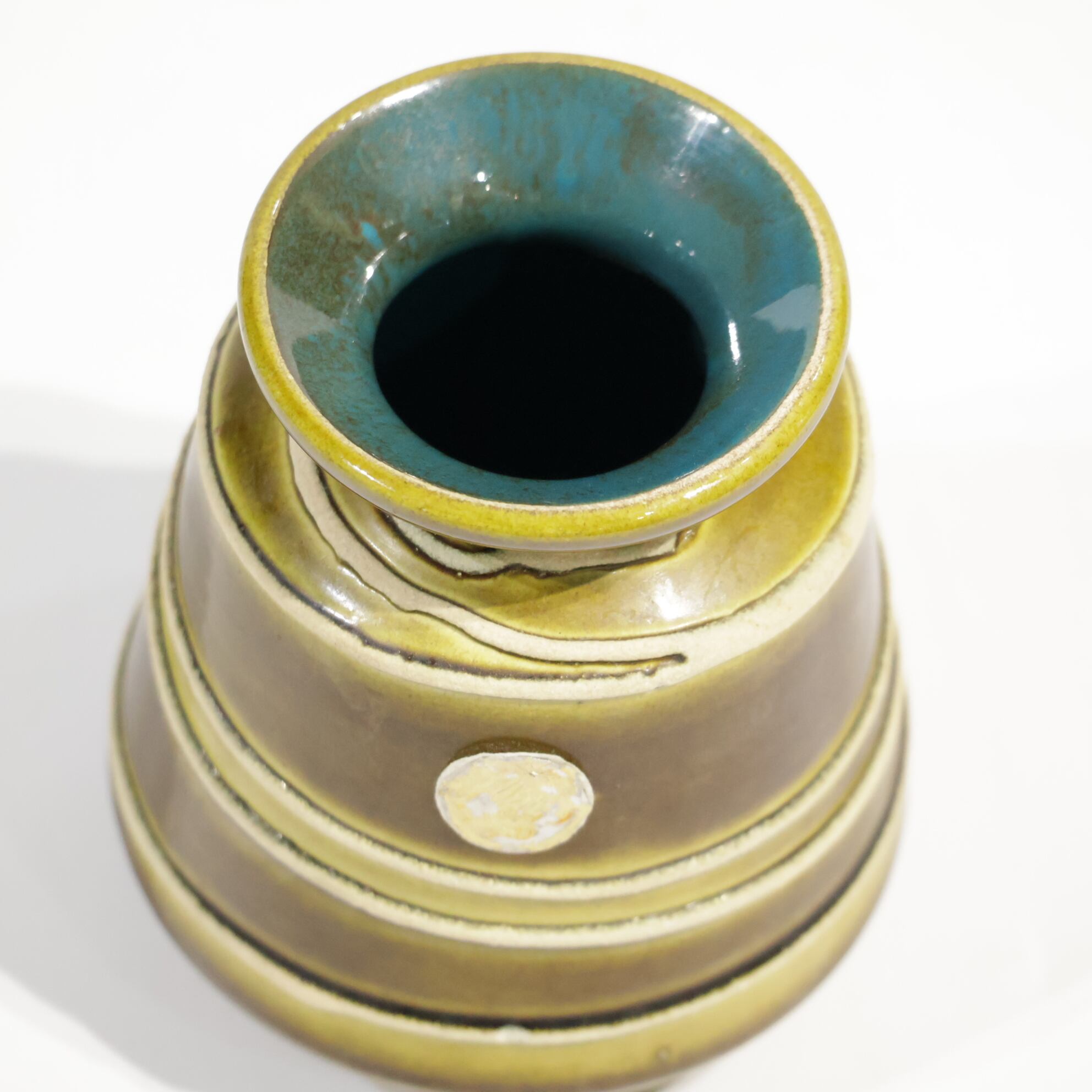 釉薬は黄味を帯びたオリーブブラウンを基調に、段ごとに濃淡のグラデーションがかかる構成で、流下による自然な境界ができています。