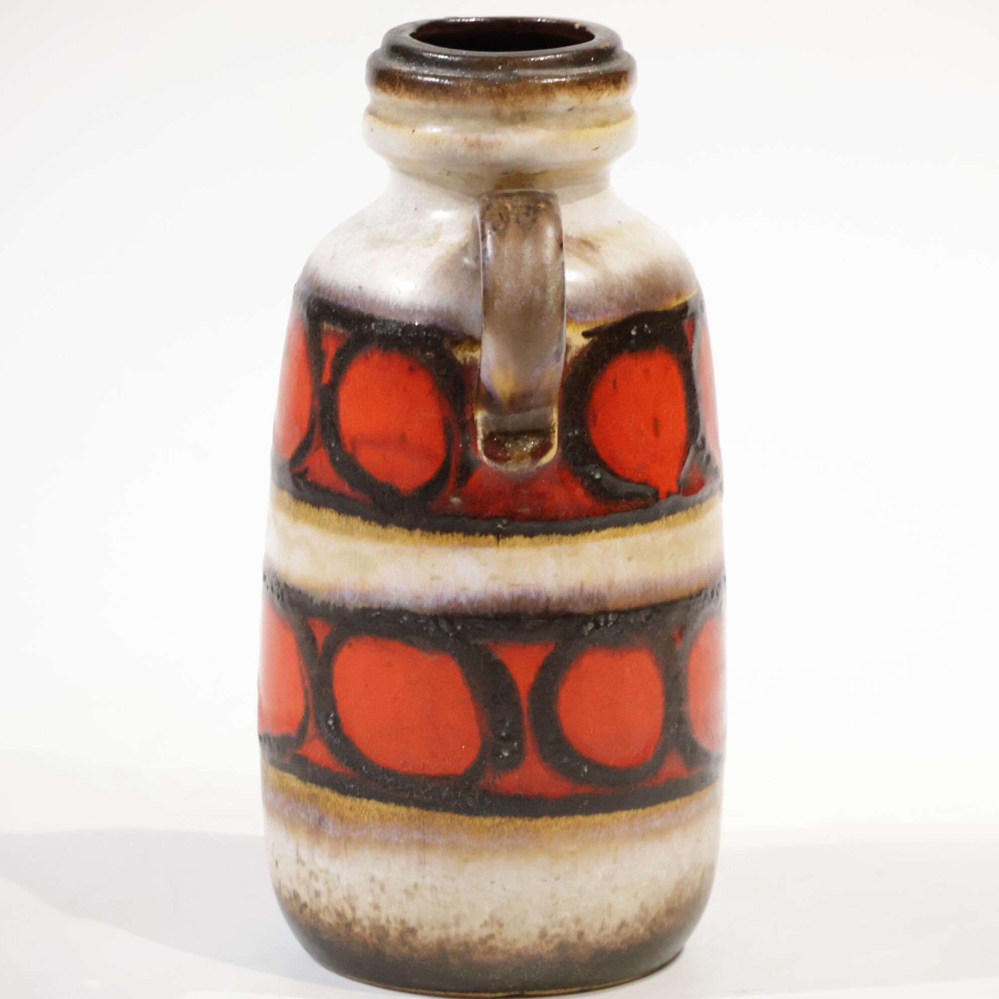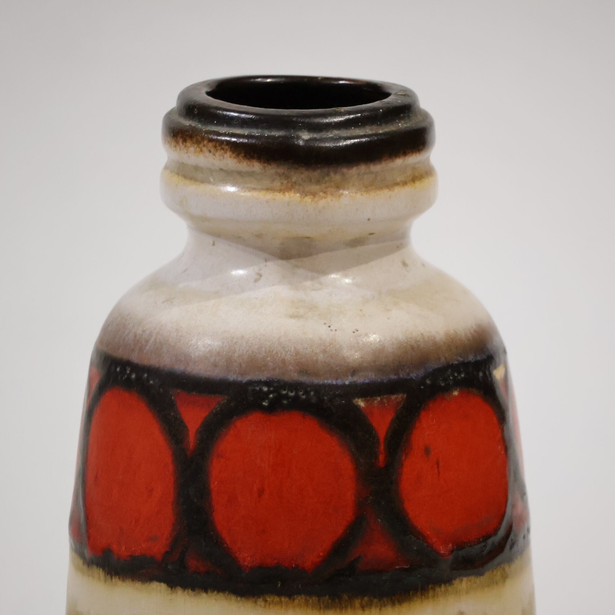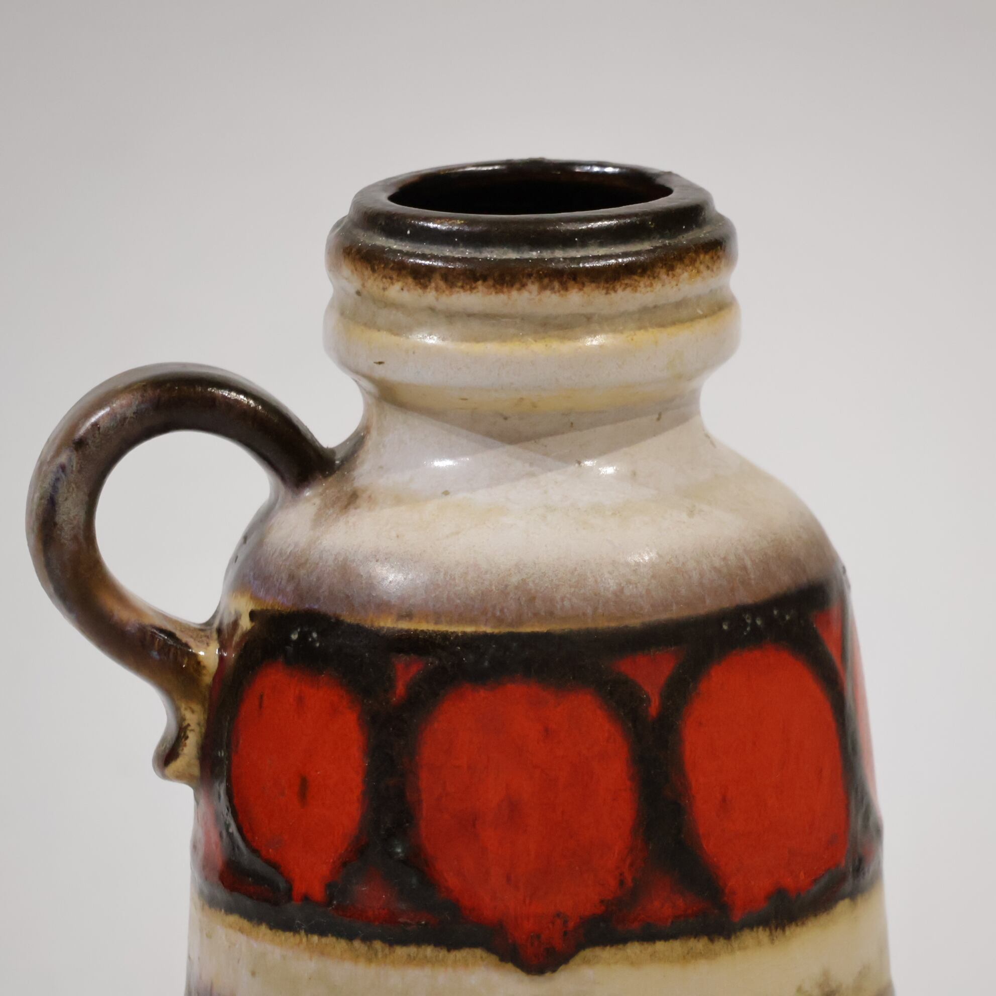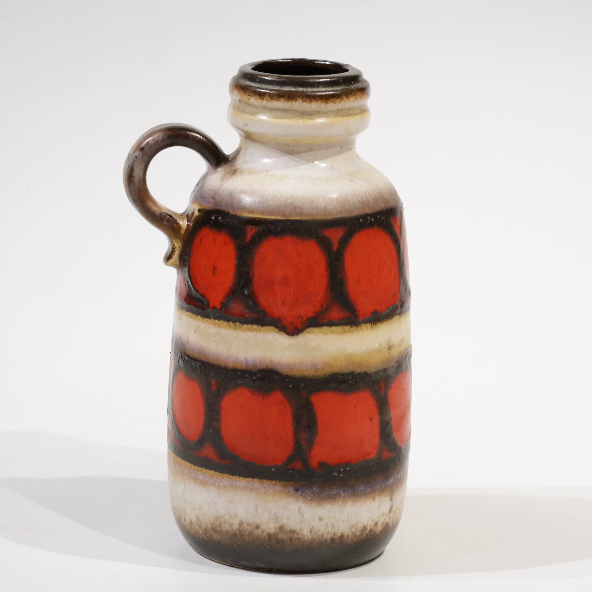 同社は急速に成長し、1950~80年代には陶 器製造の分野でドイツ最大のメーカーとなり、今日も確固たる地位を維持しています。形状に加えて釉薬でも、当時は最も幅広い品揃えを誇った他、輸出量も最大だったため、現在でも同社の製品はよく見られます。特に円筒形を基調にし たシンプルな形状で、型押し模様のある床置き 花瓶が代表的。色彩については当時主流だっ た赤やオレンジから、クリーム、ベージュ、茶色 などが多くを占めています。