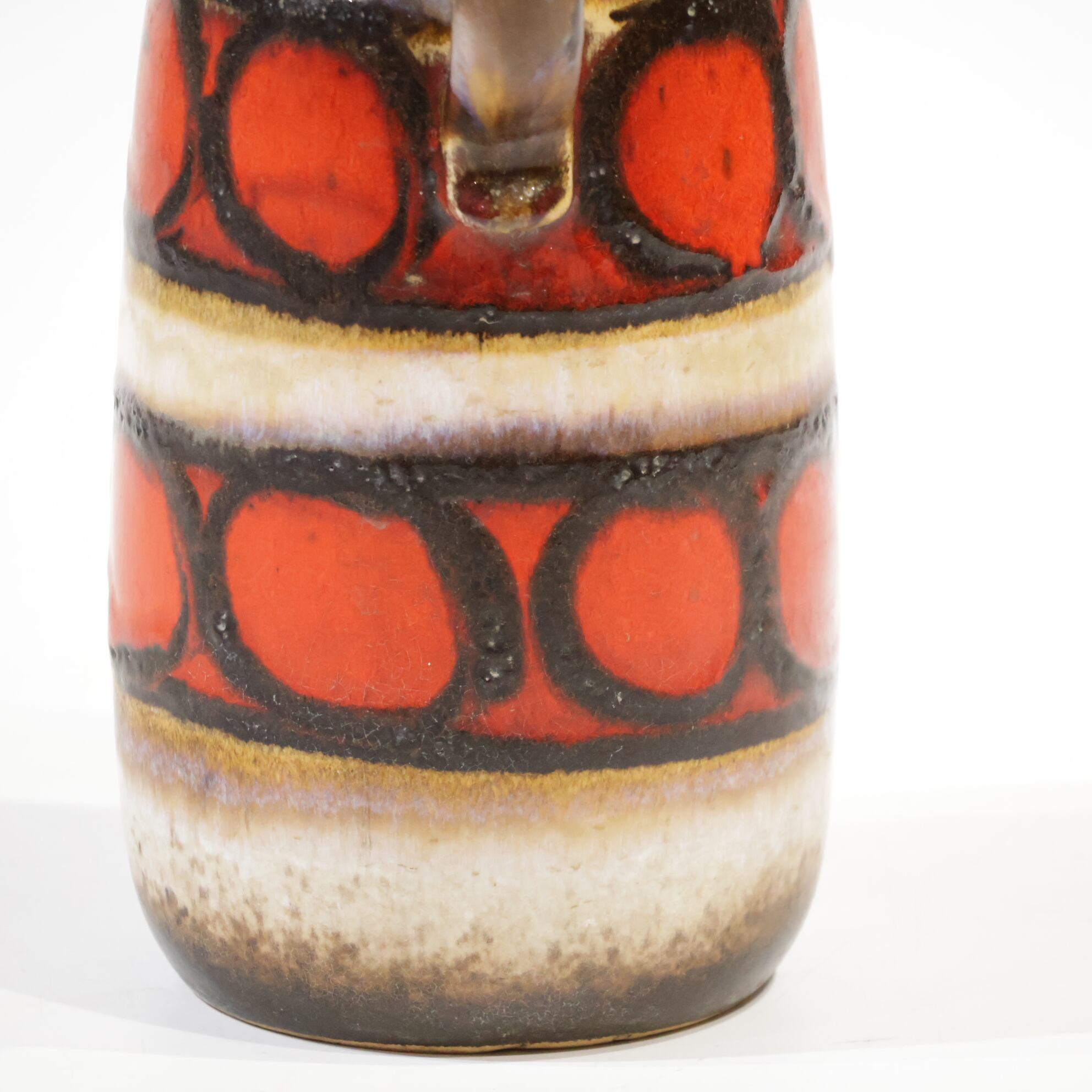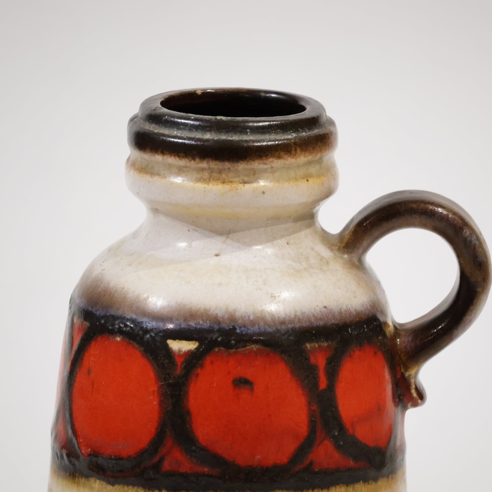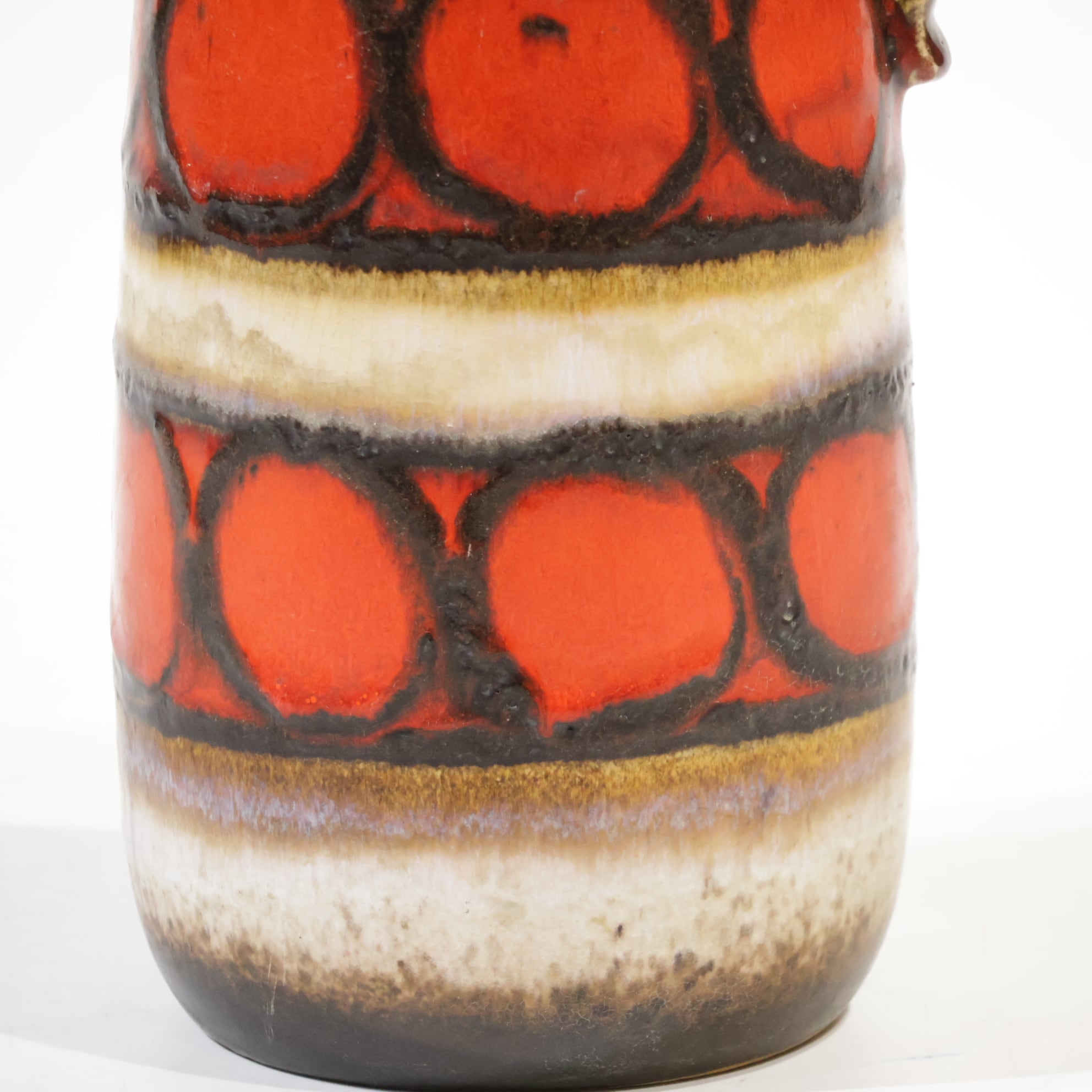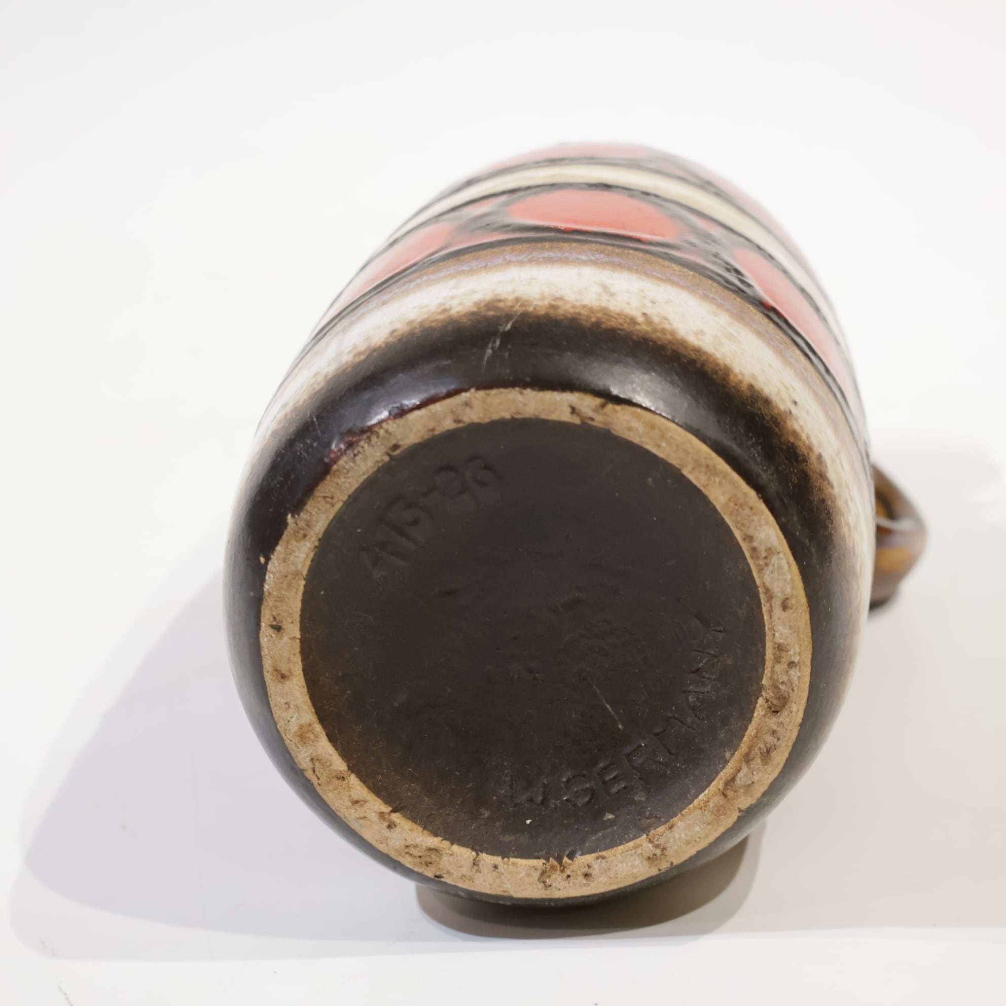 同社は急速に成長し、1950~80年代には陶 器製造の分野でドイツ最大のメーカーとなり、今日も確固たる地位を維持しています。形状に加えて釉薬でも、当時は最も幅広い品揃えを誇った他、輸出量も最大だったため、現在でも同社の製品はよく見られます。特に円筒形を基調にし たシンプルな形状で、型押し模様のある床置き 花瓶が代表的。色彩については当時主流だっ た赤やオレンジから、クリーム、ベージュ、茶色 などが多くを占めています。
