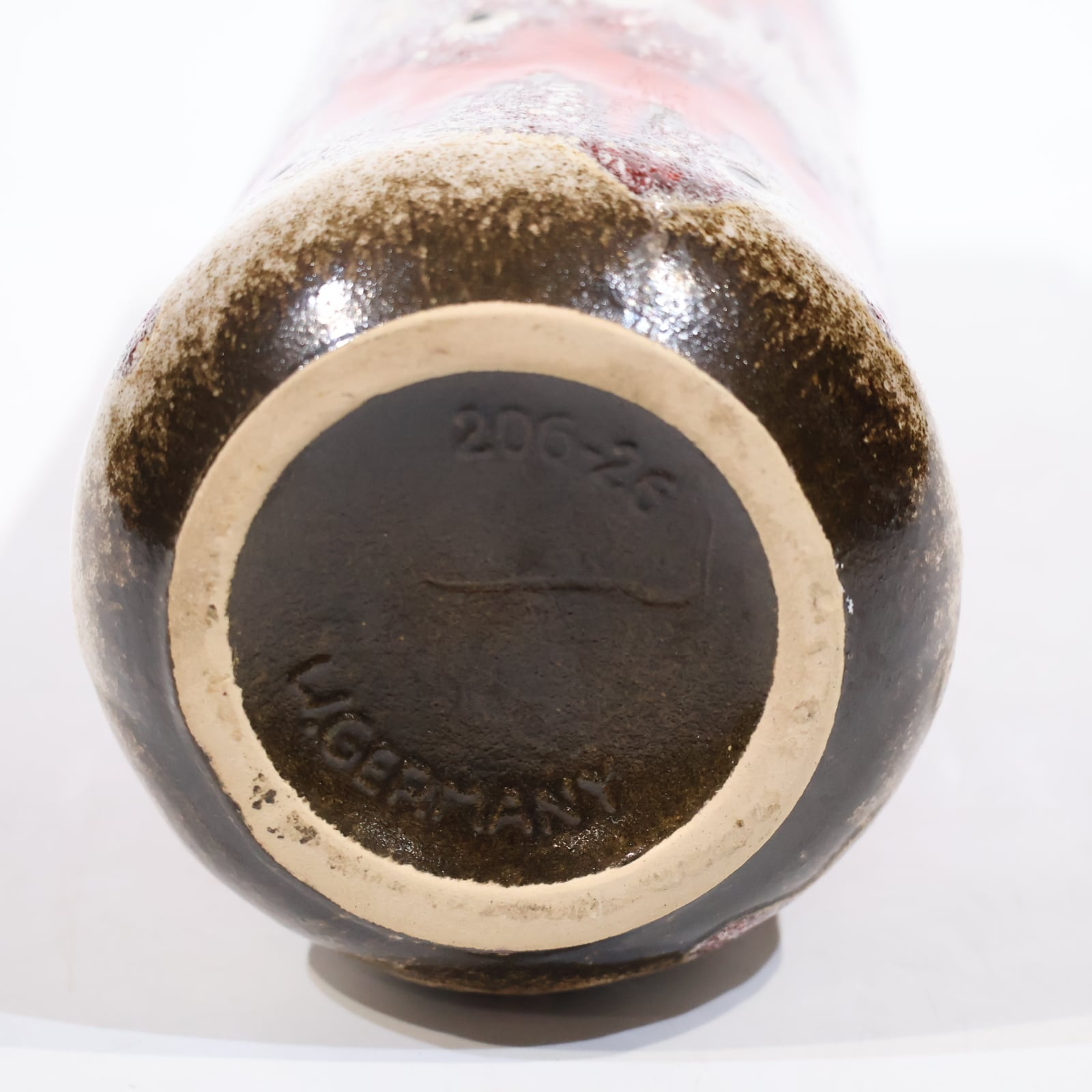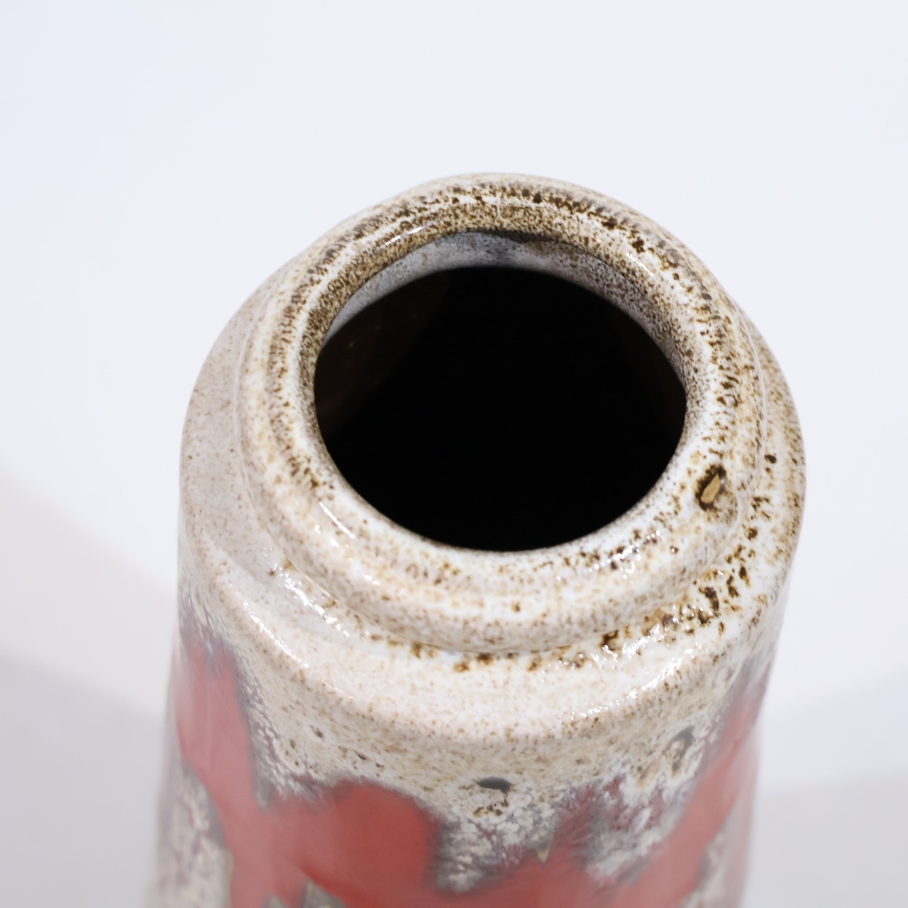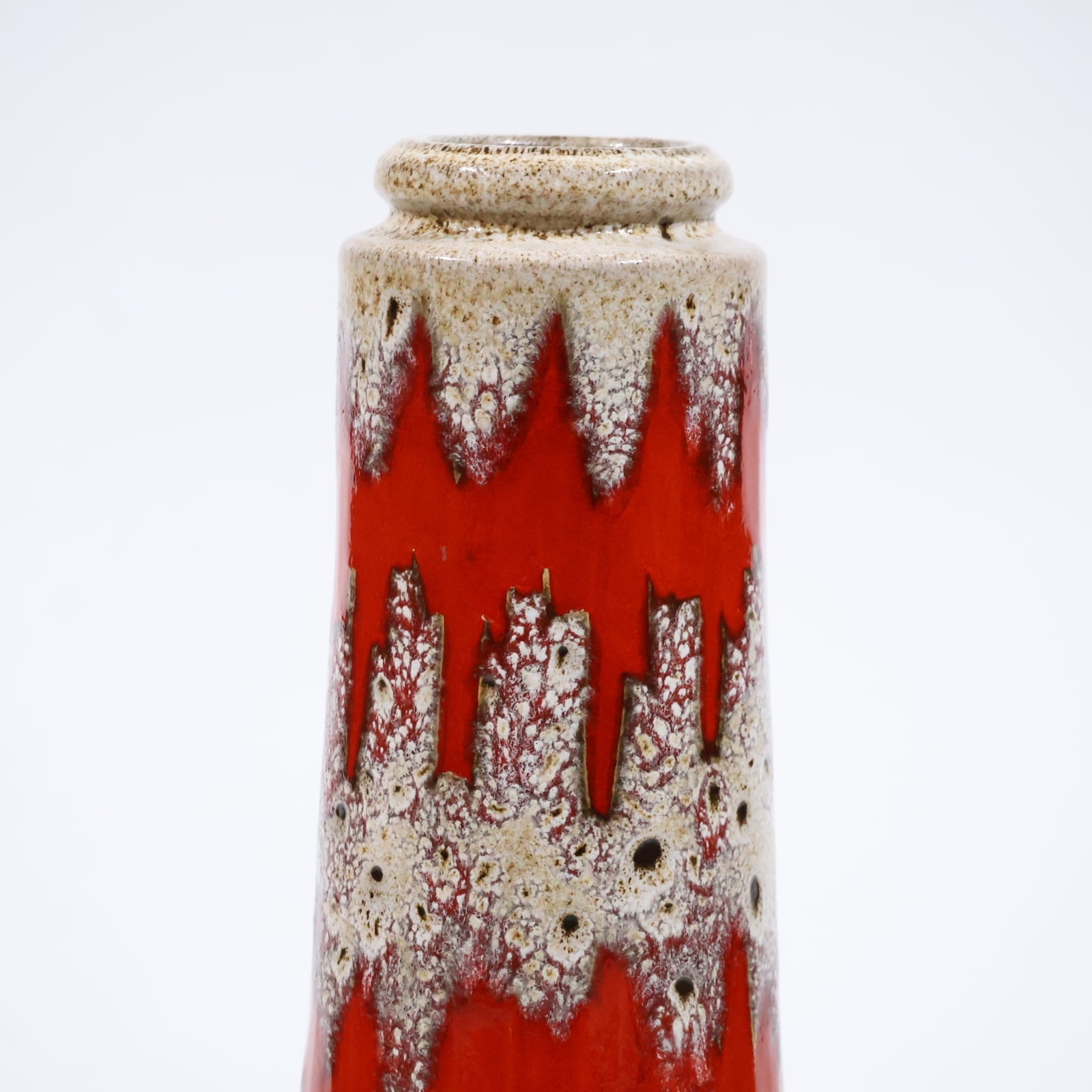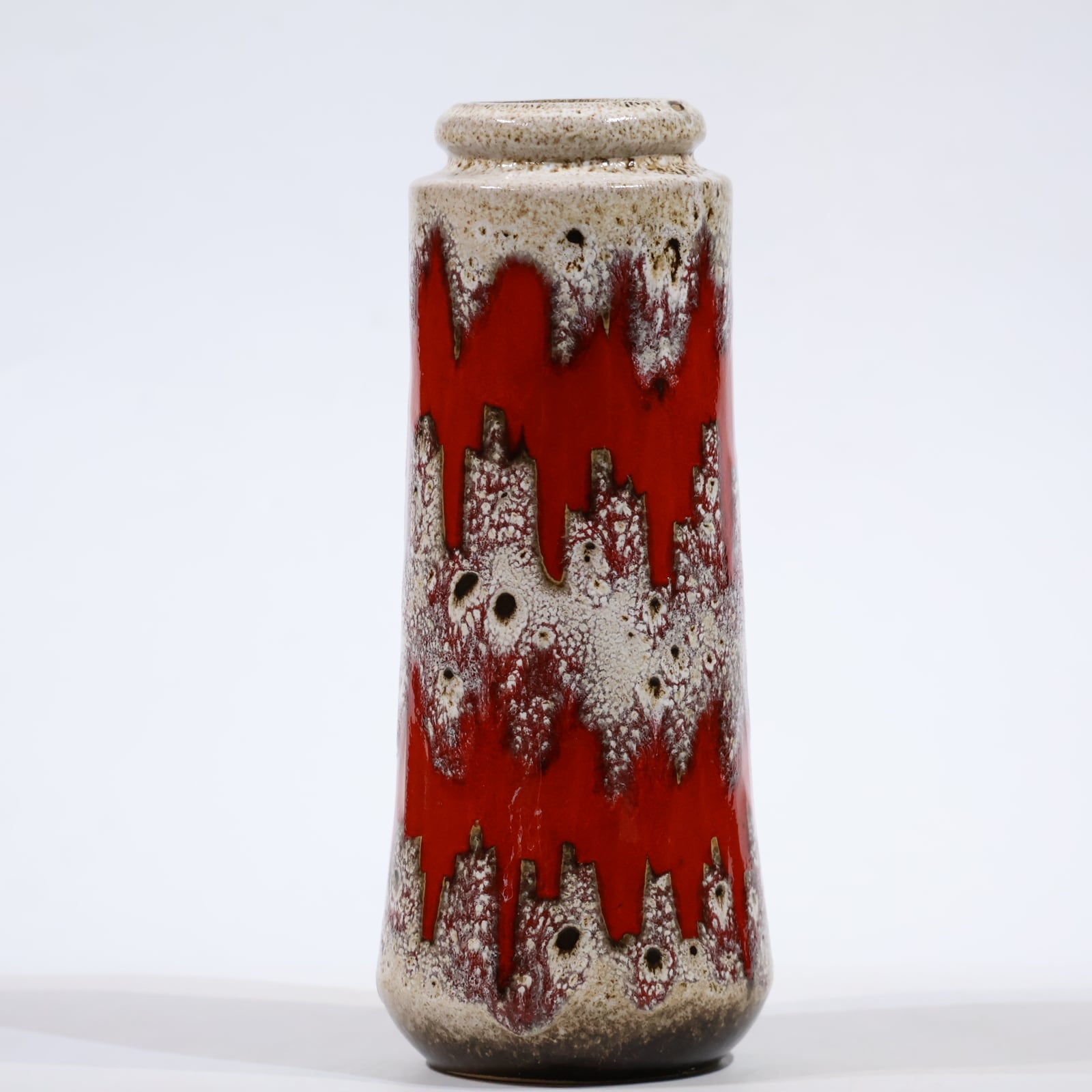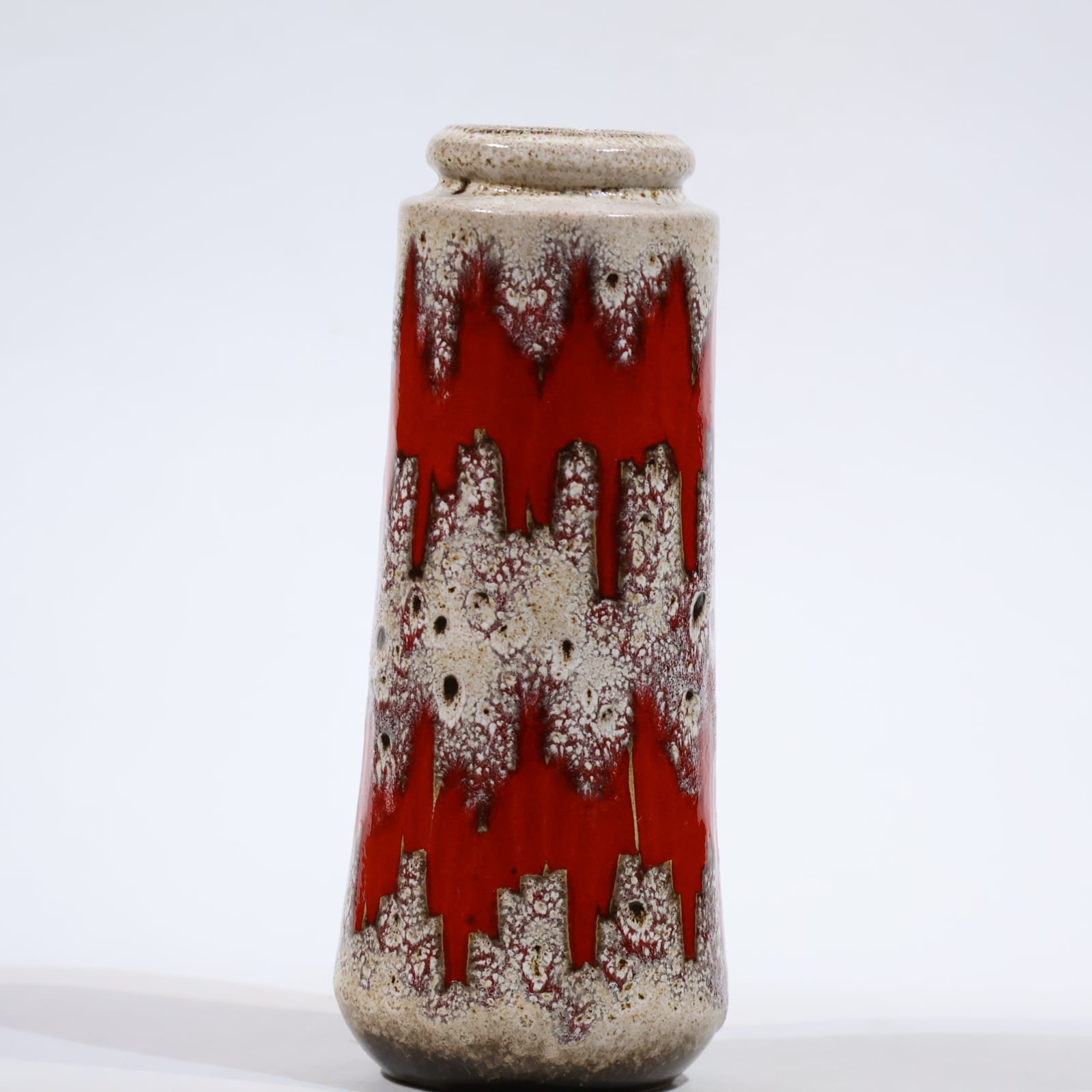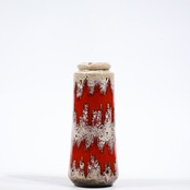 同社は急速に成長し、1950~80年代には陶 器製造の分野でドイツ最大のメーカーとなり、今日も確固たる地位を維持しています。形状に加えて釉薬でも、当時は最も幅広い品揃えを誇った他、輸出量も最大だったため、現在でも同社の製品はよく見られます。特に円筒形を基調にし たシンプルな形状で、型押し模様のある床置き 花瓶が代表的。色彩については当時主流だっ た赤やオレンジから、クリーム、ベージュ、茶色 などが多くを占めています。