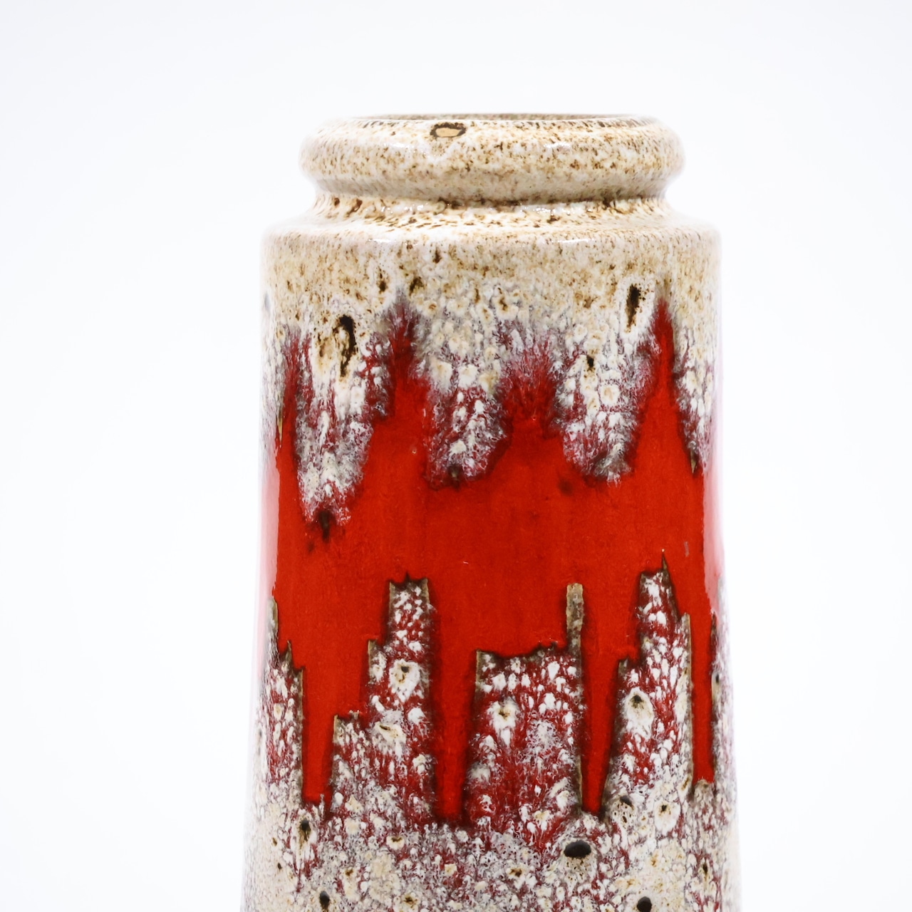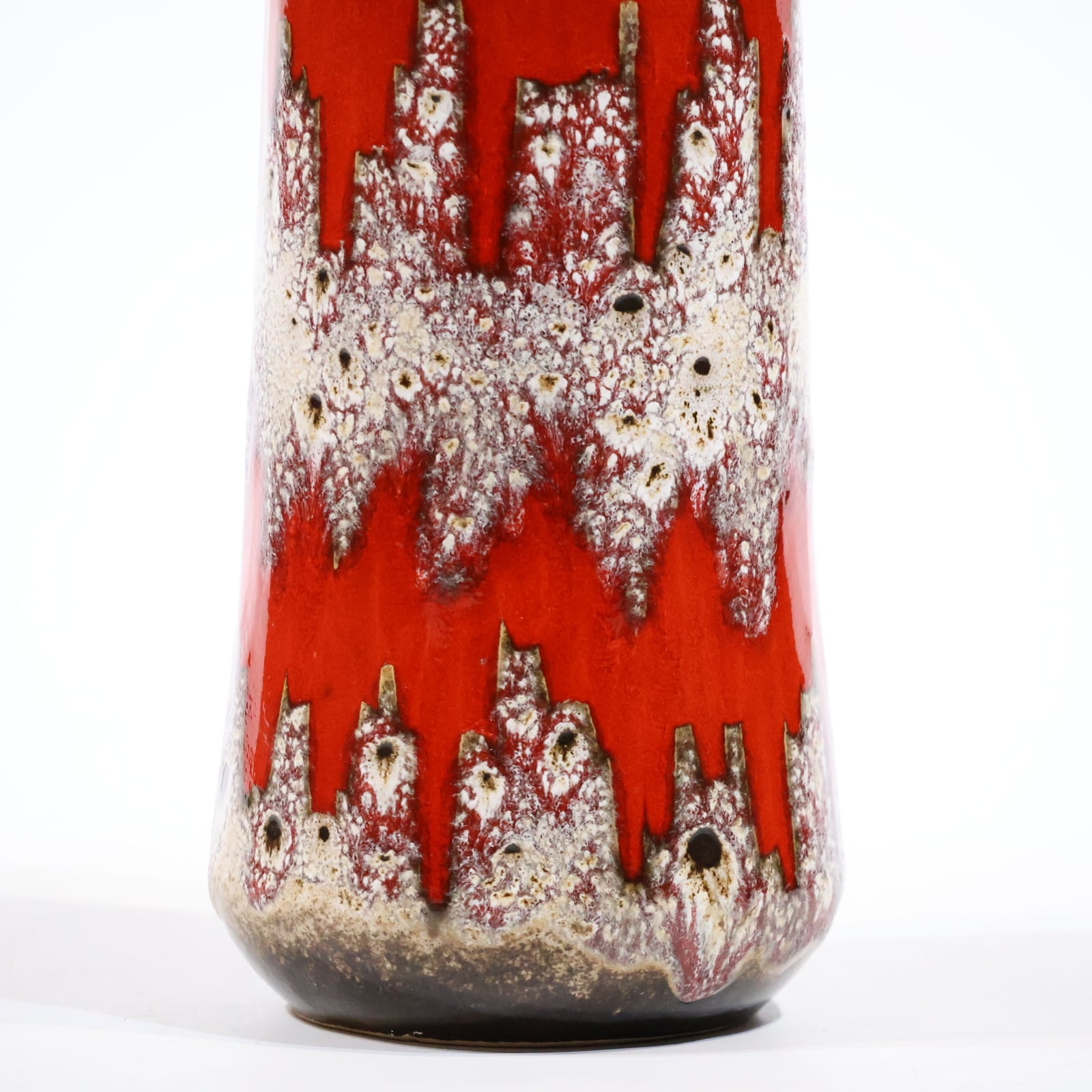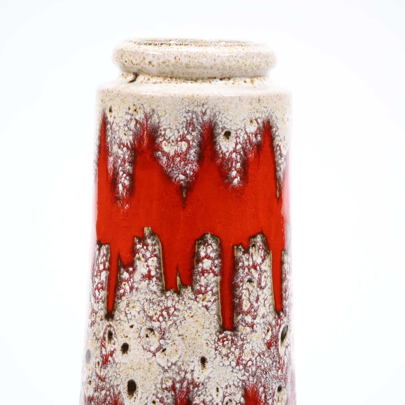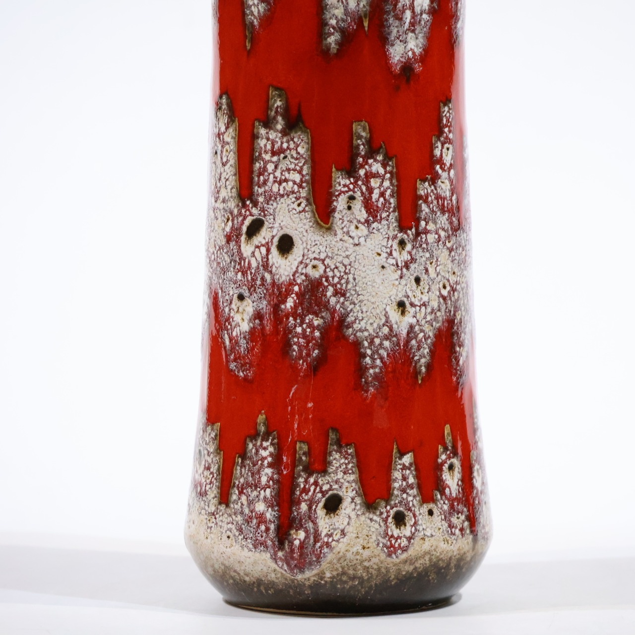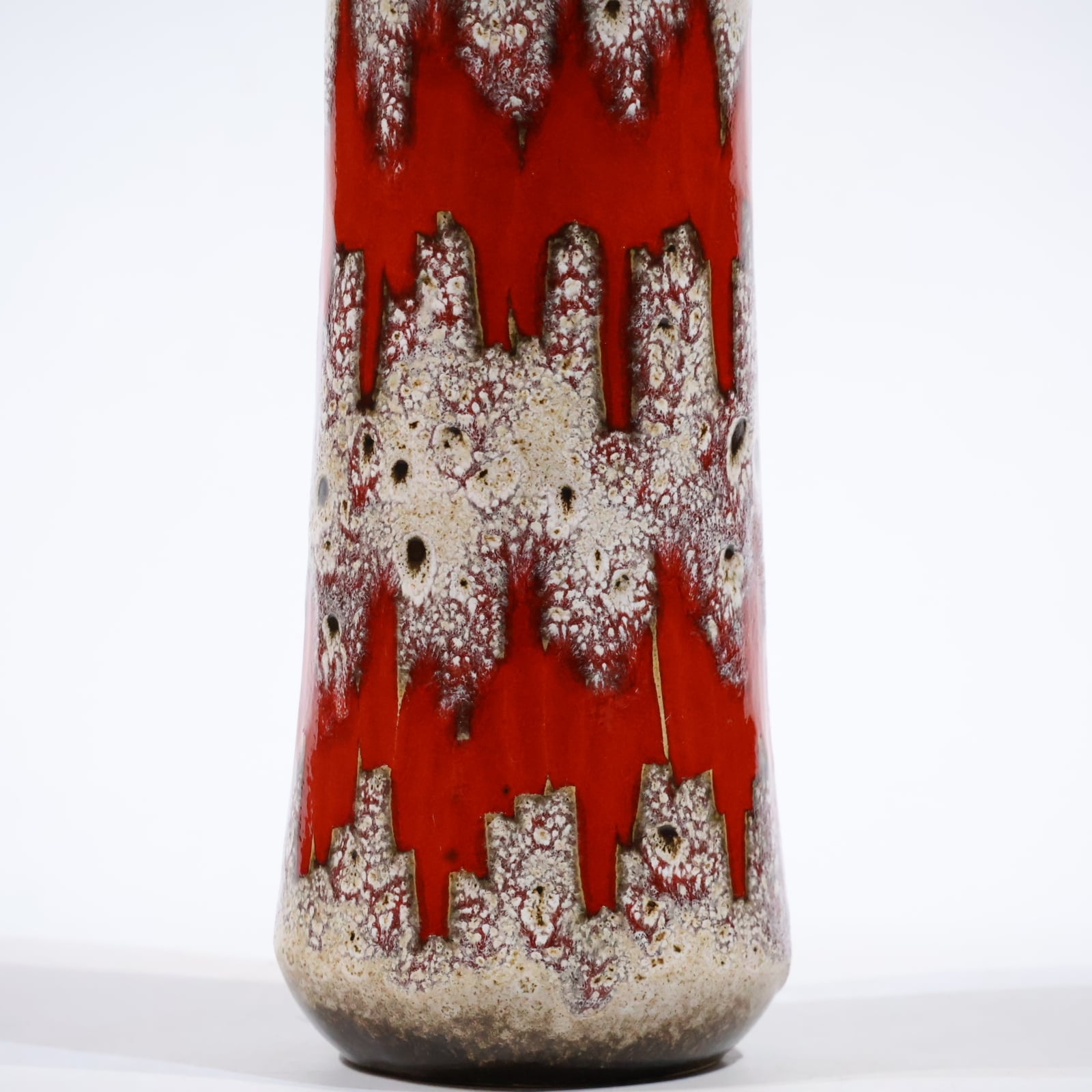 同社は急速に成長し、1950~80年代には陶 器製造の分野でドイツ最大のメーカーとなり、今日も確固たる地位を維持しています。形状に加えて釉薬でも、当時は最も幅広い品揃えを誇った他、輸出量も最大だったため、現在でも同社の製品はよく見られます。特に円筒形を基調にし たシンプルな形状で、型押し模様のある床置き 花瓶が代表的。色彩については当時主流だっ た赤やオレンジから、クリーム、ベージュ、茶色 などが多くを占めています。